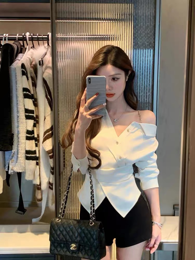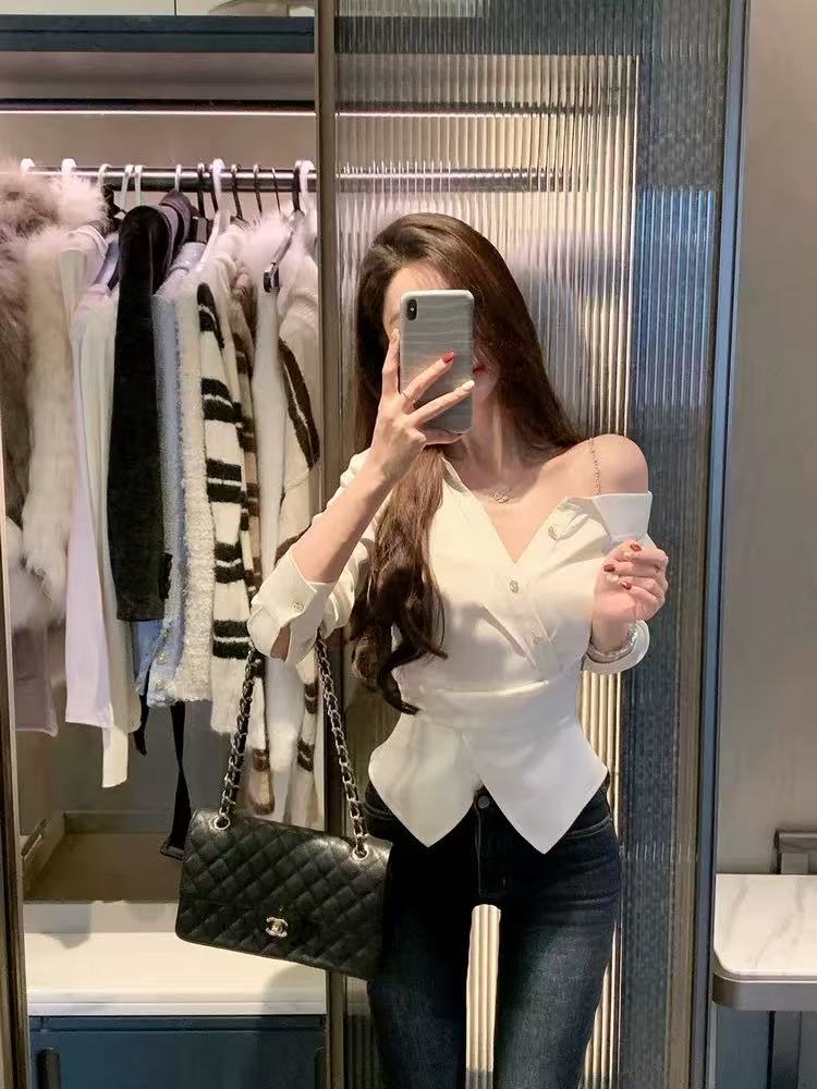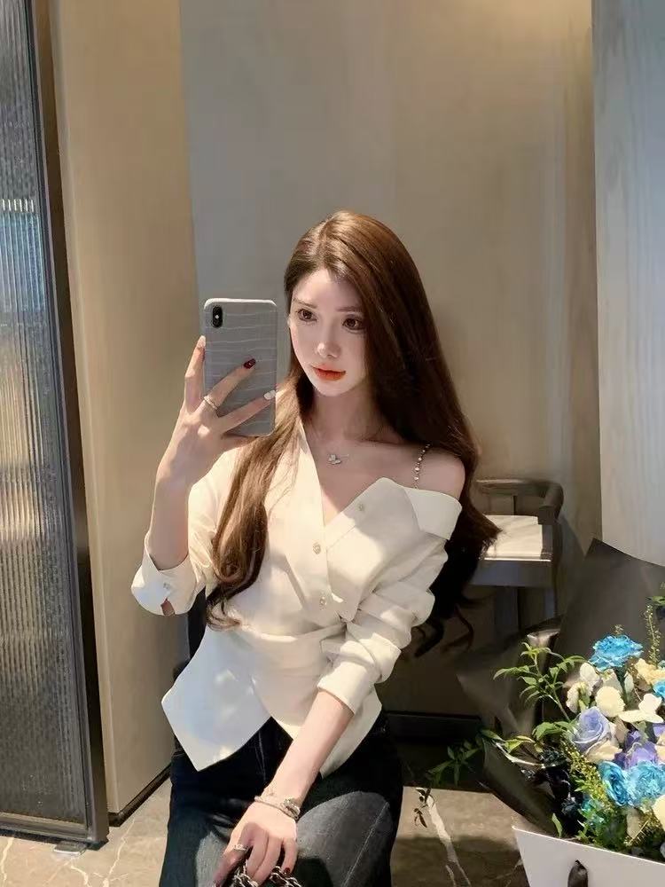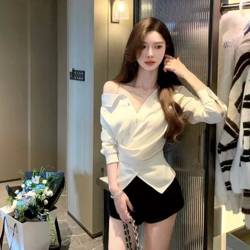 MY15525# 韩系链条吊带白色衬衫上衣女设计感V领露肩长袖收腰衬衣女裝貨源服裝批發