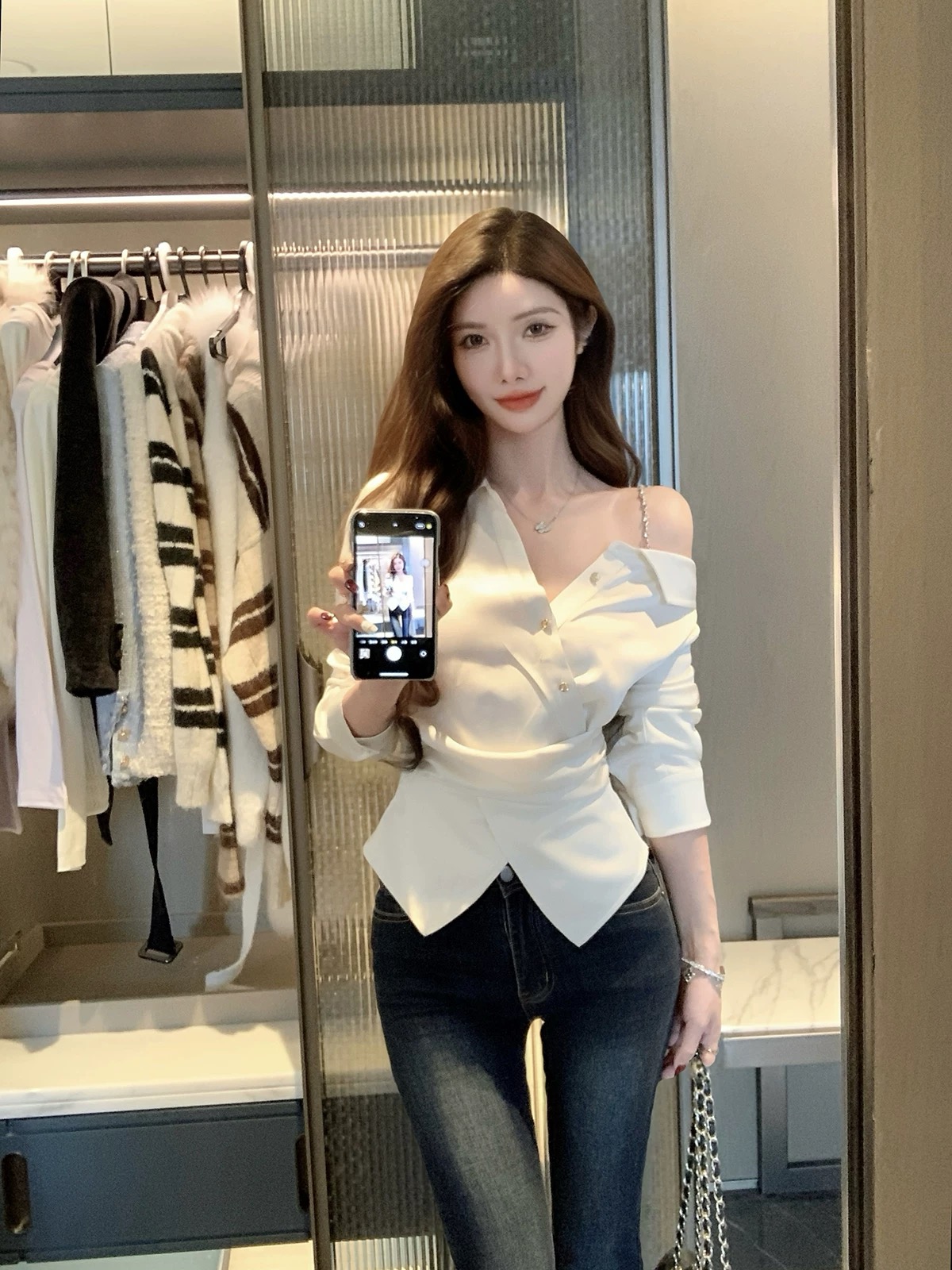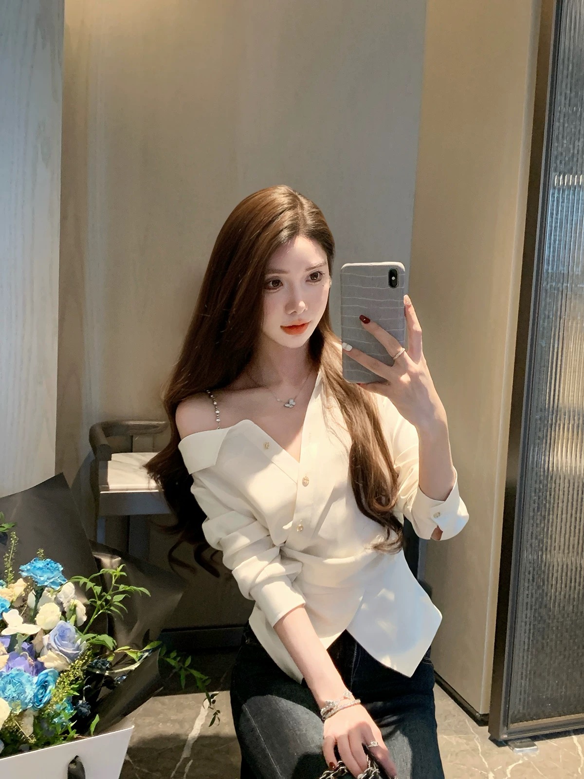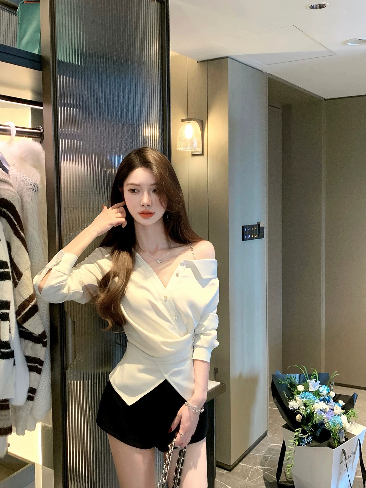 MY15525# 韩系链条吊带白色衬衫上衣女设计感V领露肩长袖收腰衬衣女裝貨源服裝批發