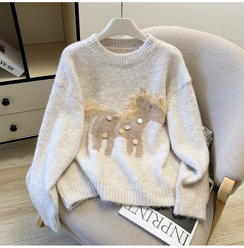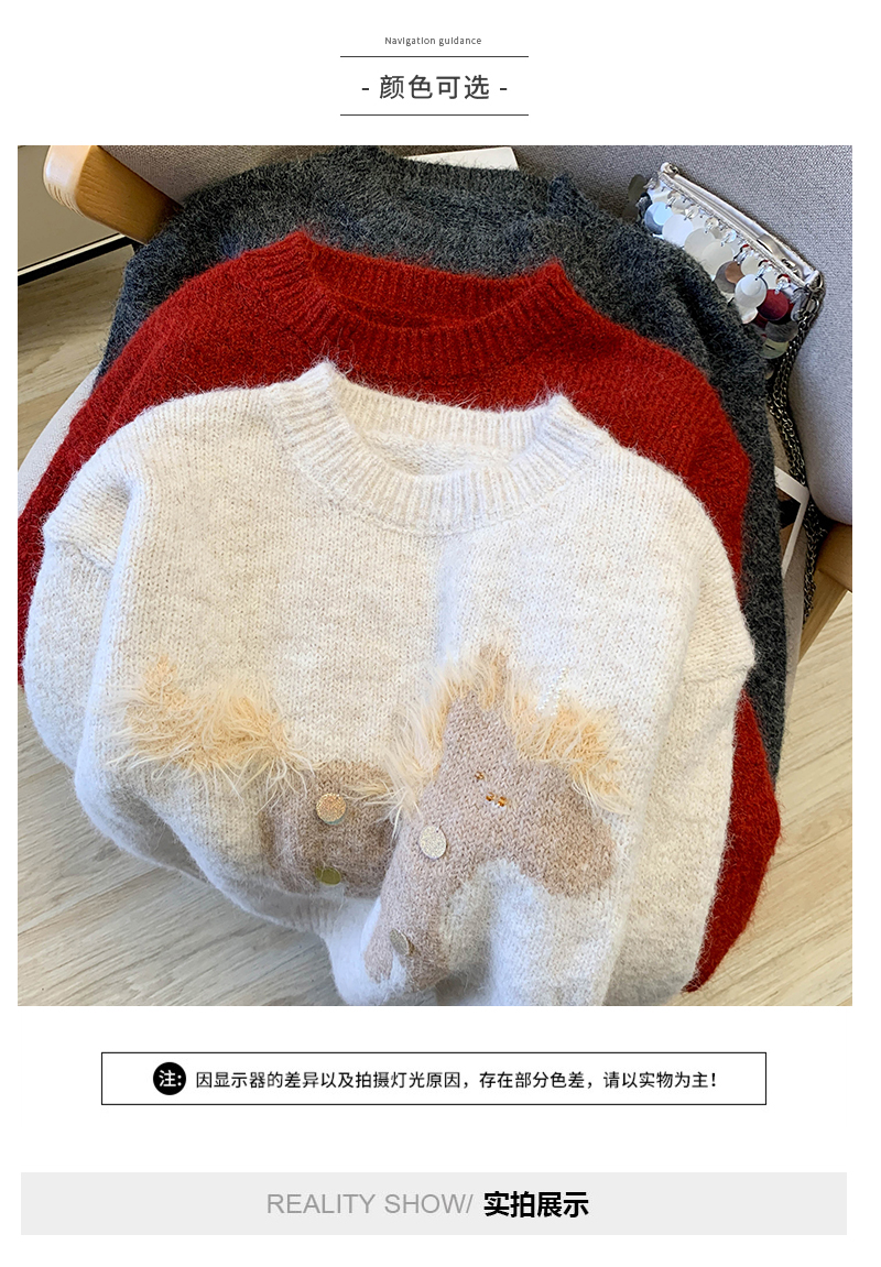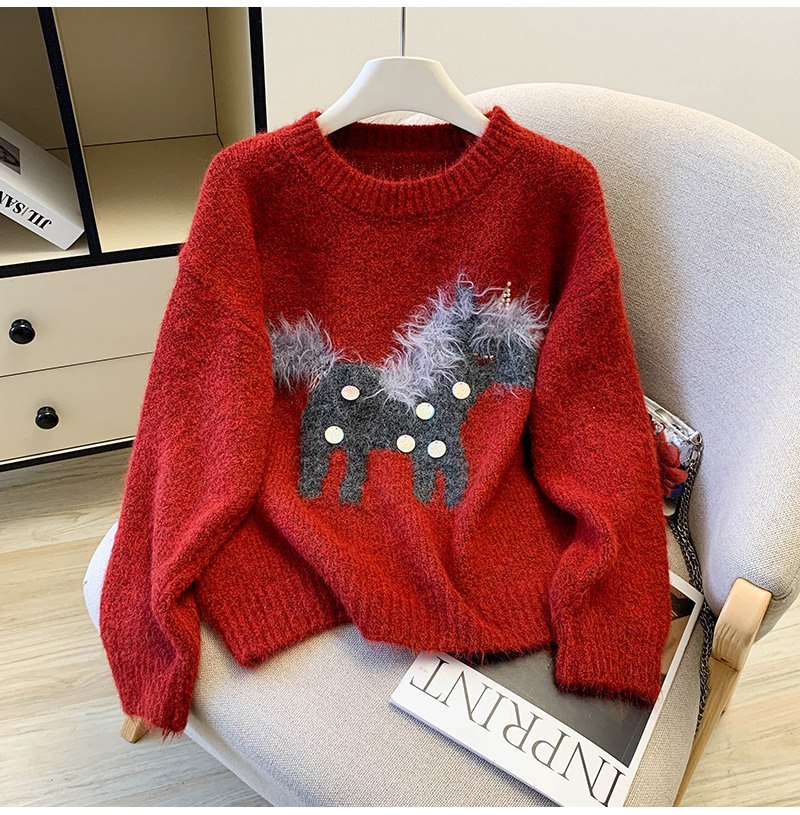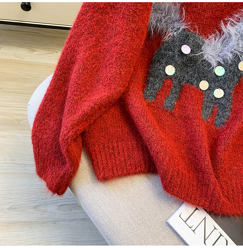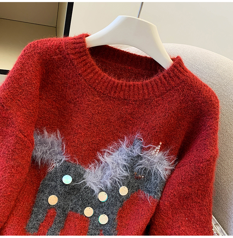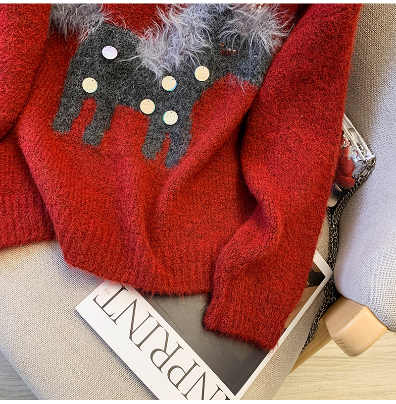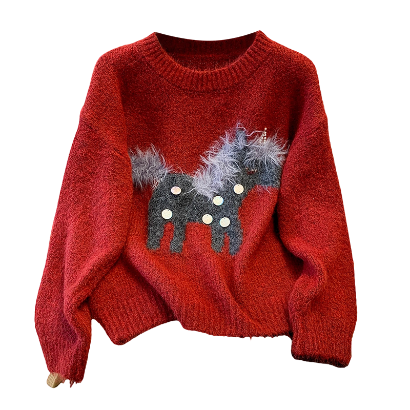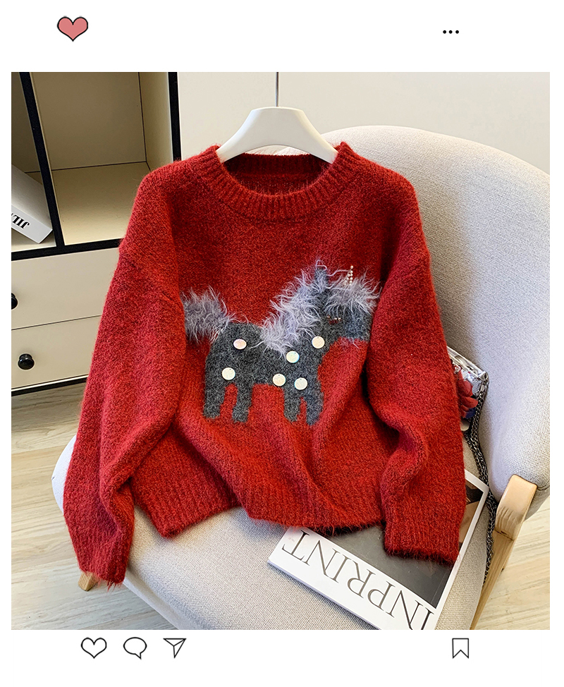 MY15529# INGCON圣诞小马 新年毛衣粗支缎染亮片苏利羊驼毛显瘦针织衫女冬女裝貨源服裝批發