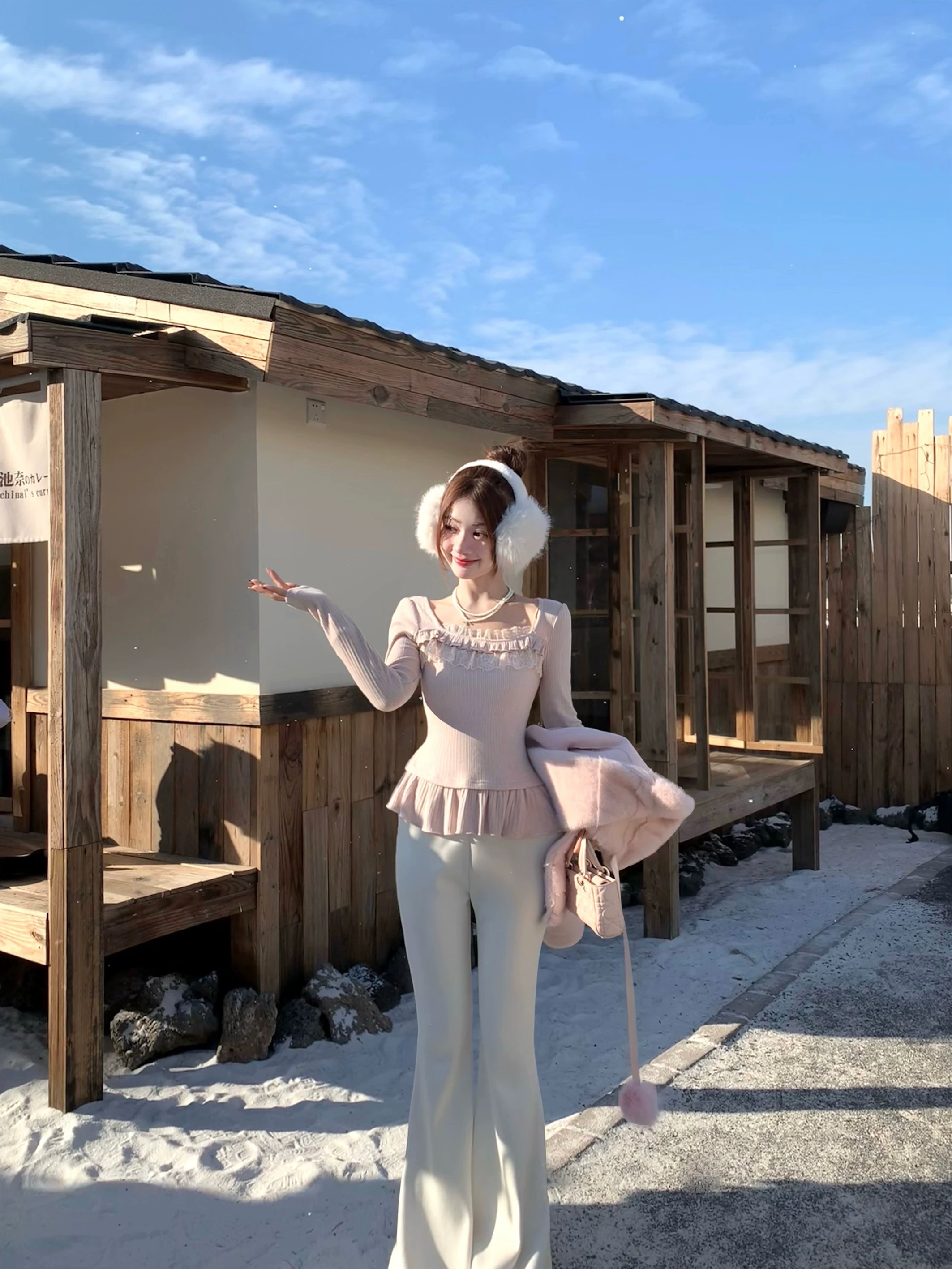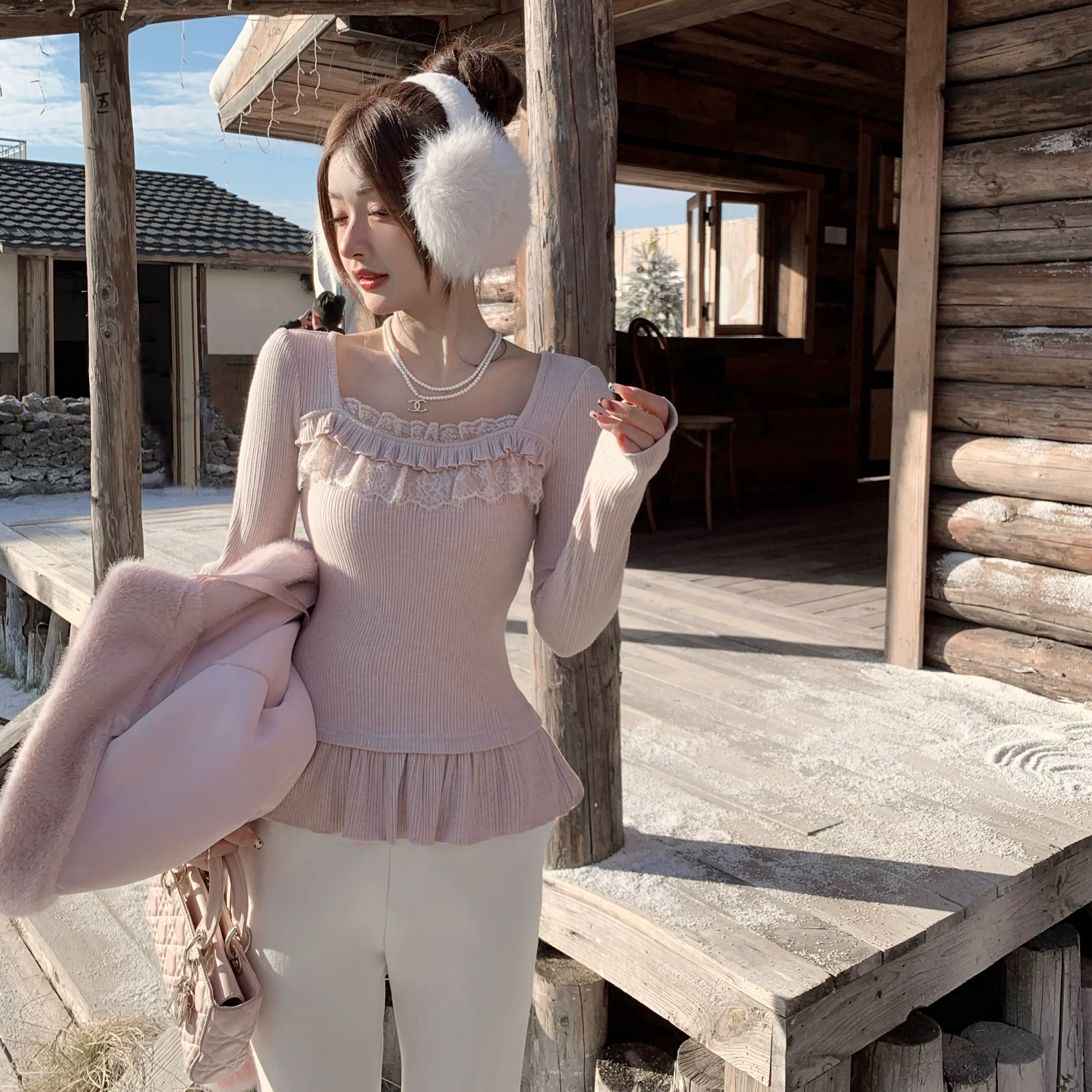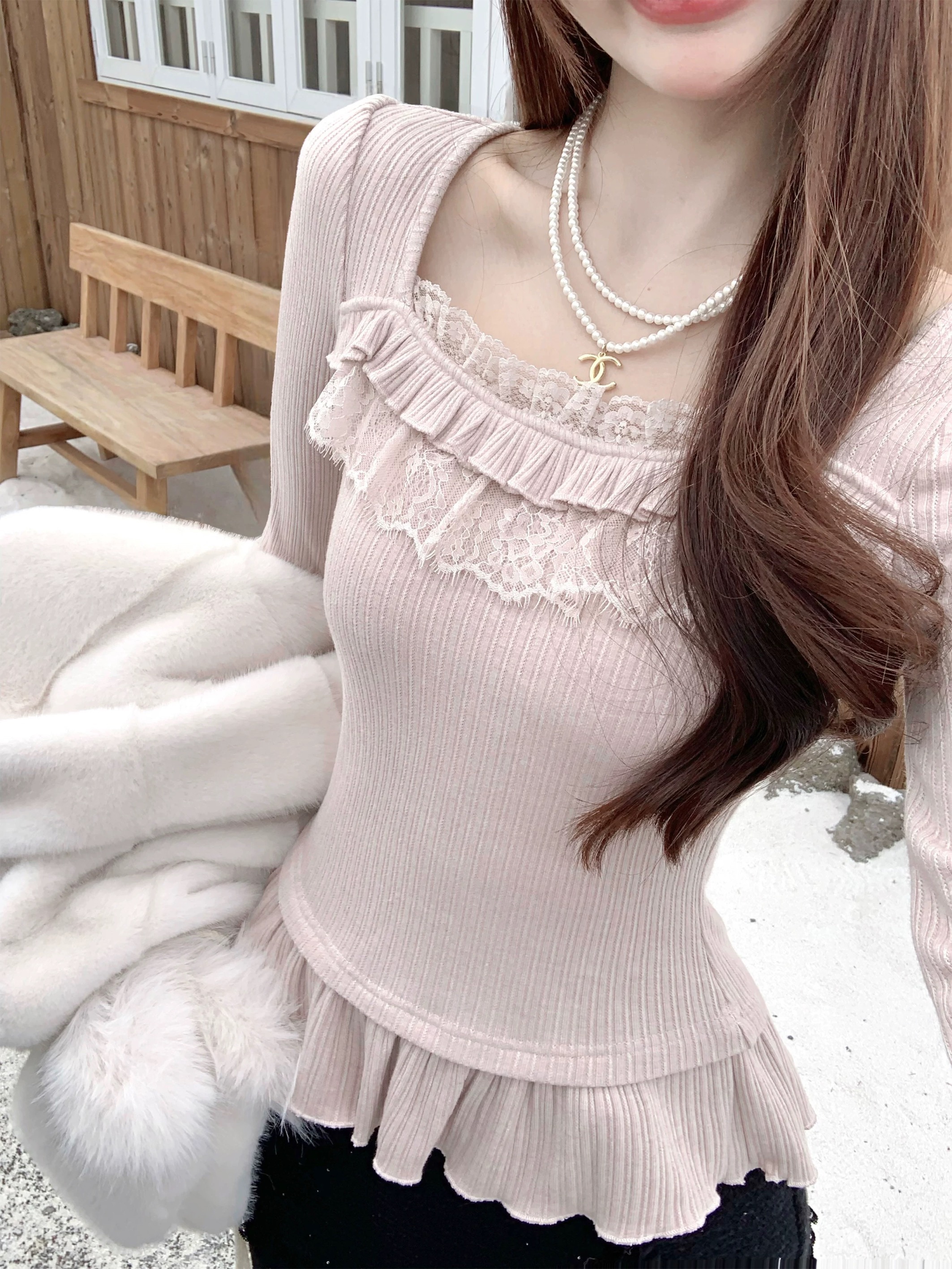 MY15542# 甜慕斯/甜美千金蕾丝花边拼接粉色内搭针织上衣女裝貨源服裝批發
