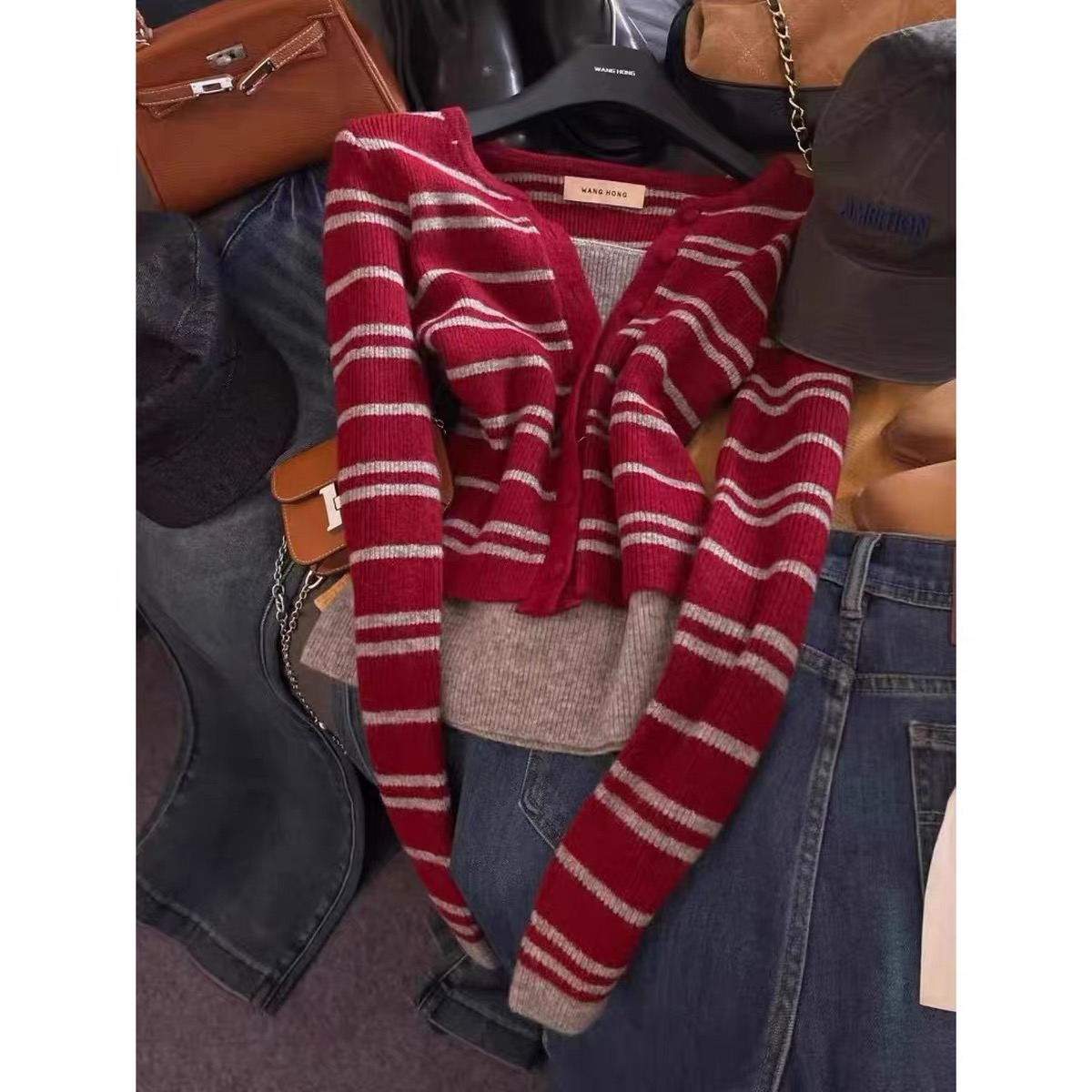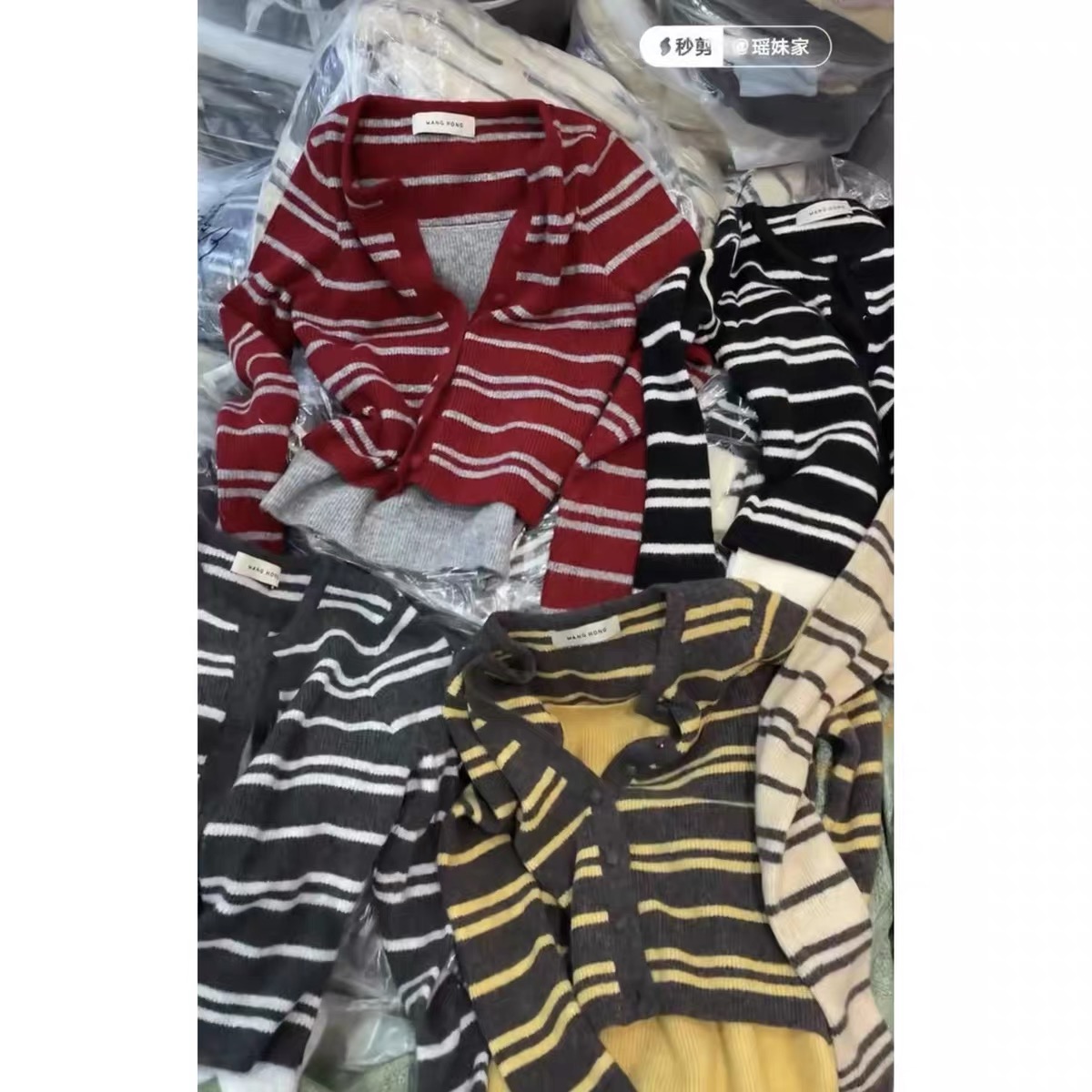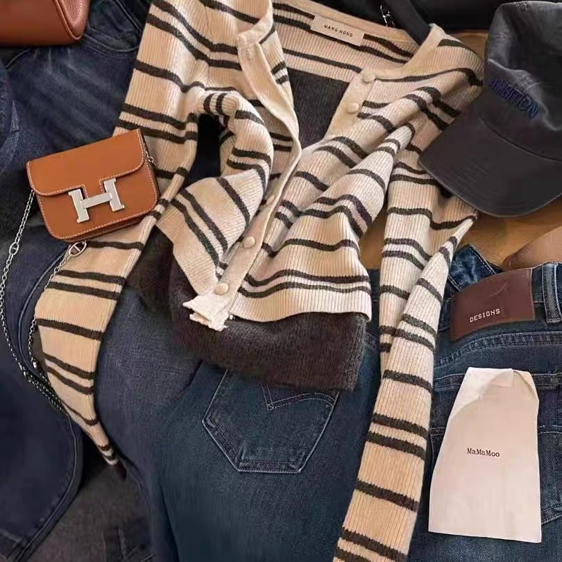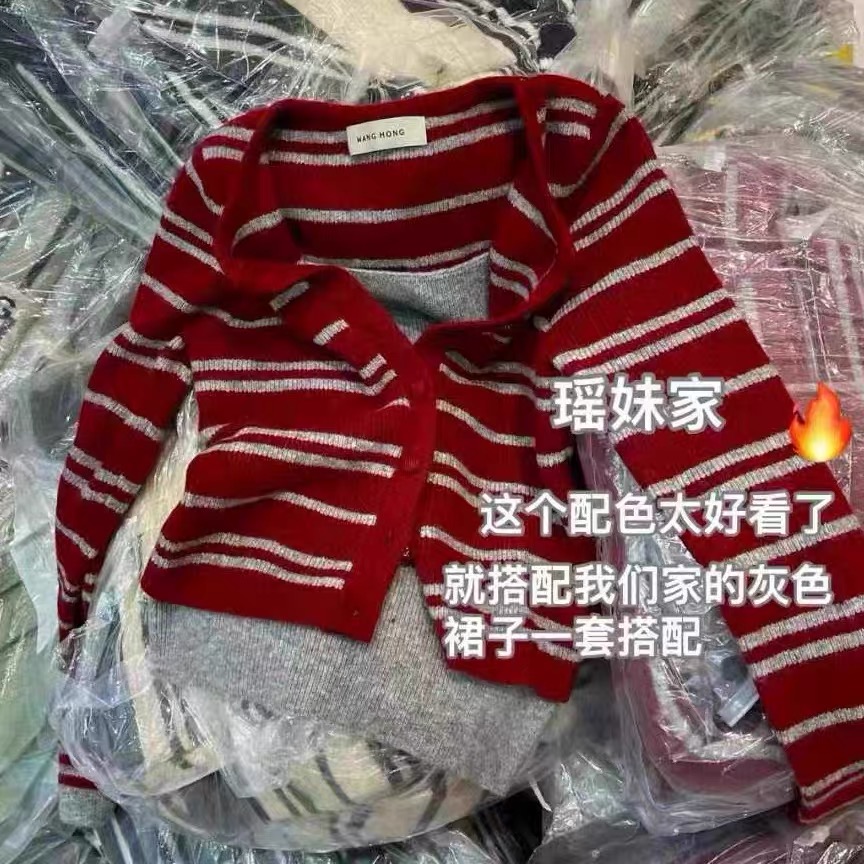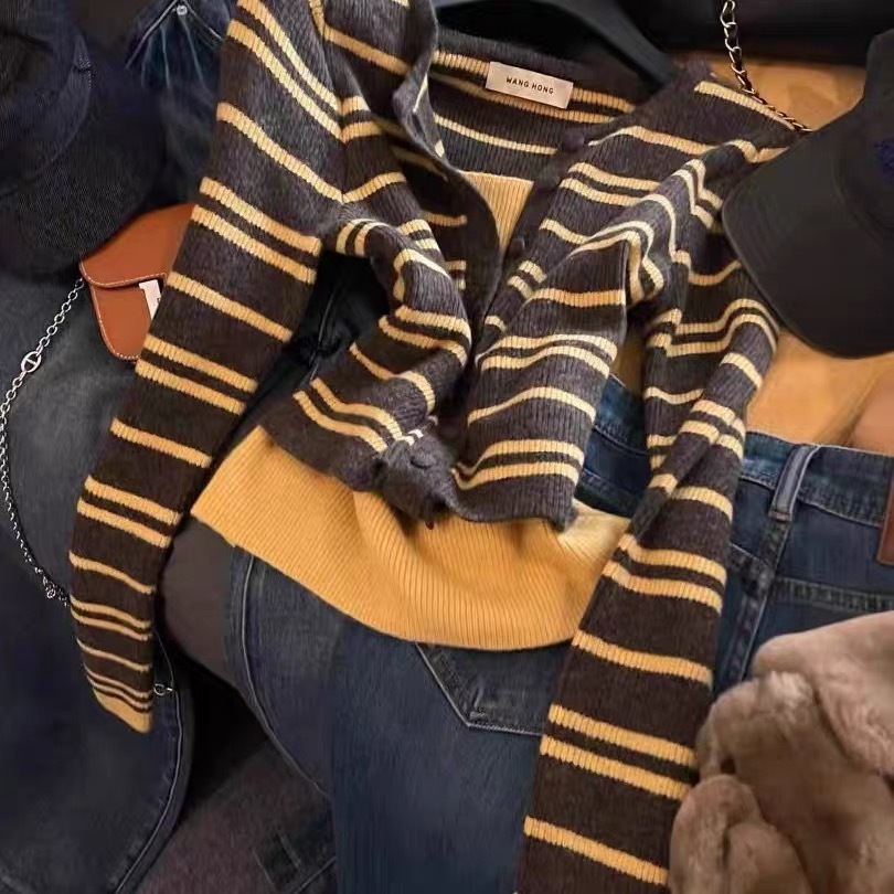MY15546# 设计感单排扣条纹针织衫新款韩版假两件气质修身显瘦百搭上衣女裝貨源服裝批發