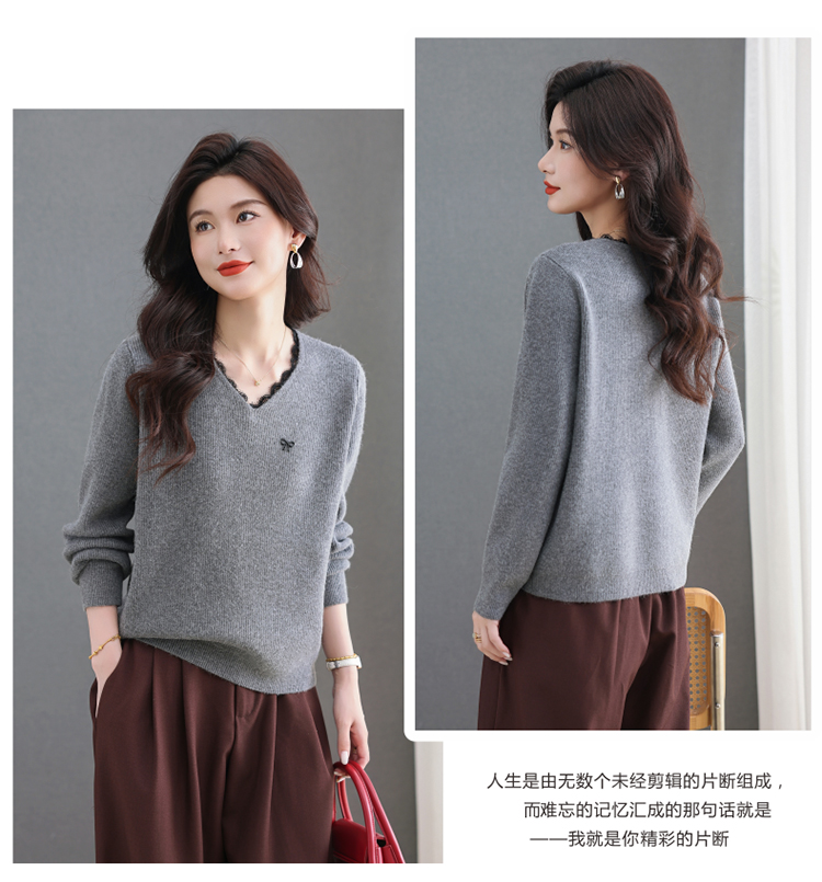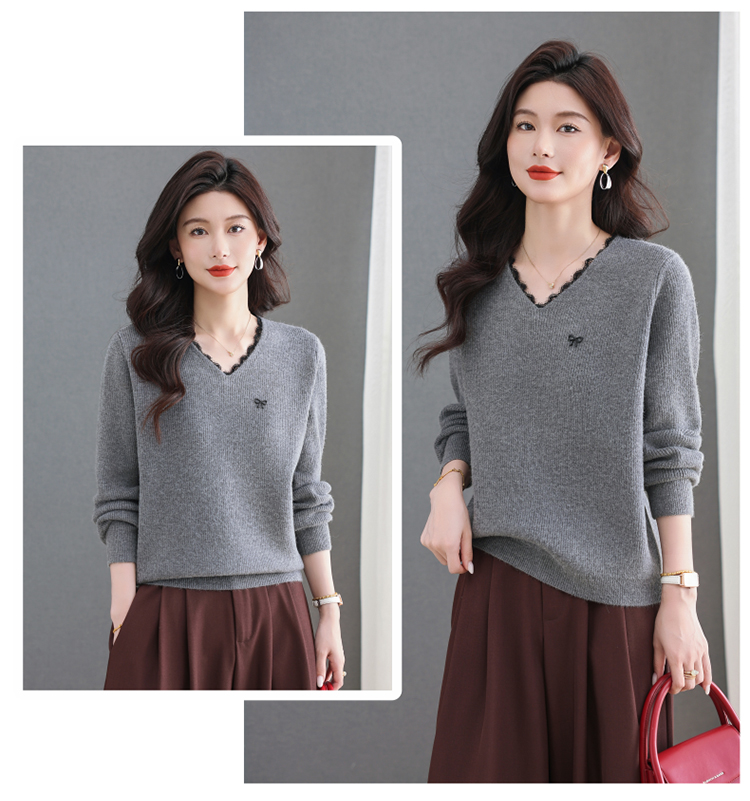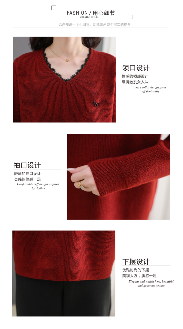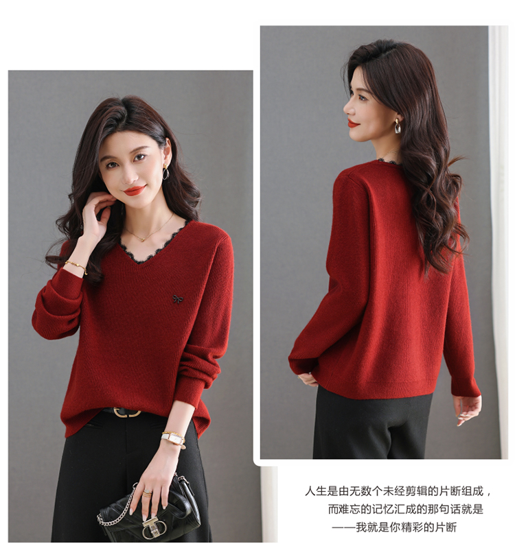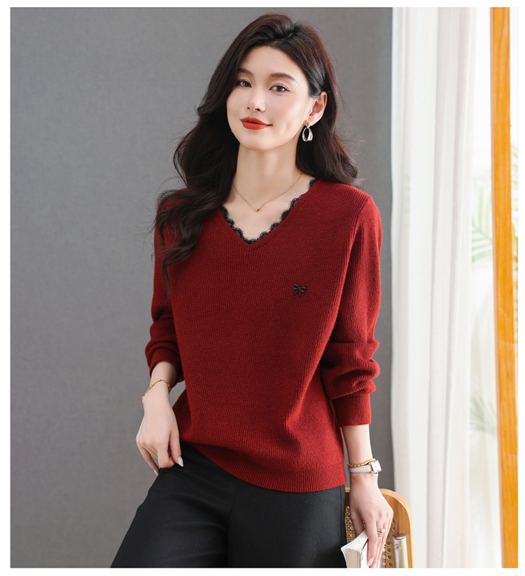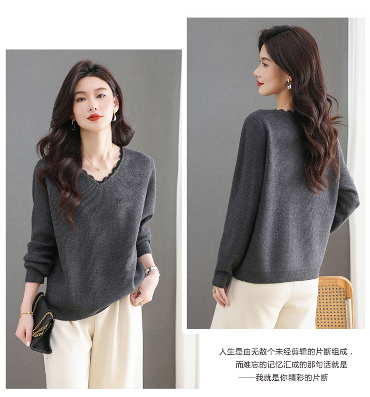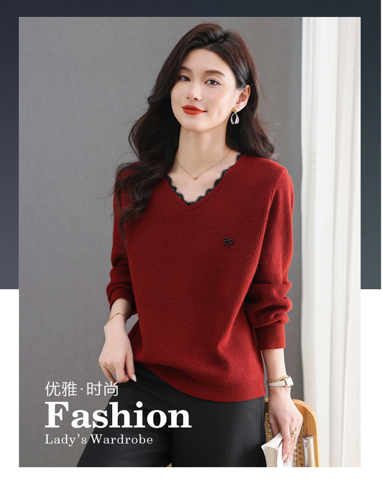 MY15553# V领蕾丝边毛衣新款大码宽松洋气妈妈羊毛针织打底上衣女裝貨源服裝批發