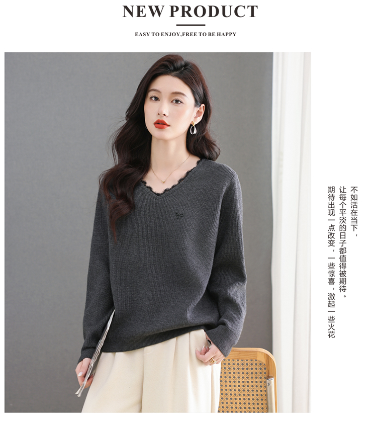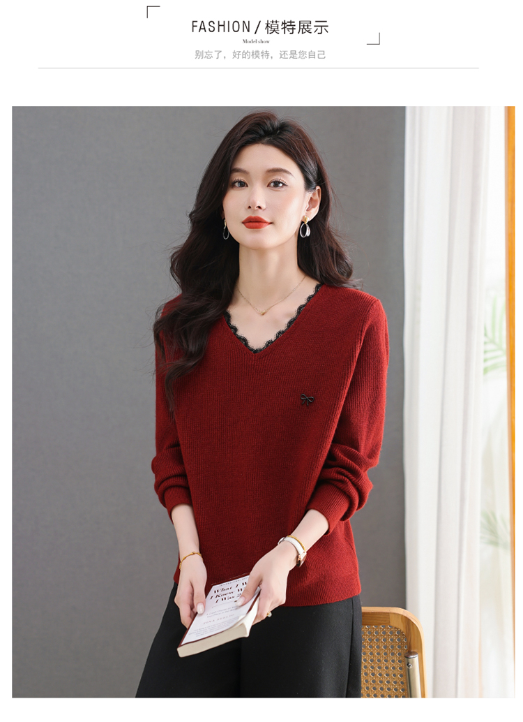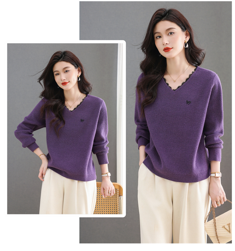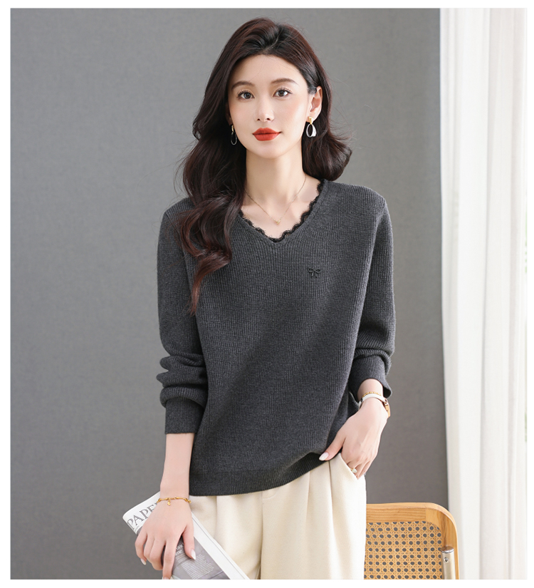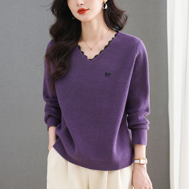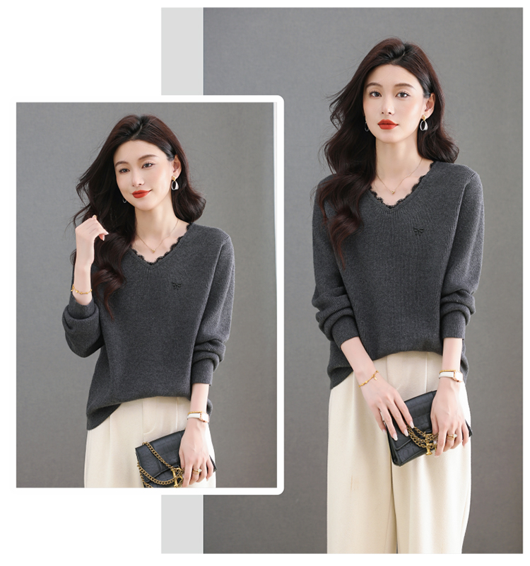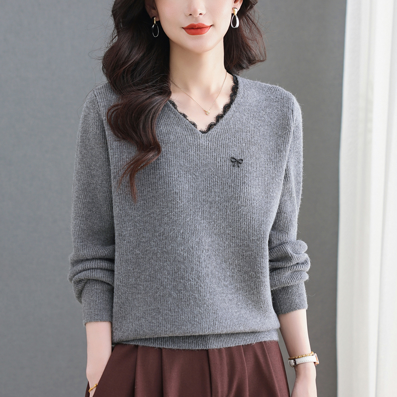 MY15553# V领蕾丝边毛衣新款大码宽松洋气妈妈羊毛针织打底上衣女裝貨源服裝批發