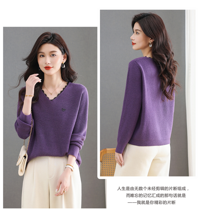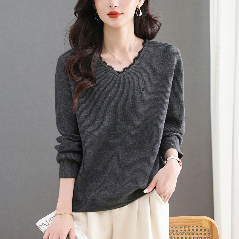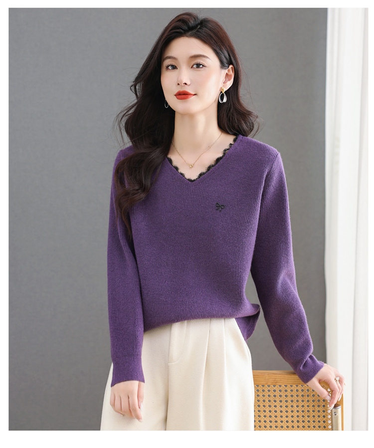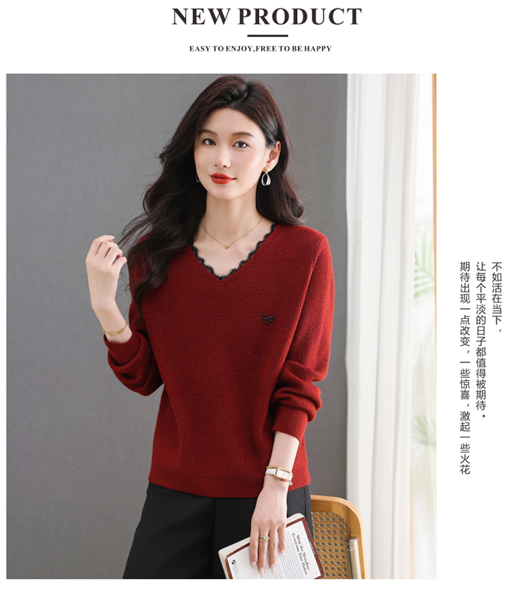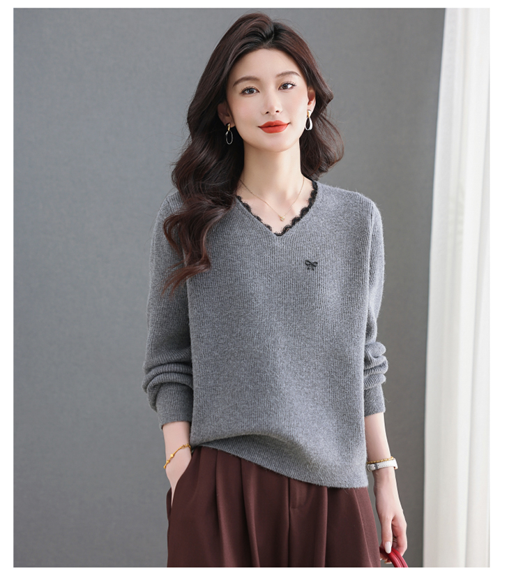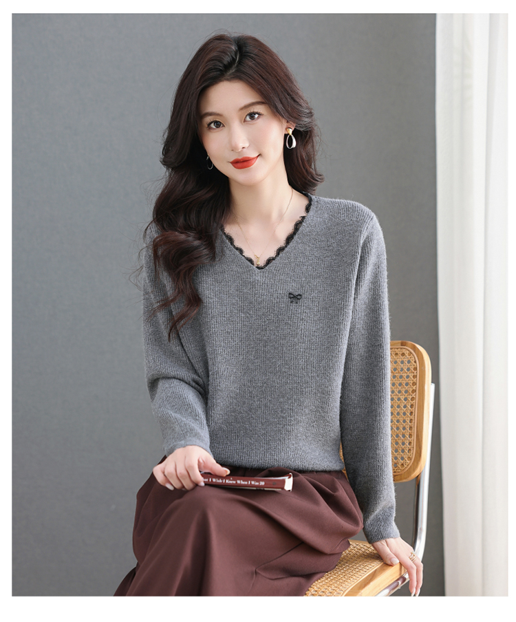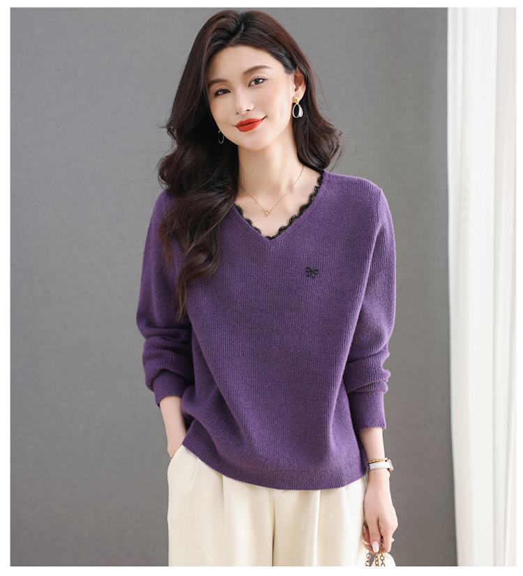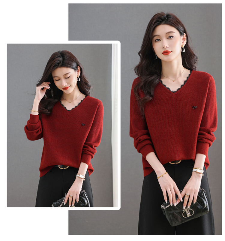 MY15553# V领蕾丝边毛衣新款大码宽松洋气妈妈羊毛针织打底上衣女裝貨源服裝批發