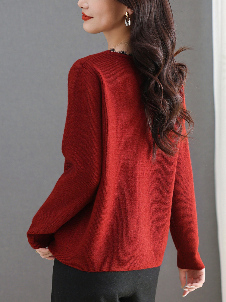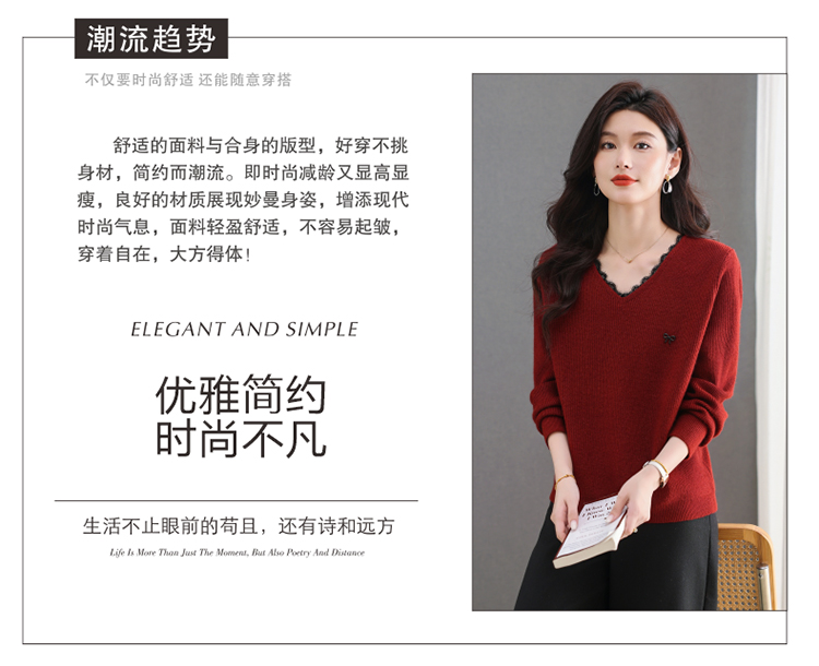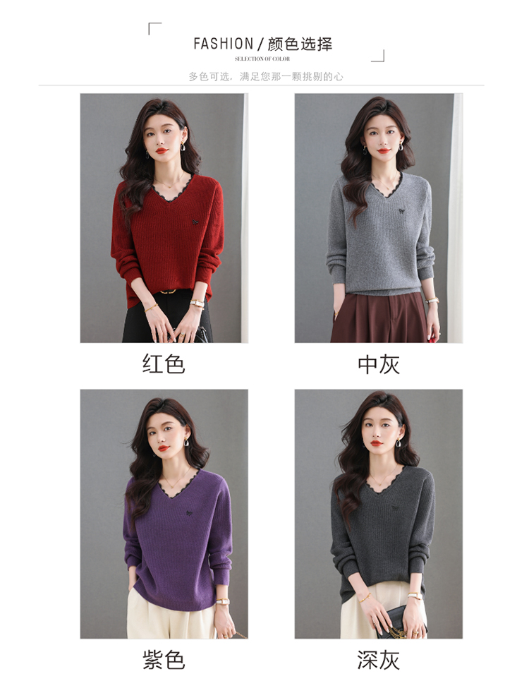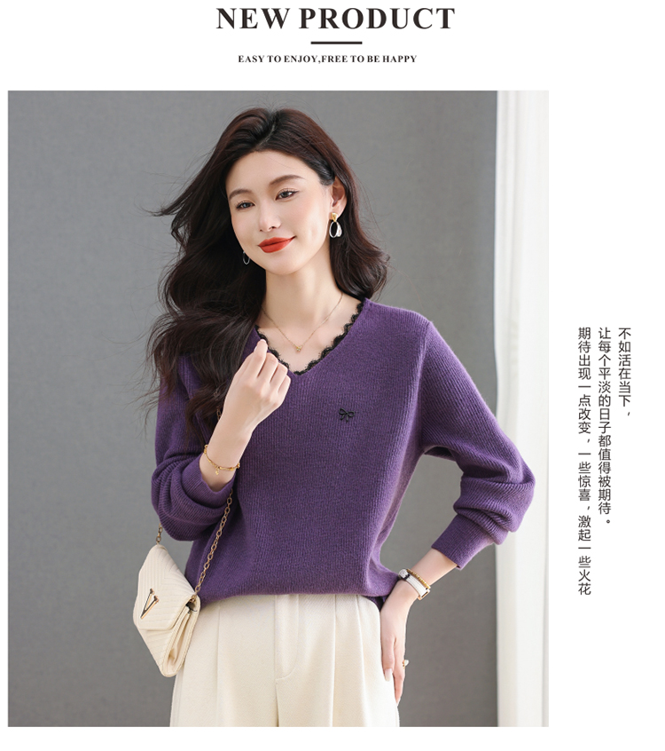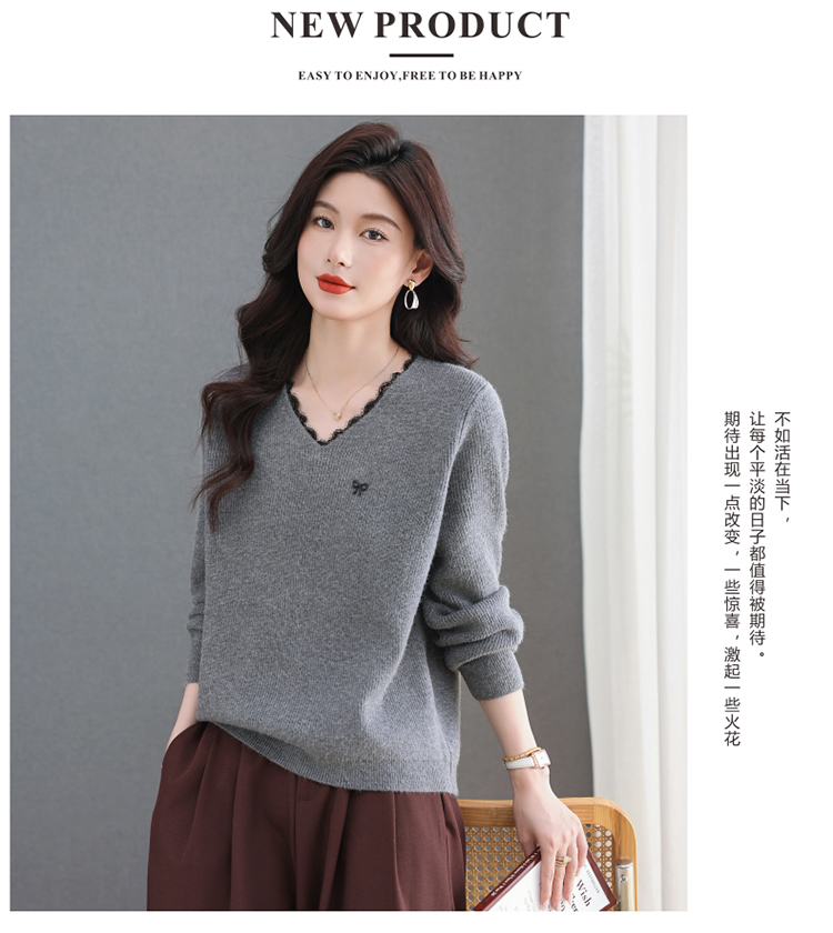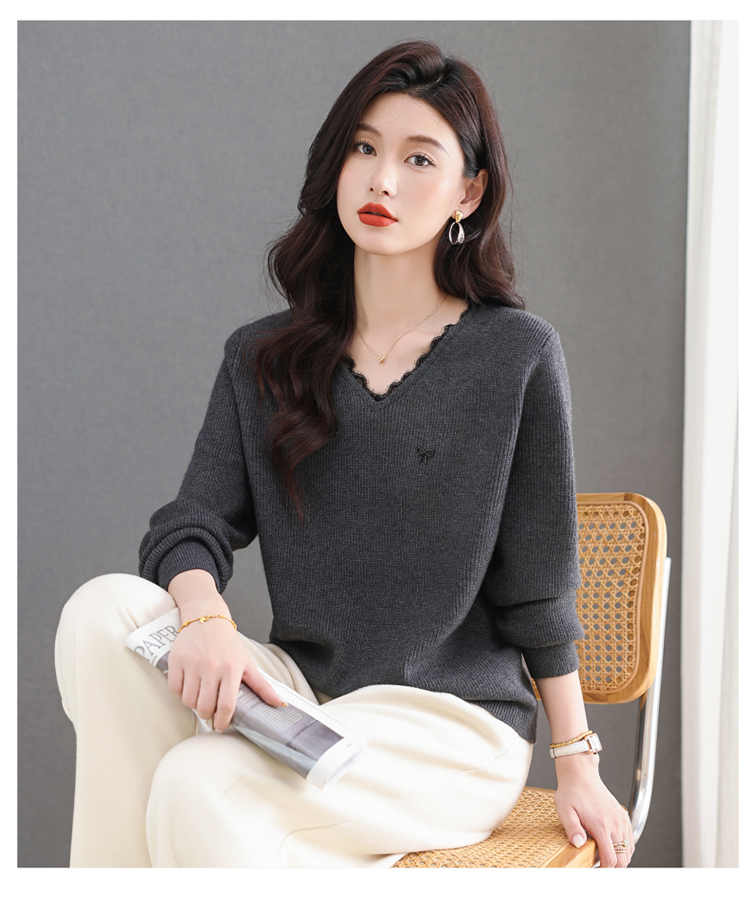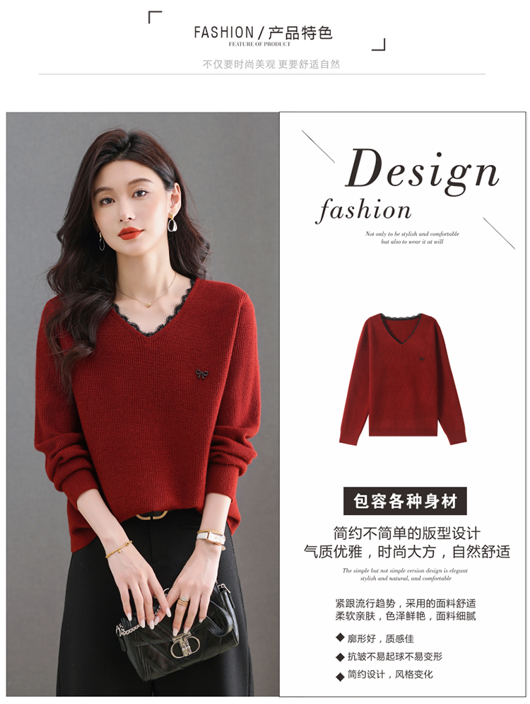 MY15553# V领蕾丝边毛衣新款大码宽松洋气妈妈羊毛针织打底上衣女裝貨源服裝批發