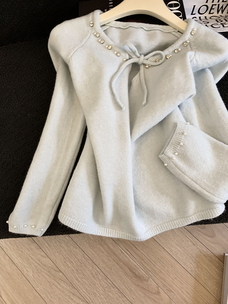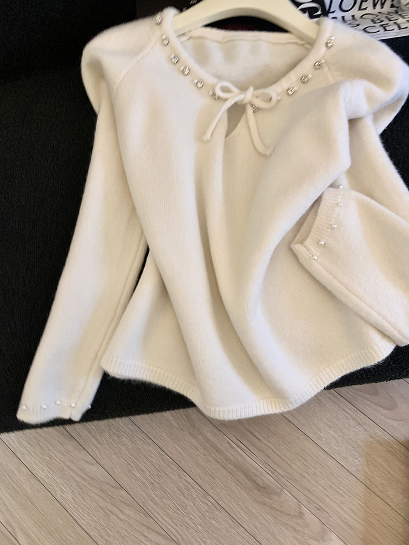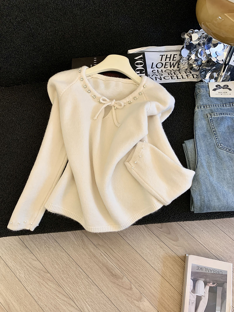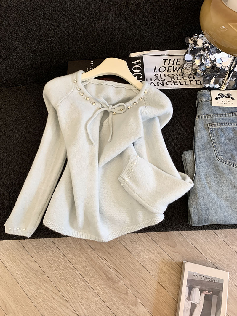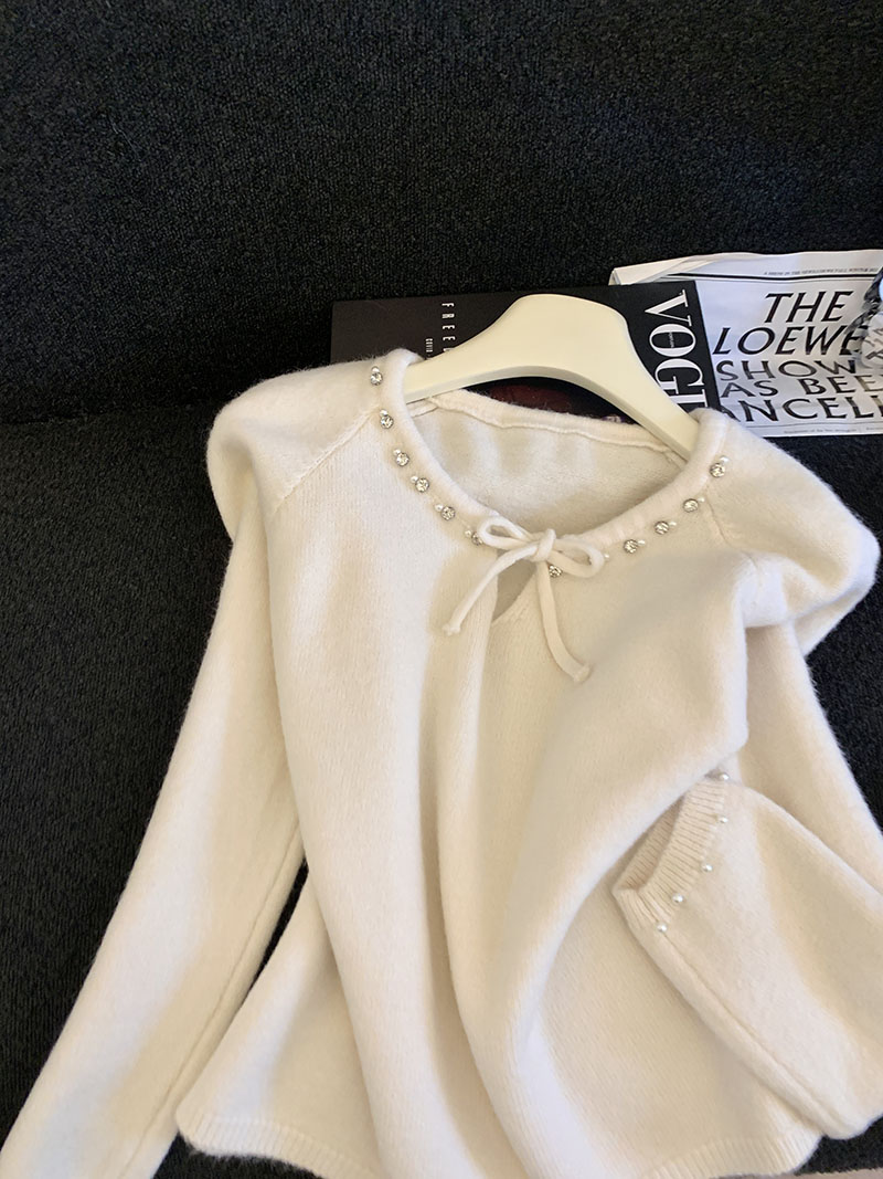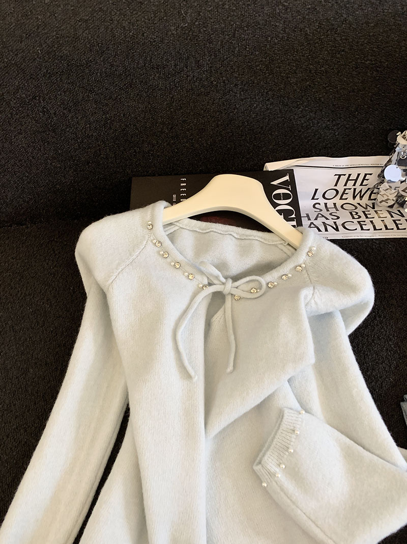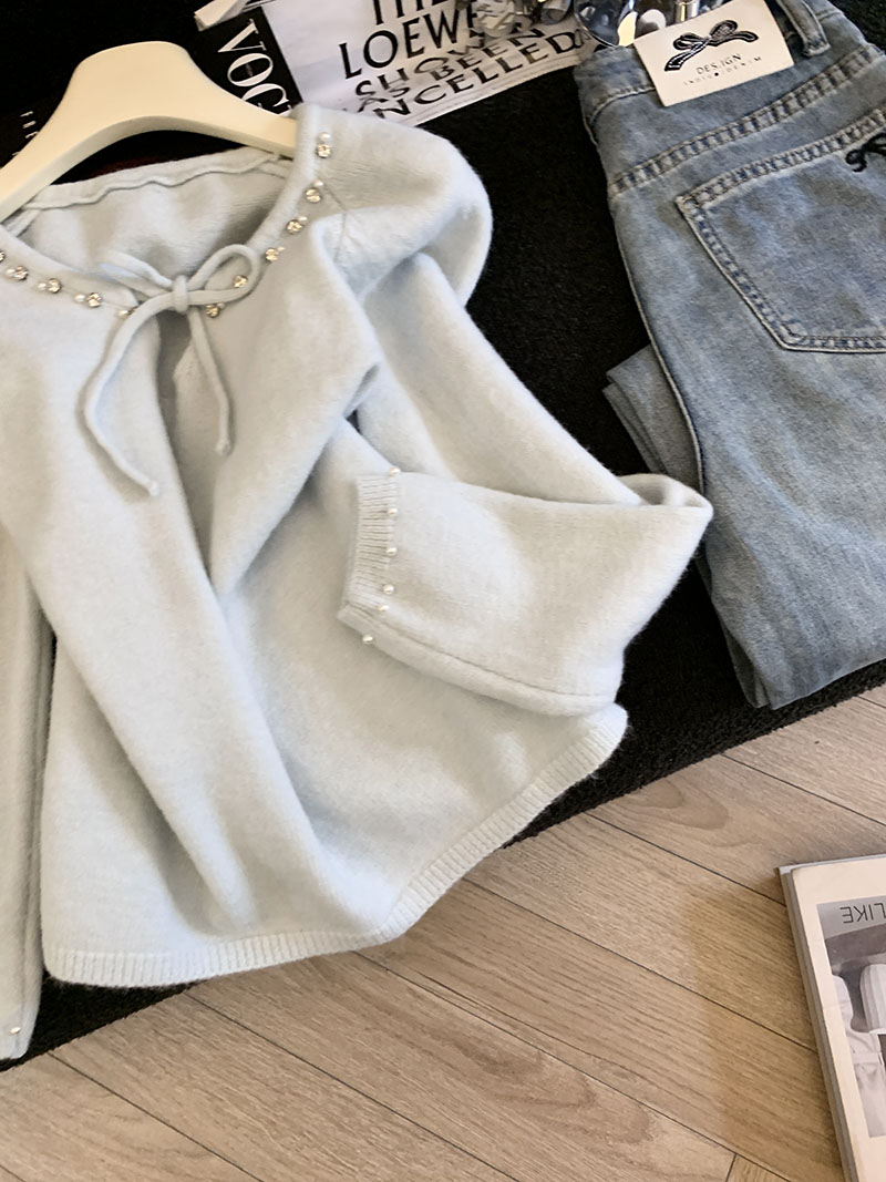 MY15556# 温柔风系带蝴蝶结长袖针织衫新款法式重工钉钻软糯毛衣女裝貨源服裝批發