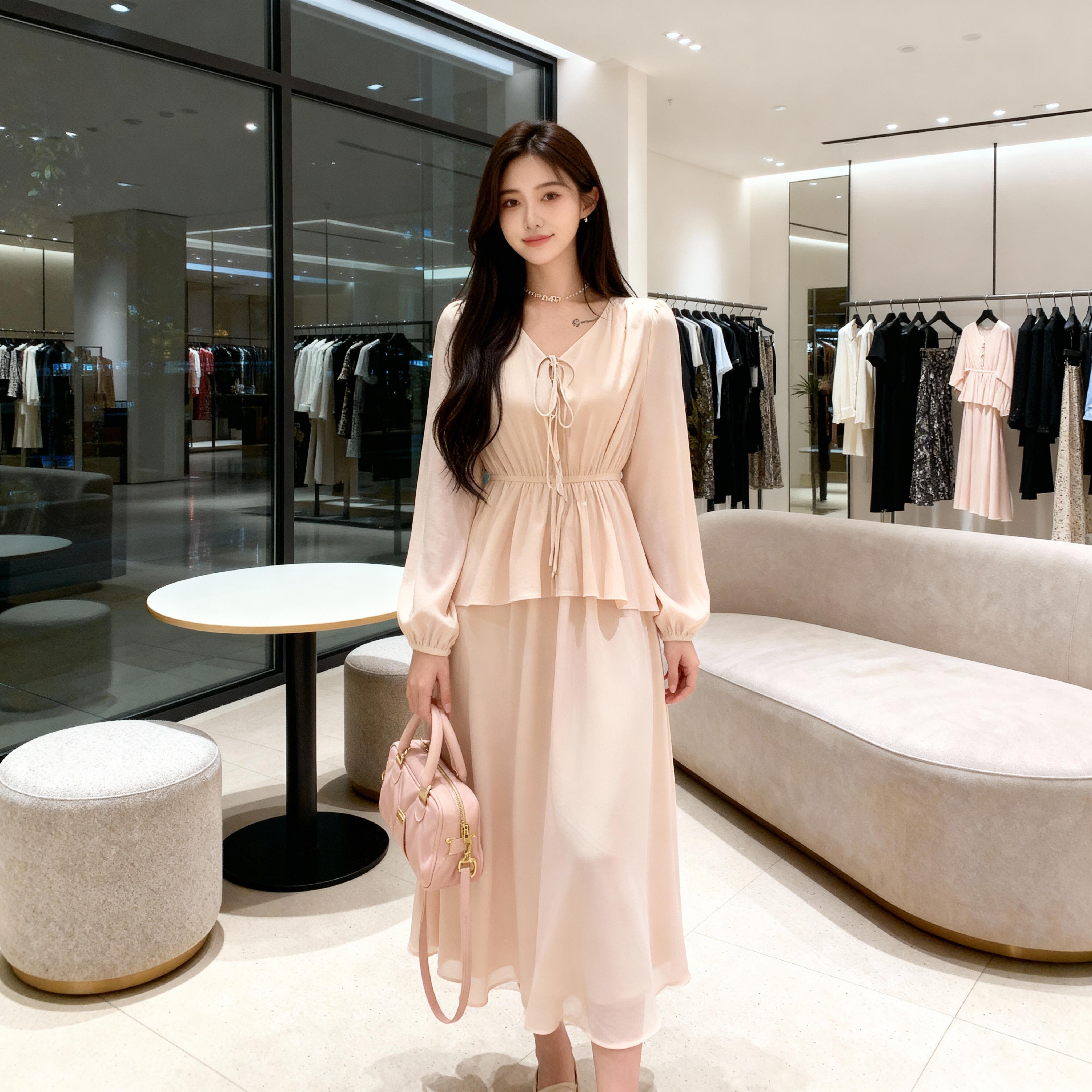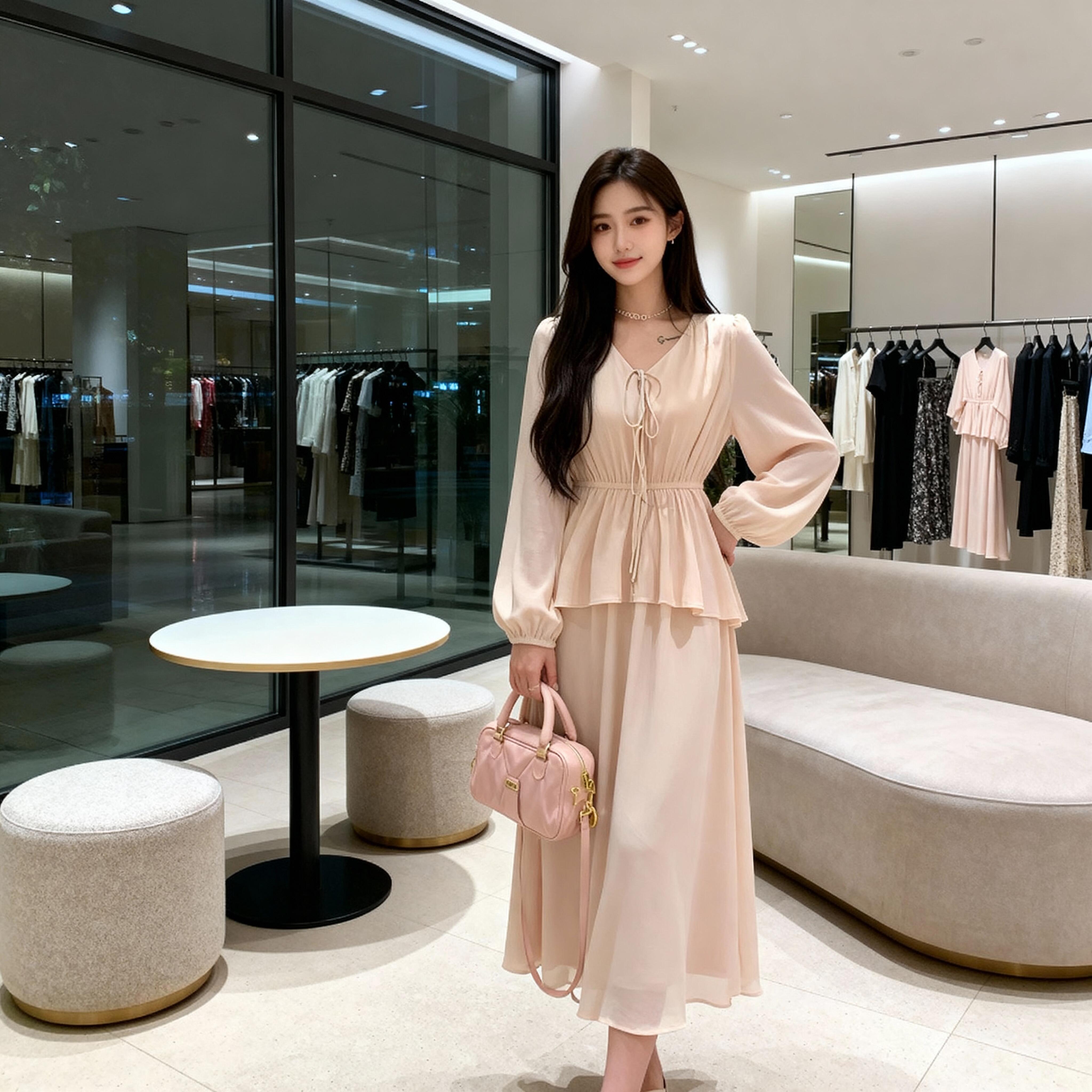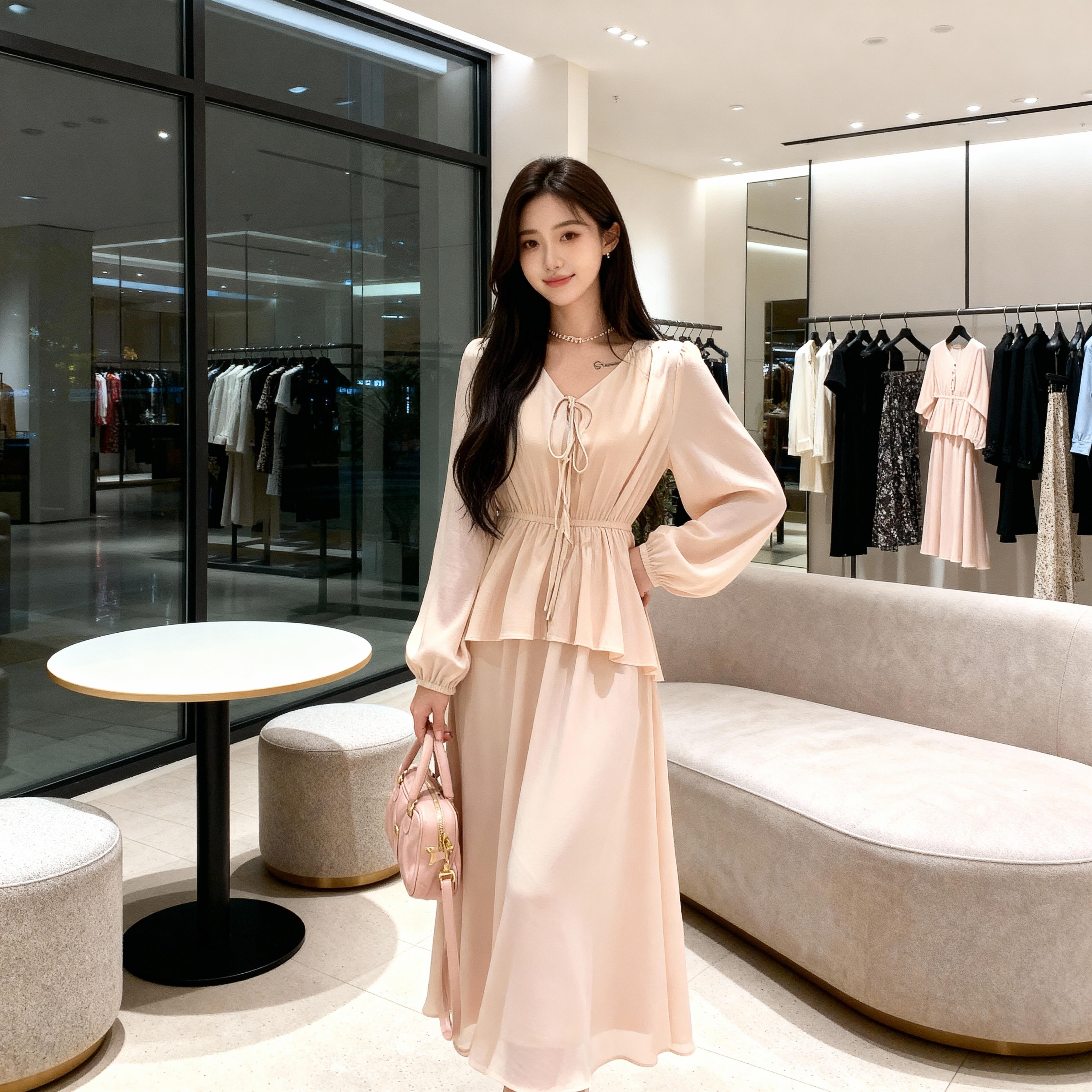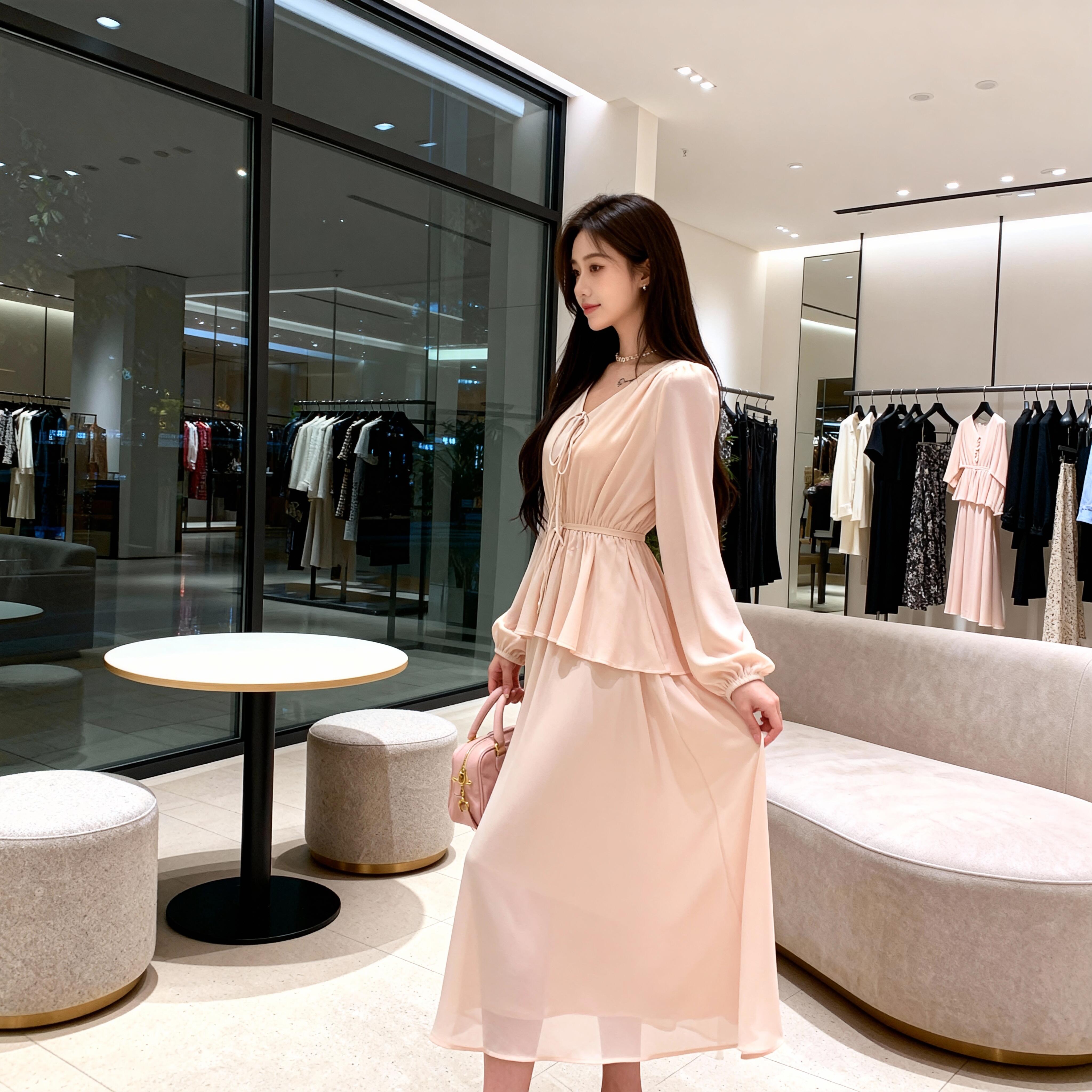MY15557# V领系带连衣裙女泡泡袖收腰荷叶边长裙法式温柔气质显瘦百搭裙女裝貨源服裝批發