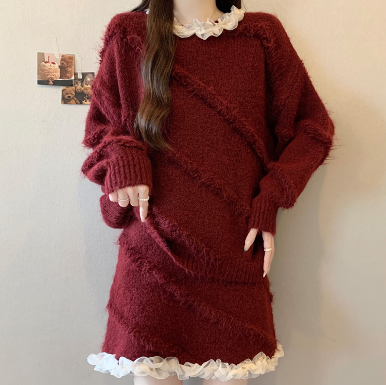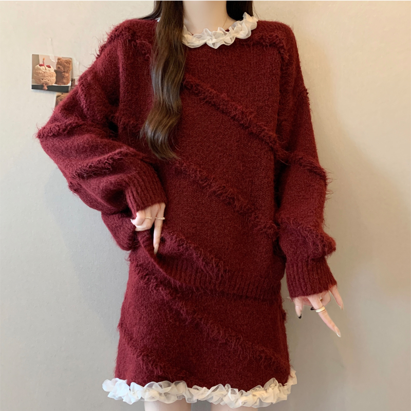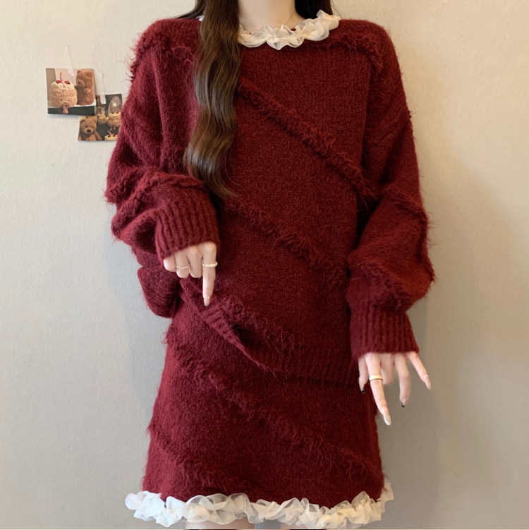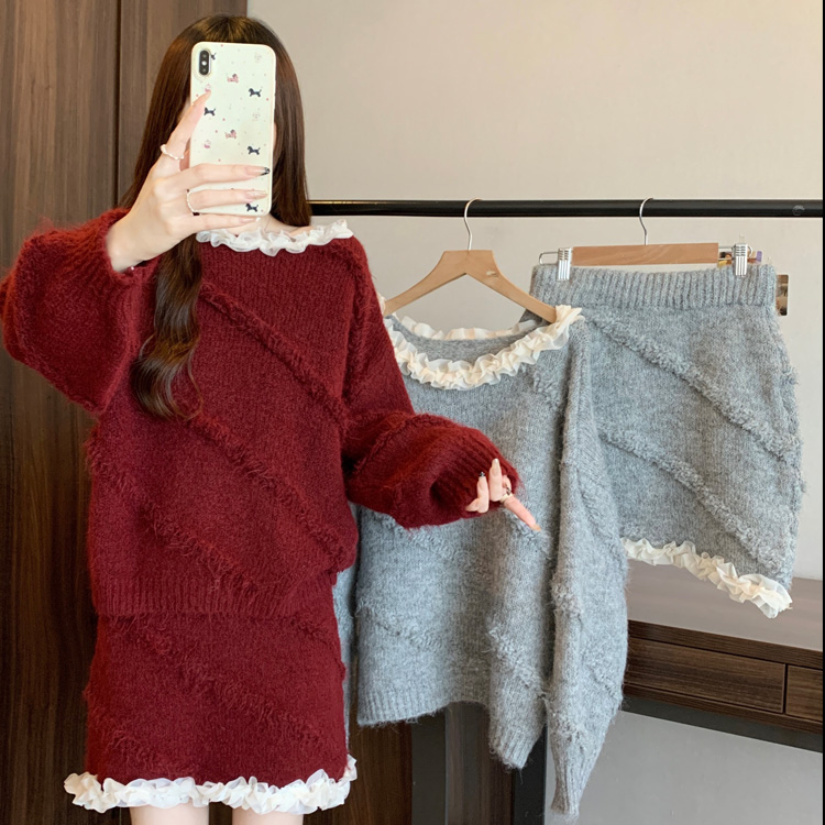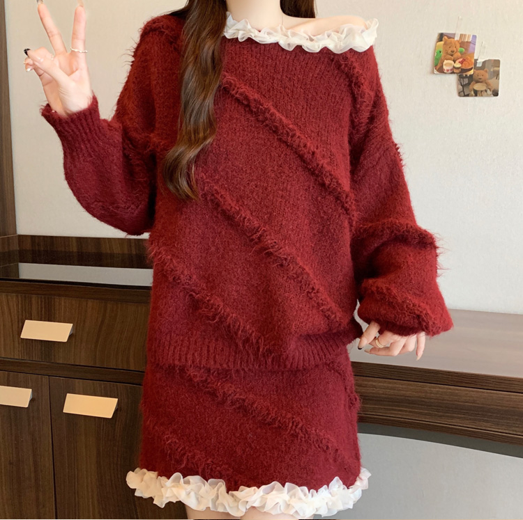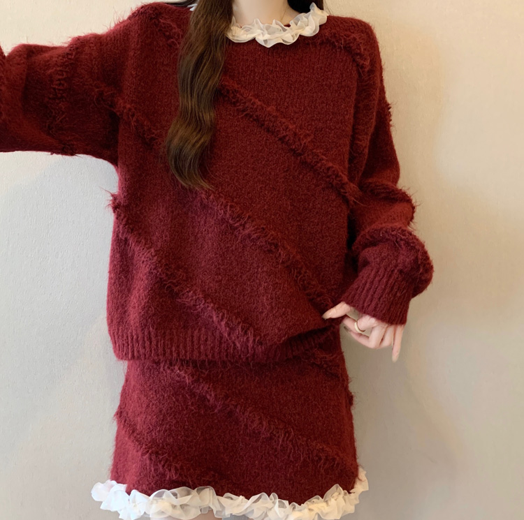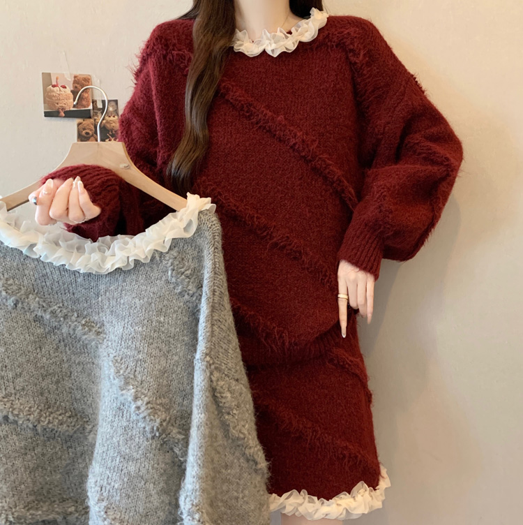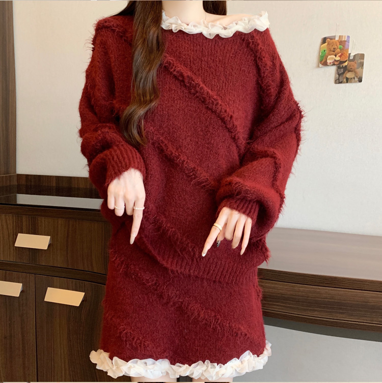 MY15558# 氛围感穿搭红色毛衣套装新款针织花边领上衣短裙两件套女裝貨源服裝批發