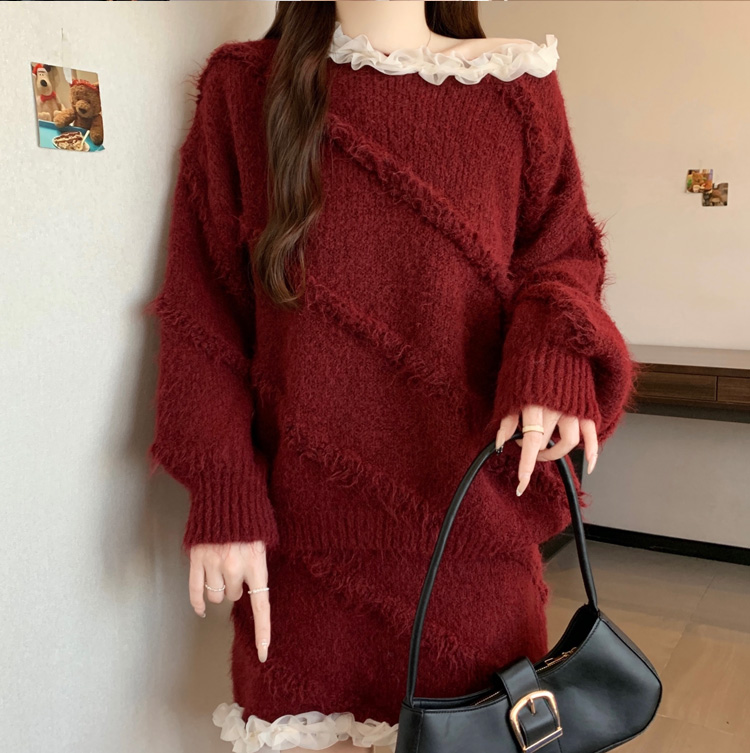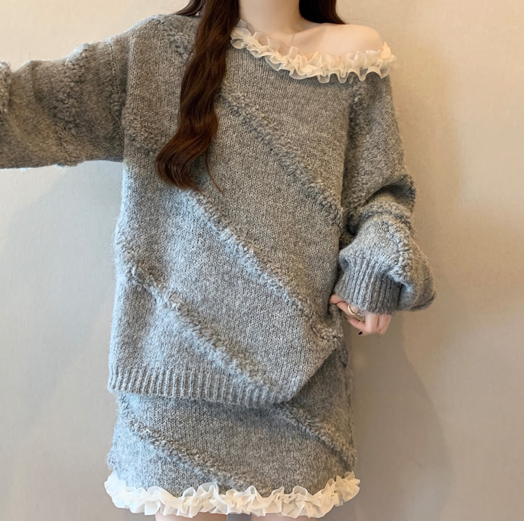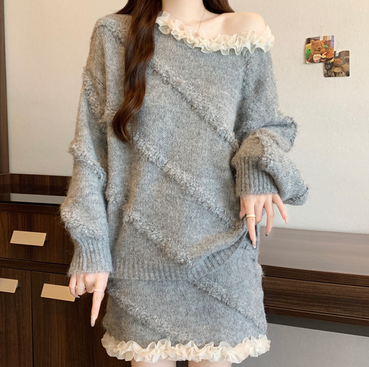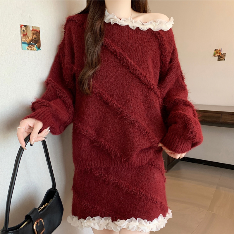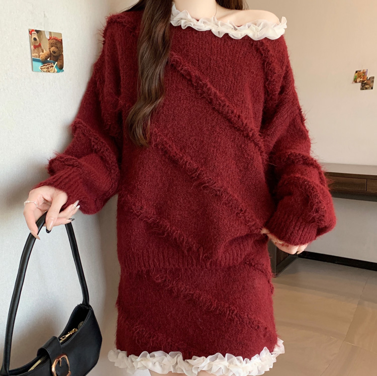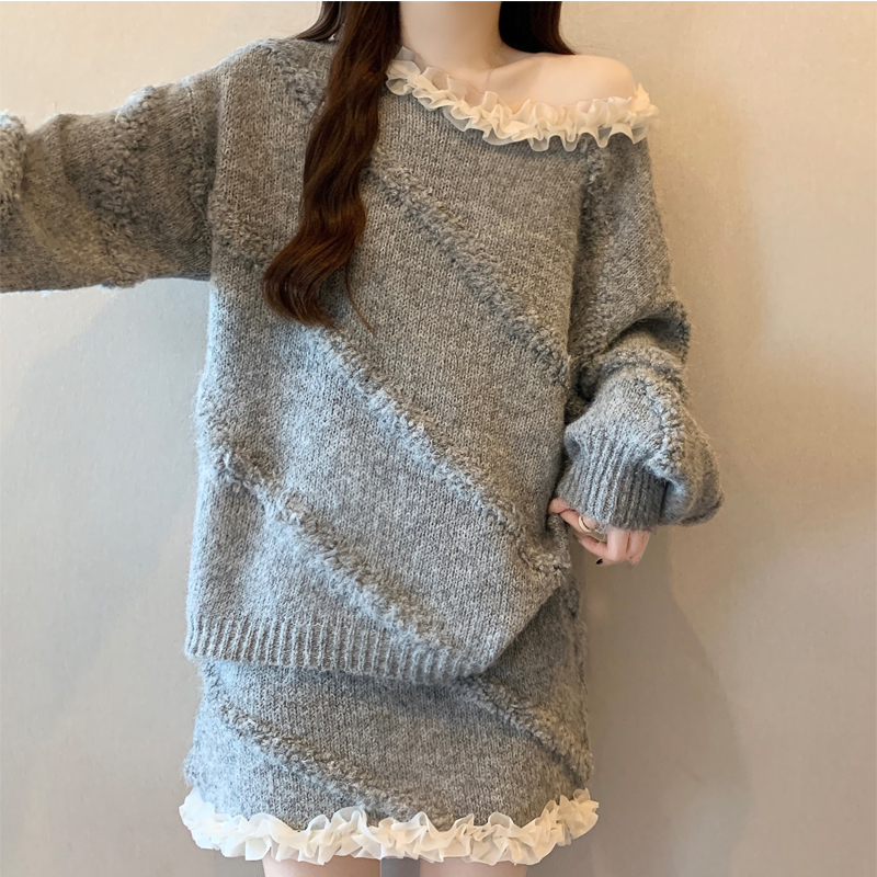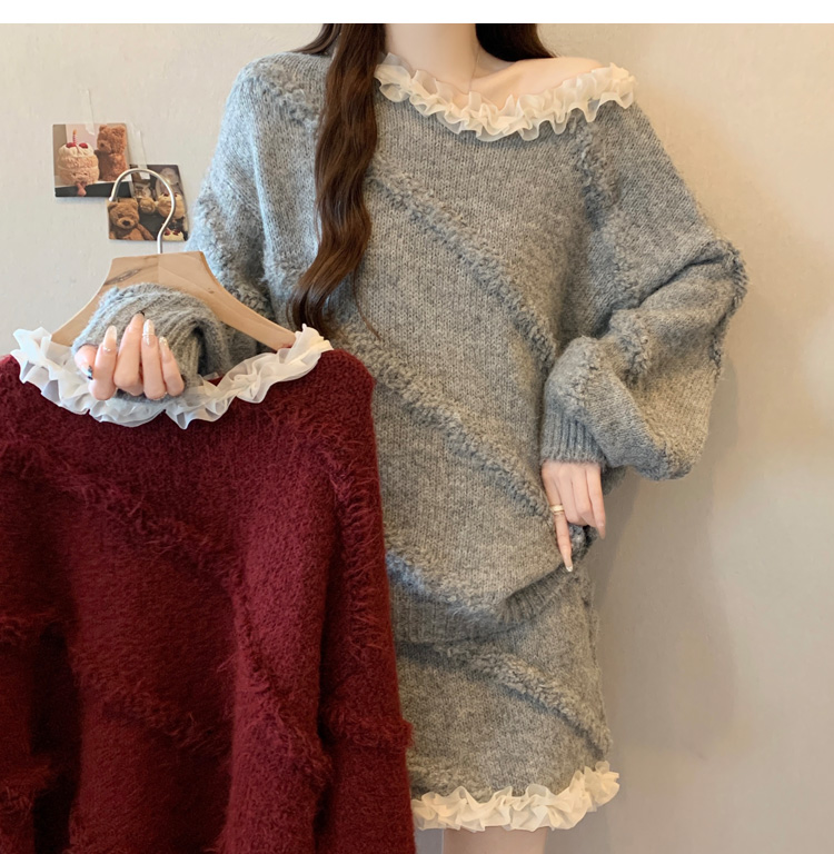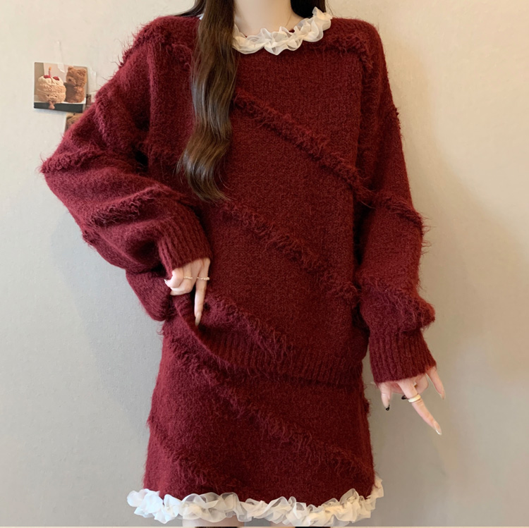 MY15558# 氛围感穿搭红色毛衣套装新款针织花边领上衣短裙两件套女裝貨源服裝批發