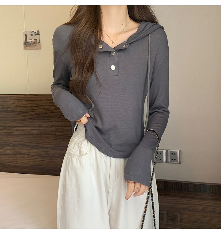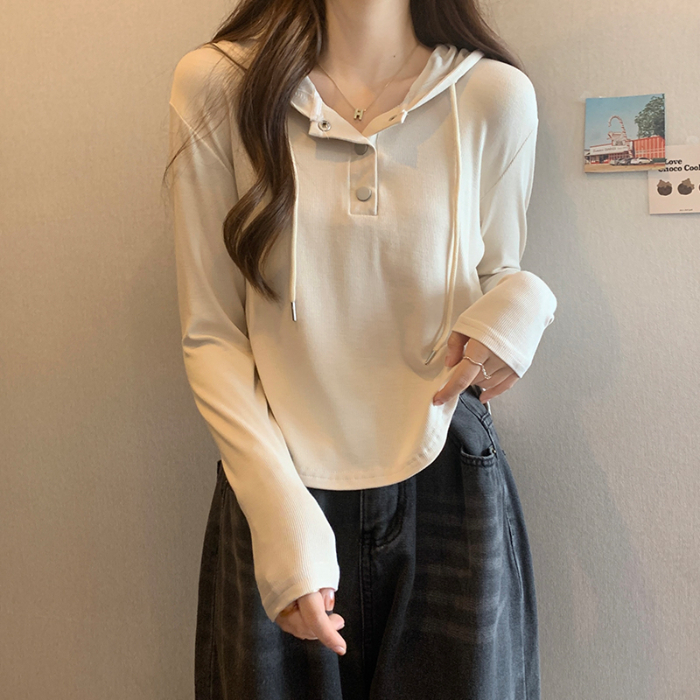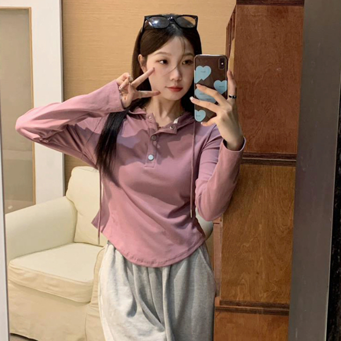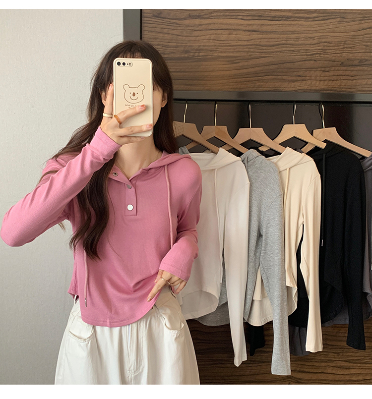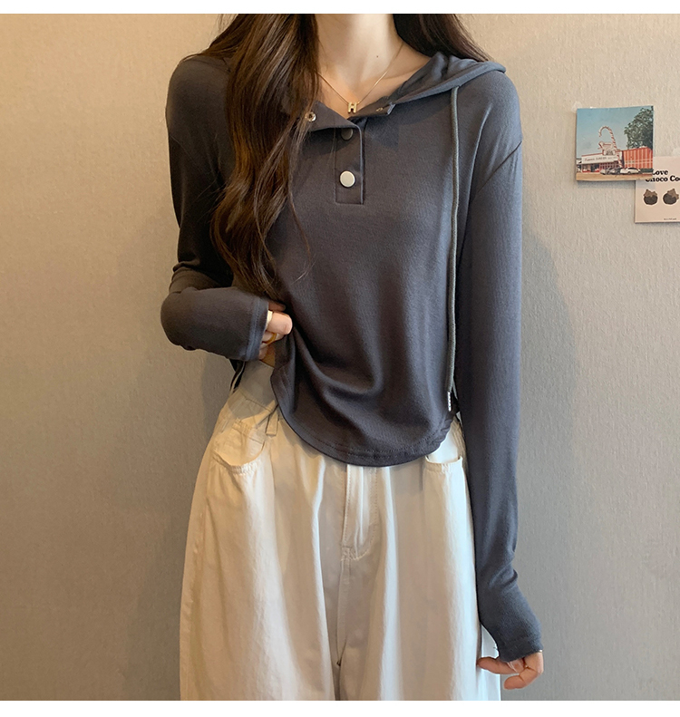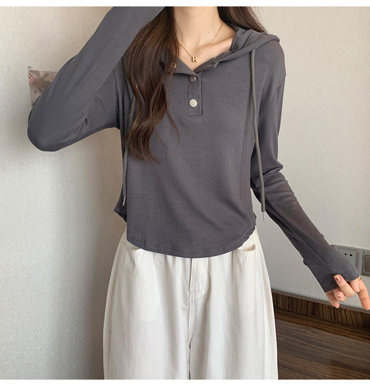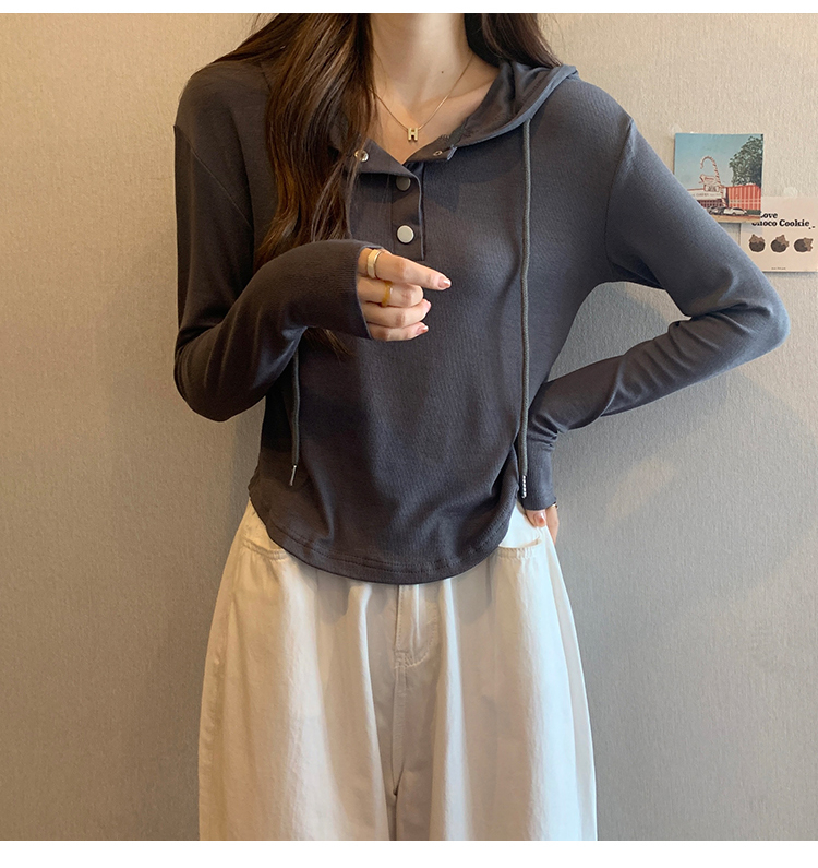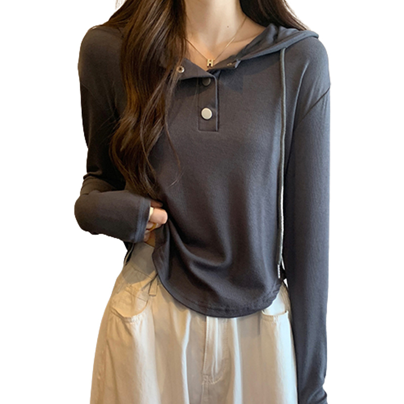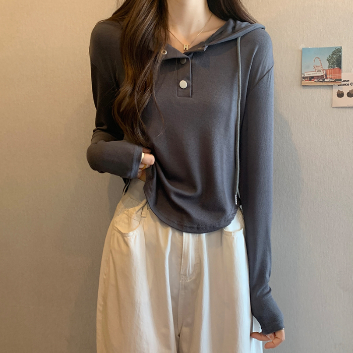 MY15570# 设计感不规则连帽长袖t恤女春季新款韩版灰色半开领修身短款上衣女裝貨源服裝批發