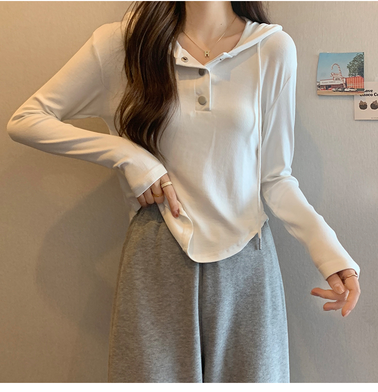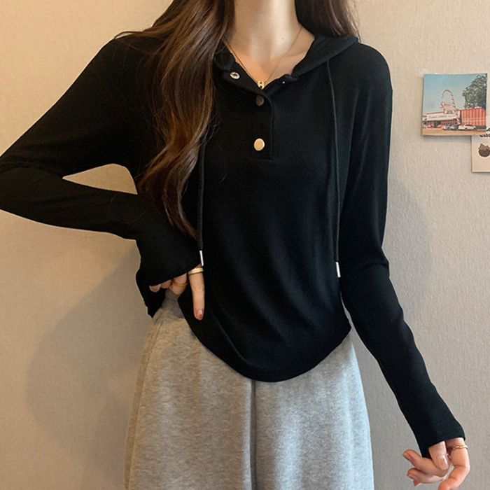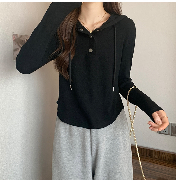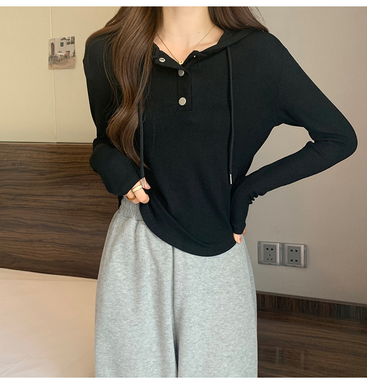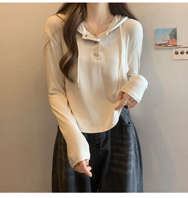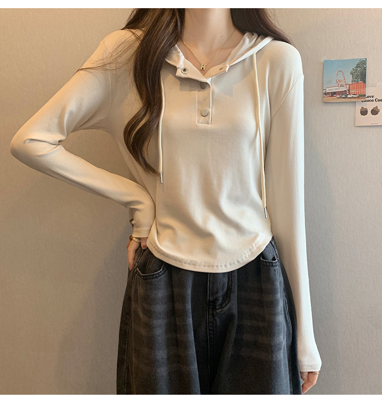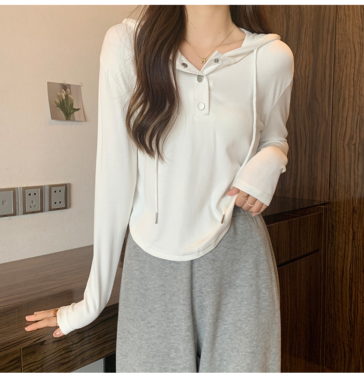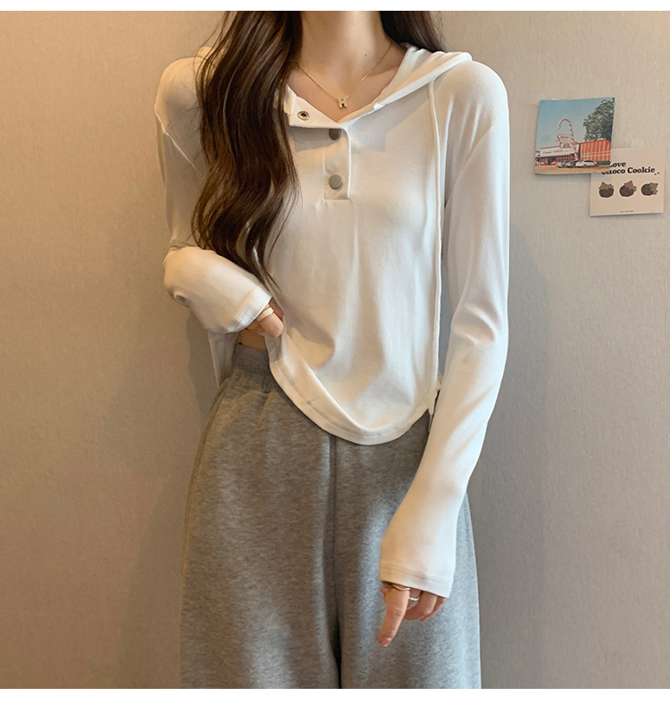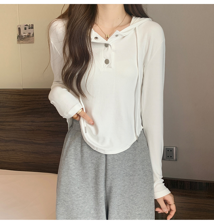 MY15570# 设计感不规则连帽长袖t恤女春季新款韩版灰色半开领修身短款上衣女裝貨源服裝批發
