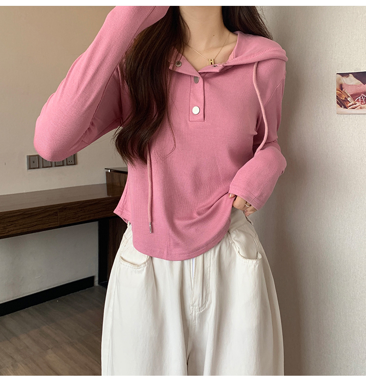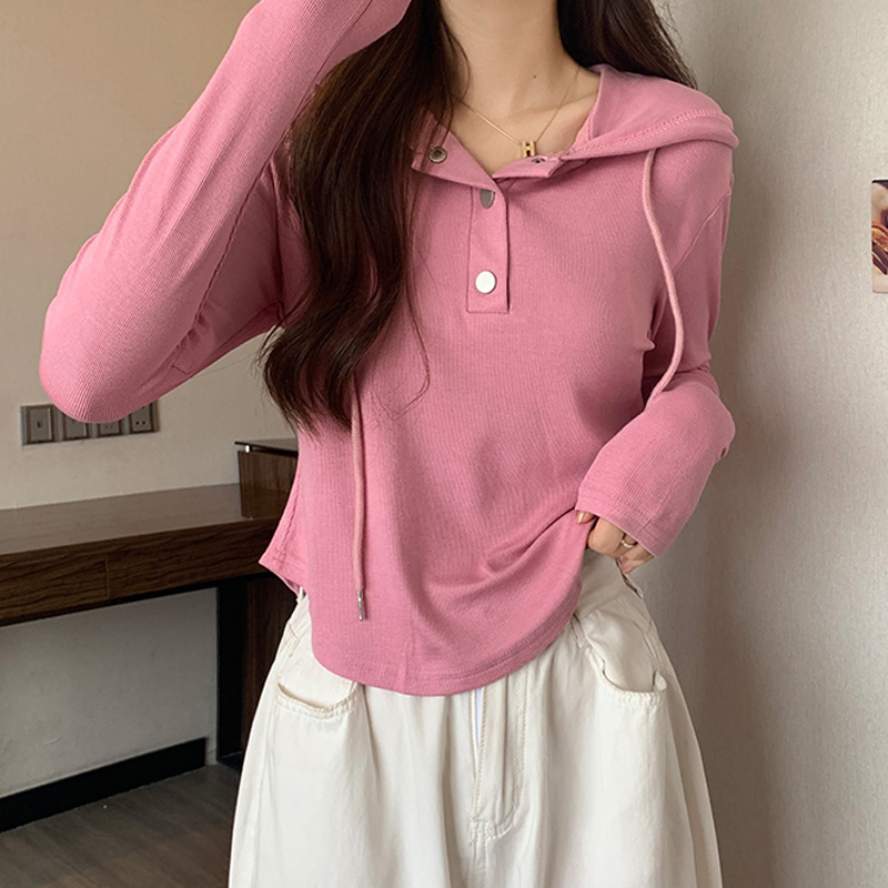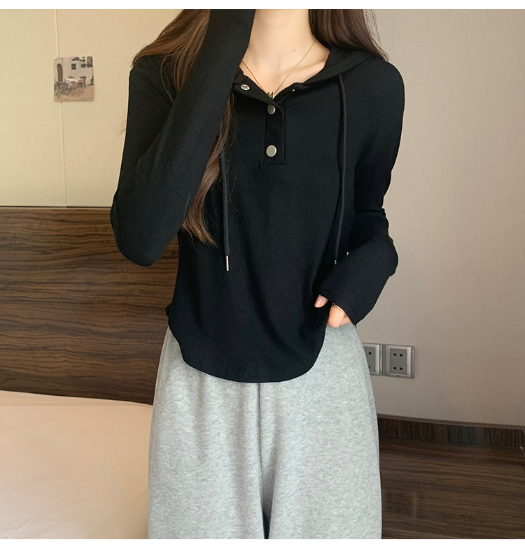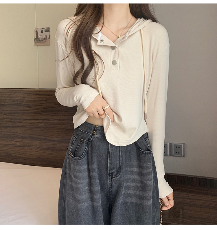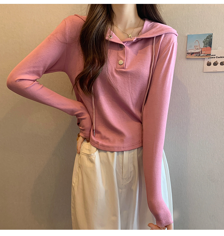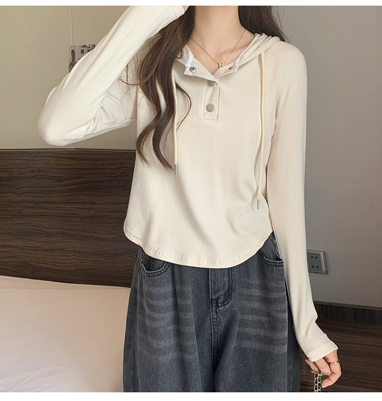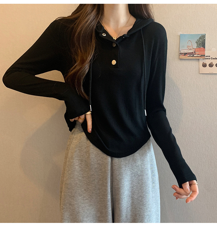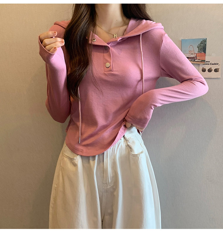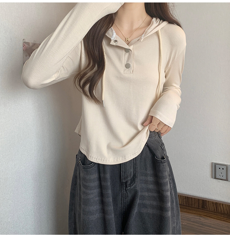 MY15570# 设计感不规则连帽长袖t恤女春季新款韩版灰色半开领修身短款上衣女裝貨源服裝批發