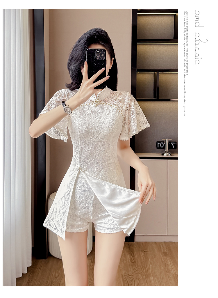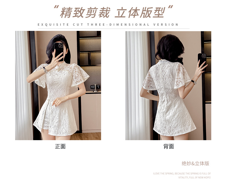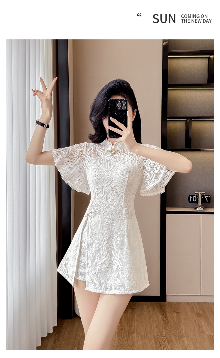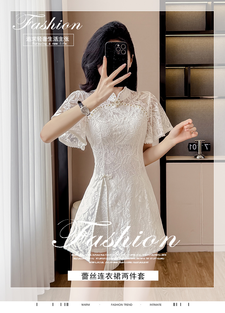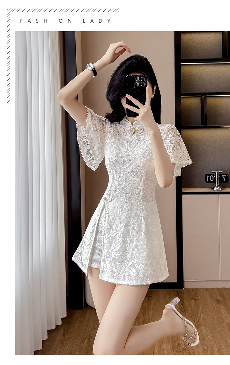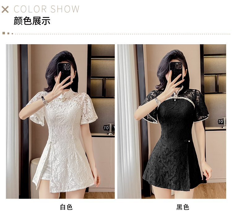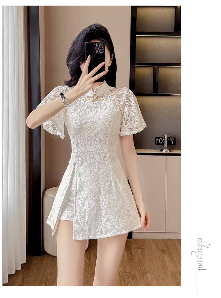 MY15573# 夏季新款新中式蕾丝拼接喇叭袖短款显瘦连衣裙短裤两件套女裝貨源服裝批發