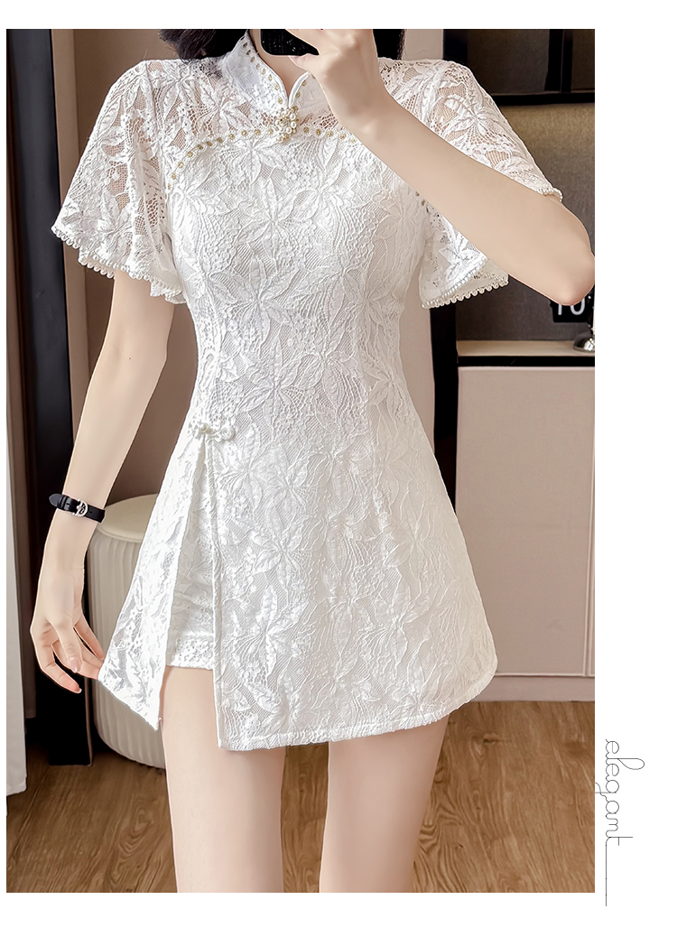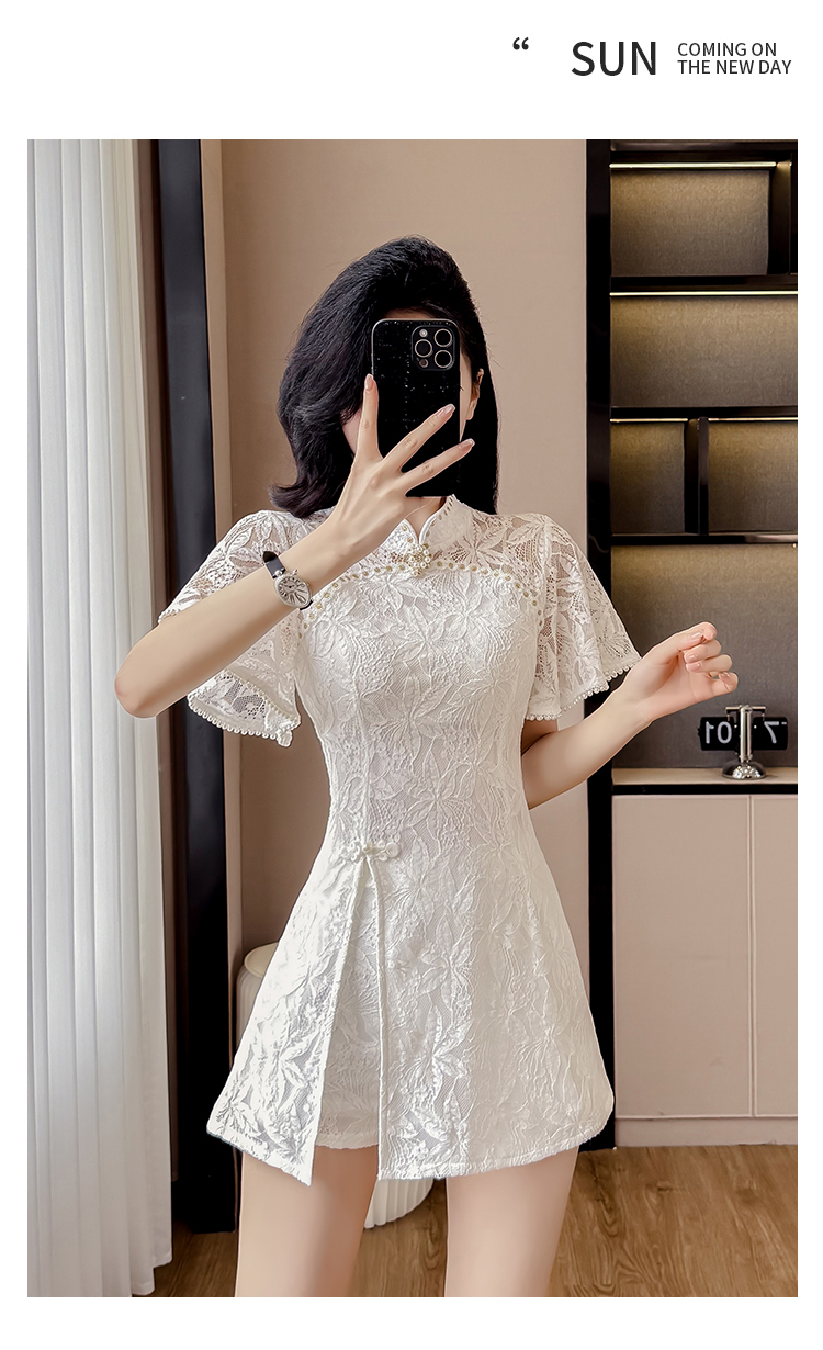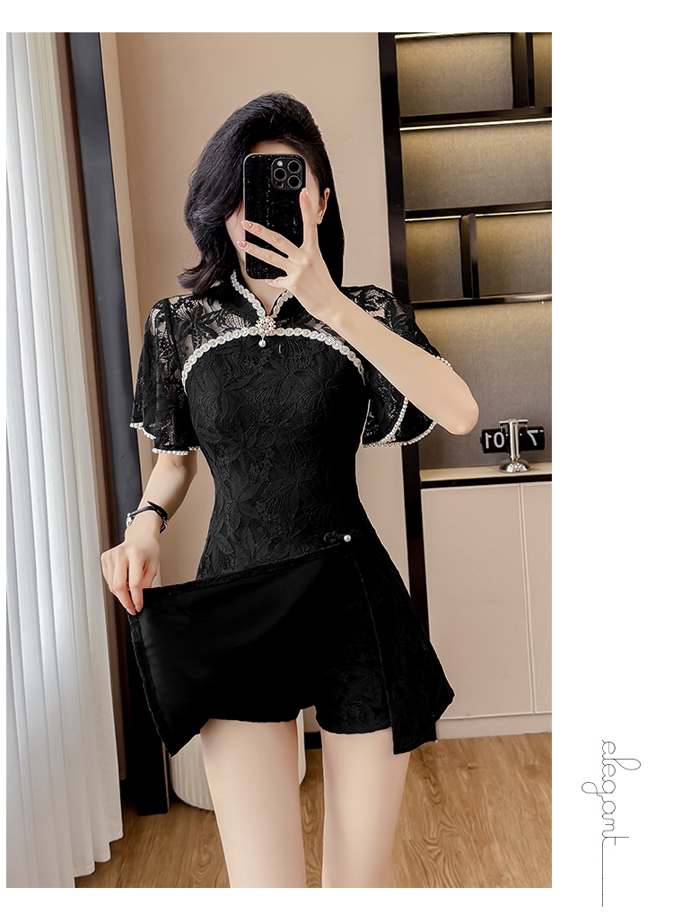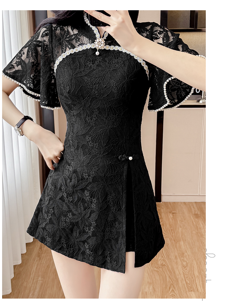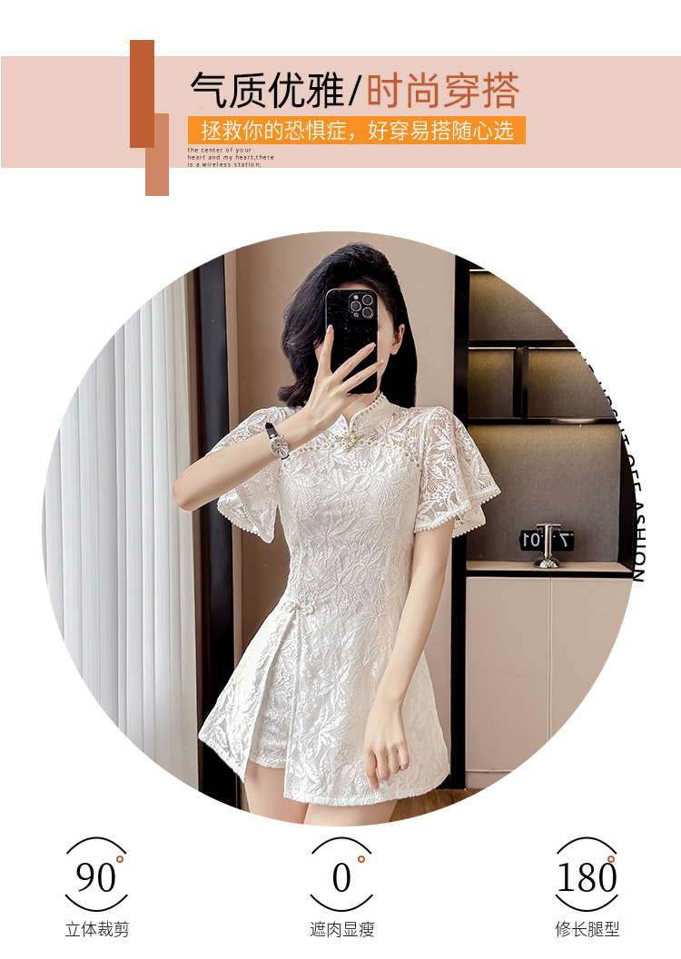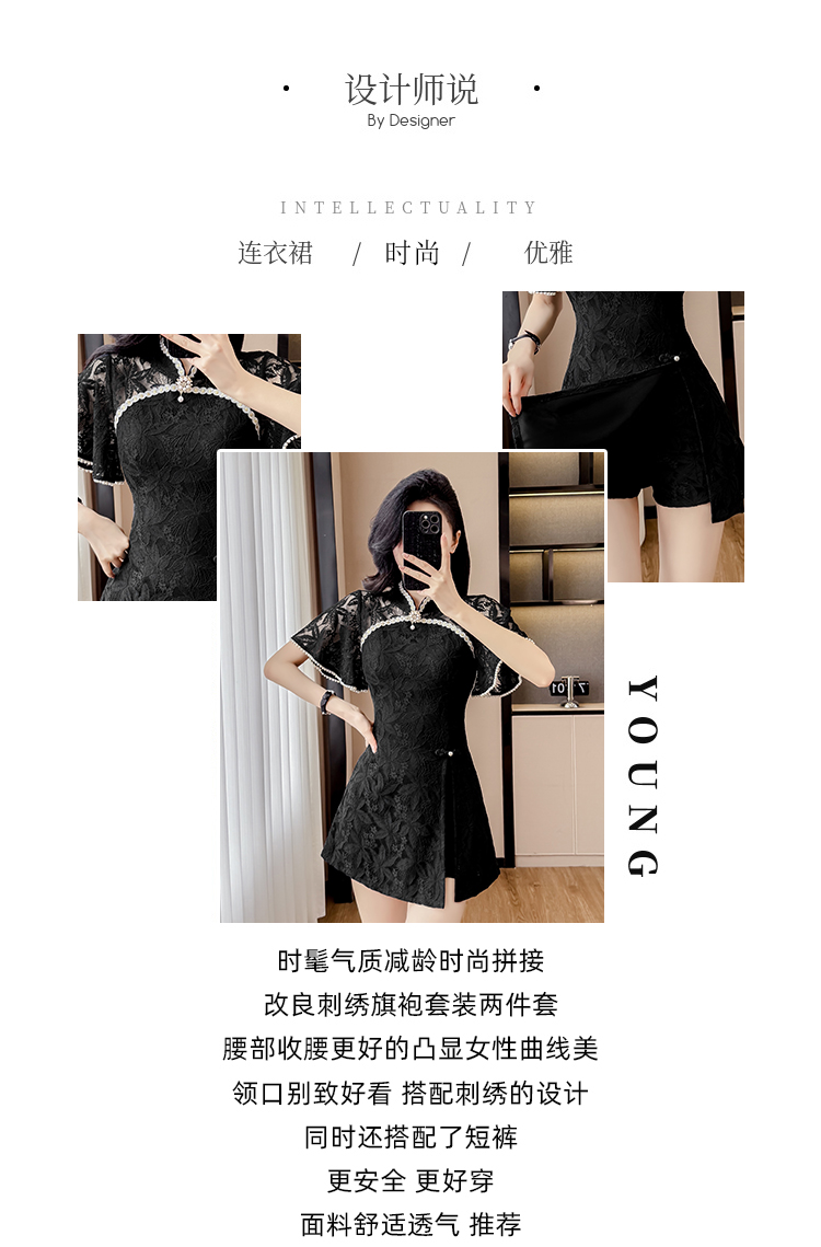 MY15573# 夏季新款新中式蕾丝拼接喇叭袖短款显瘦连衣裙短裤两件套女裝貨源服裝批發