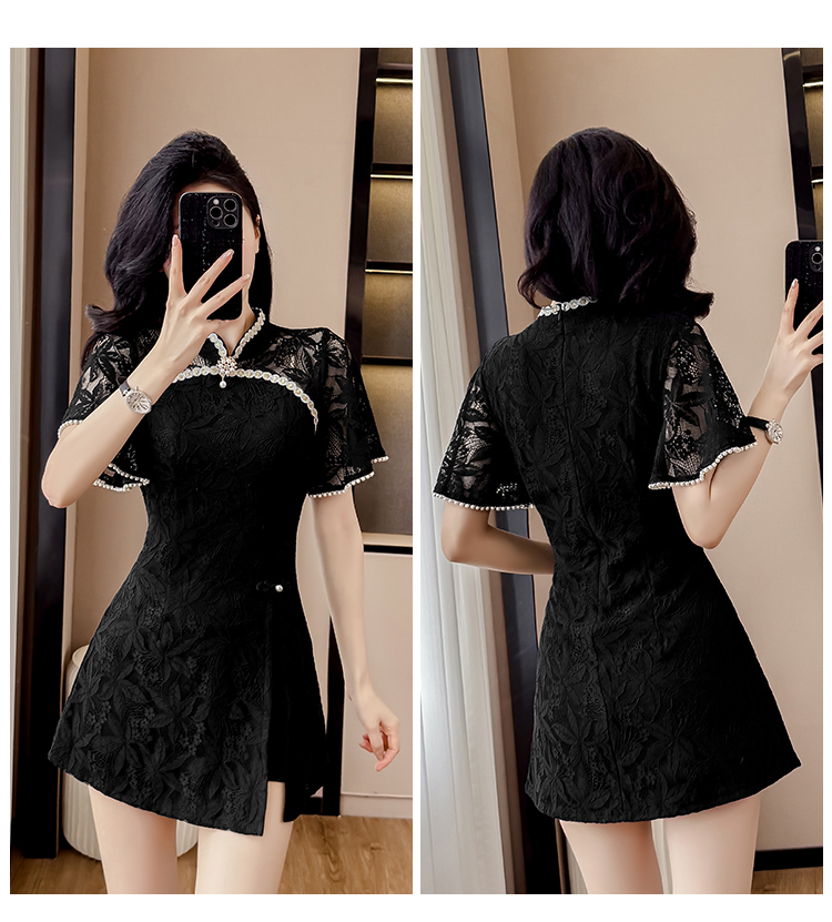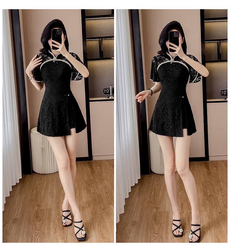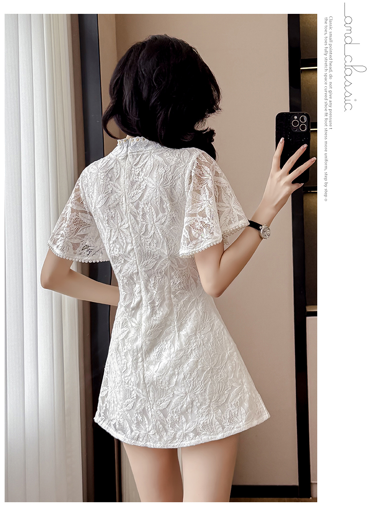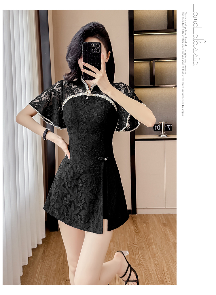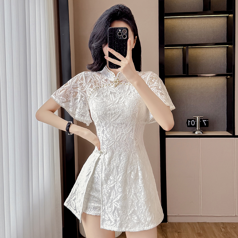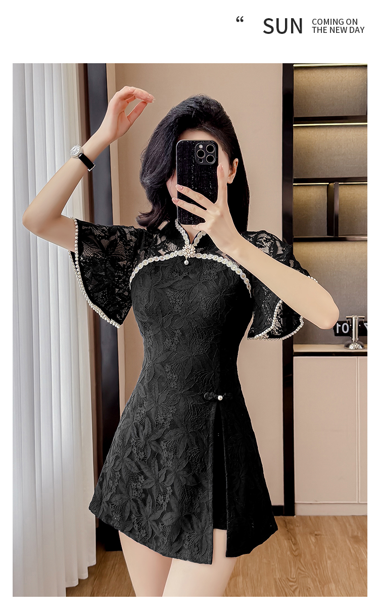 MY15573# 夏季新款新中式蕾丝拼接喇叭袖短款显瘦连衣裙短裤两件套女裝貨源服裝批發