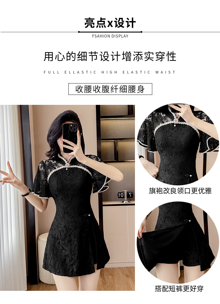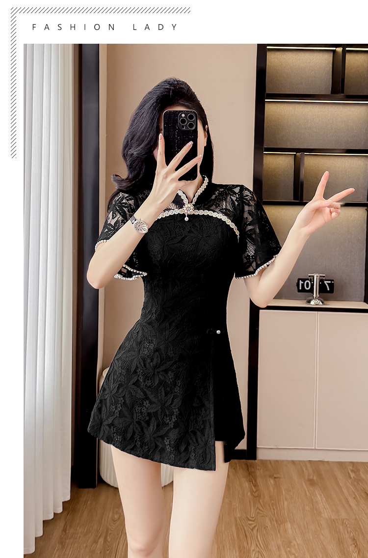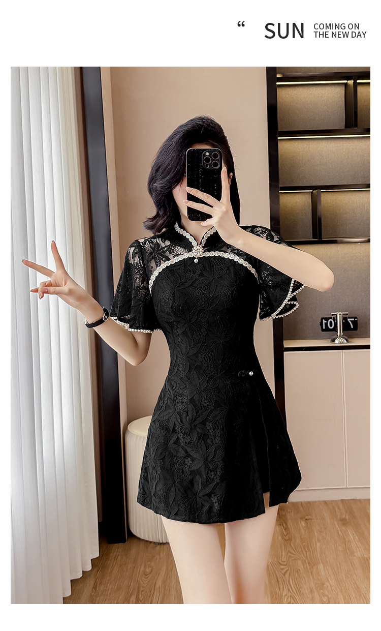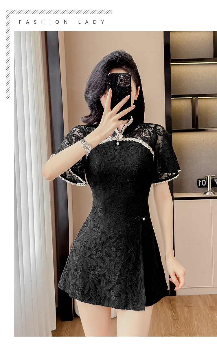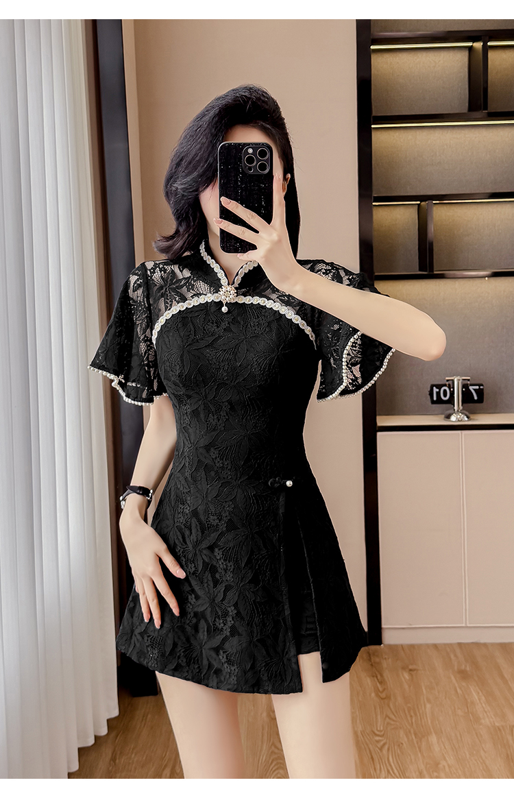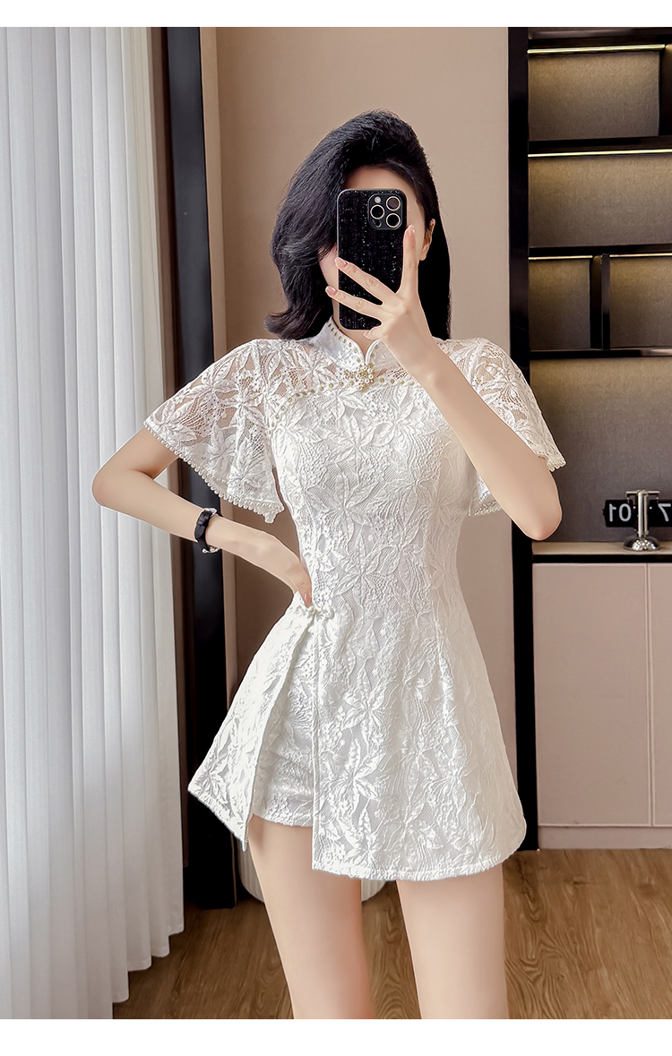 MY15573# 夏季新款新中式蕾丝拼接喇叭袖短款显瘦连衣裙短裤两件套女裝貨源服裝批發