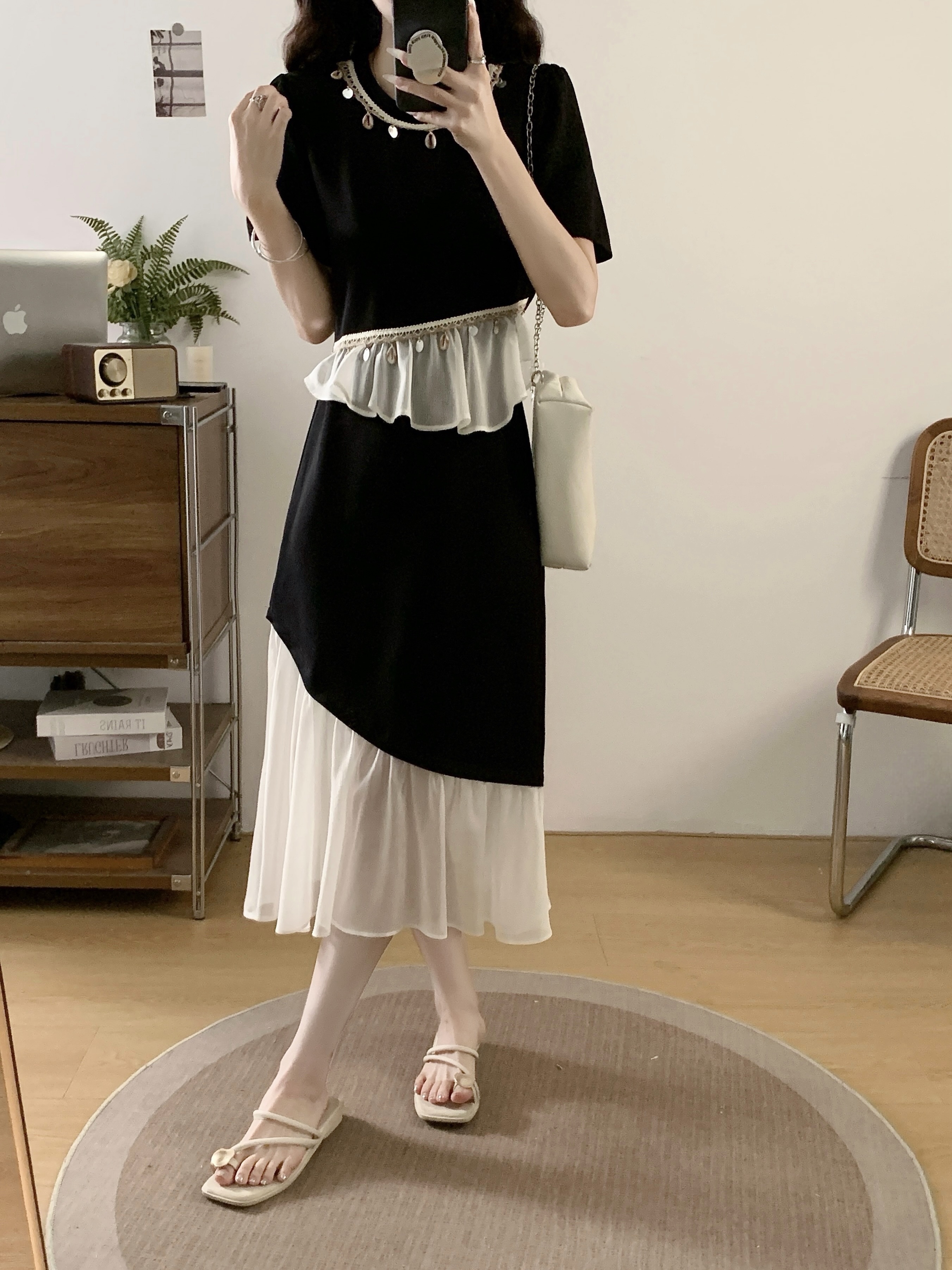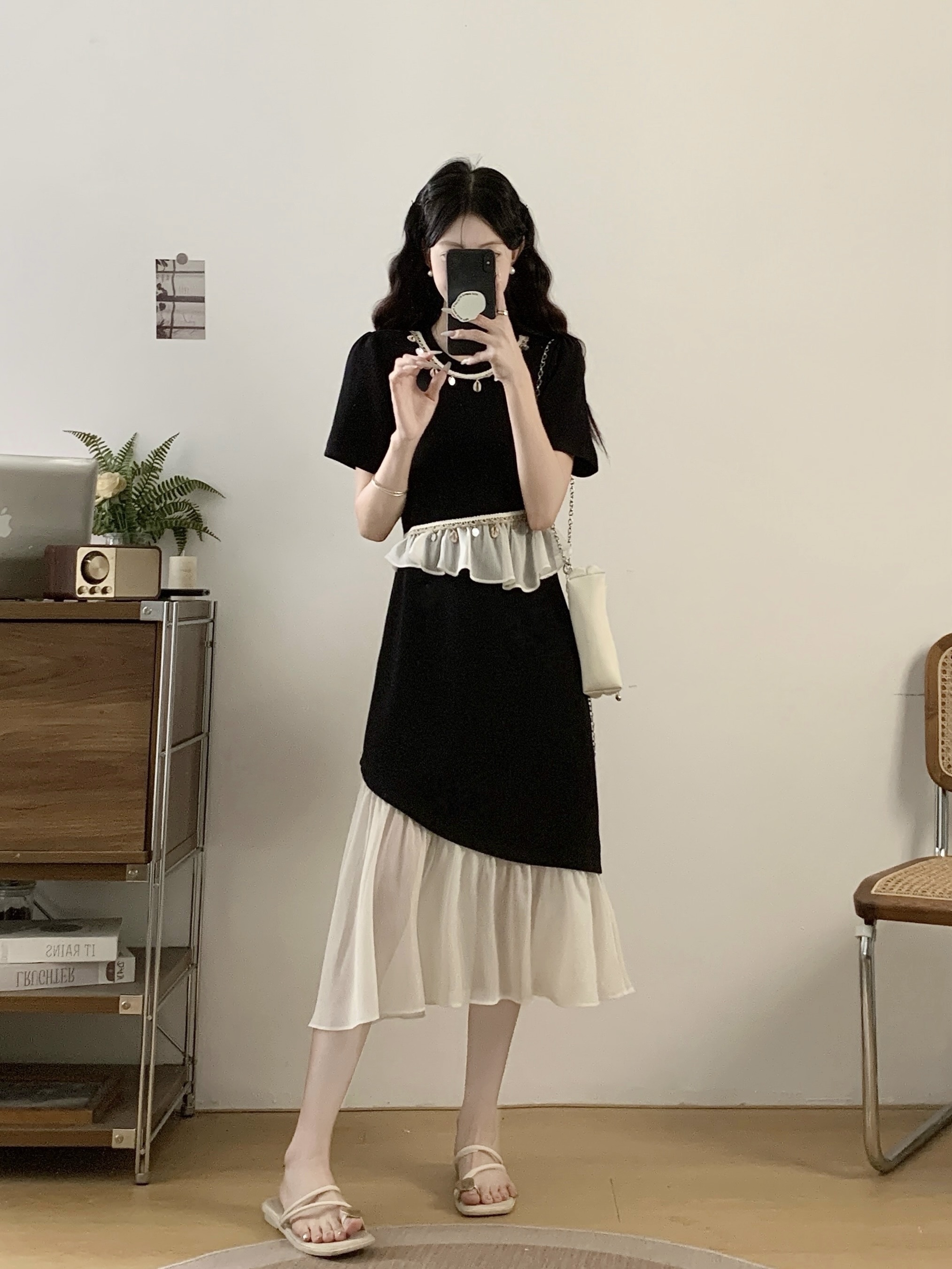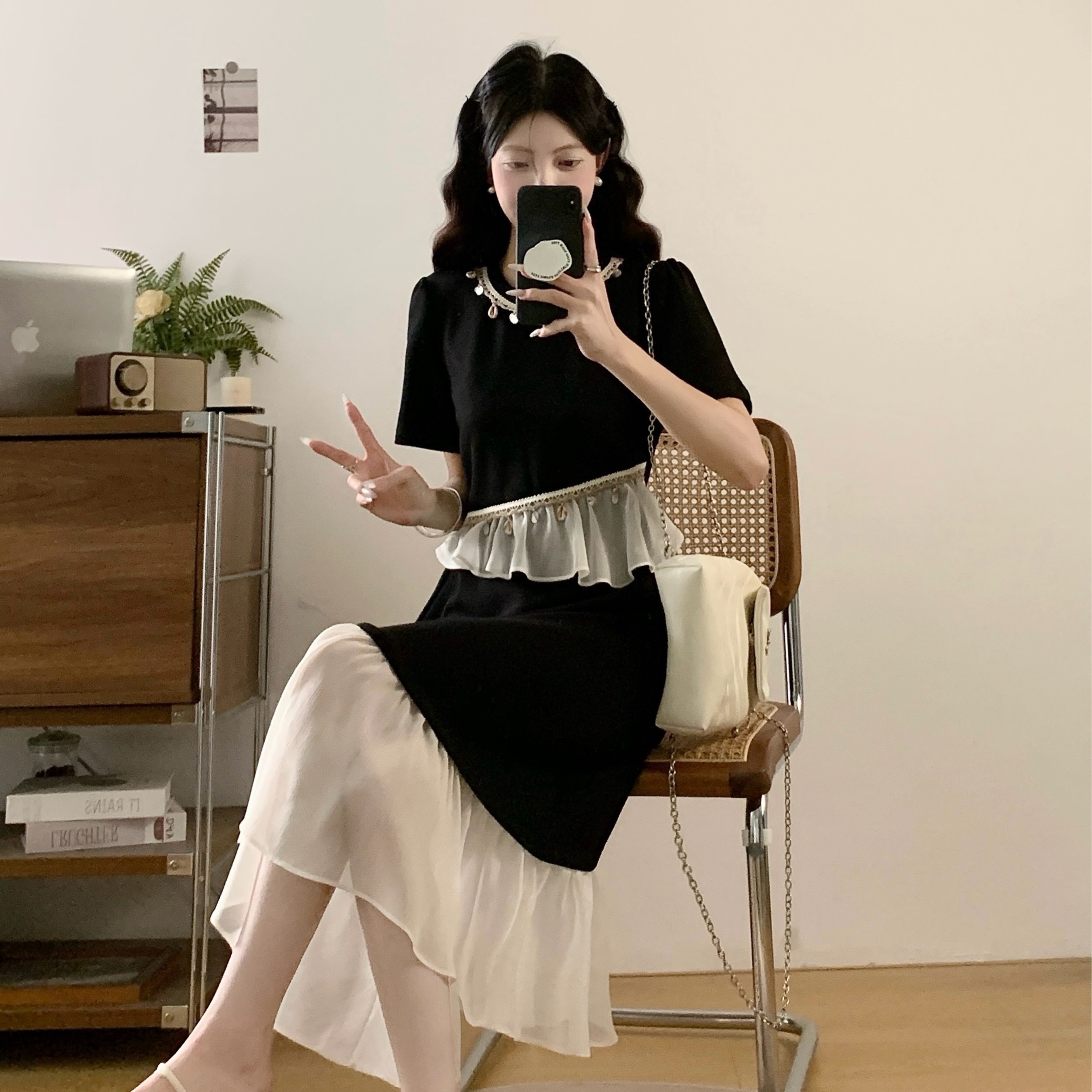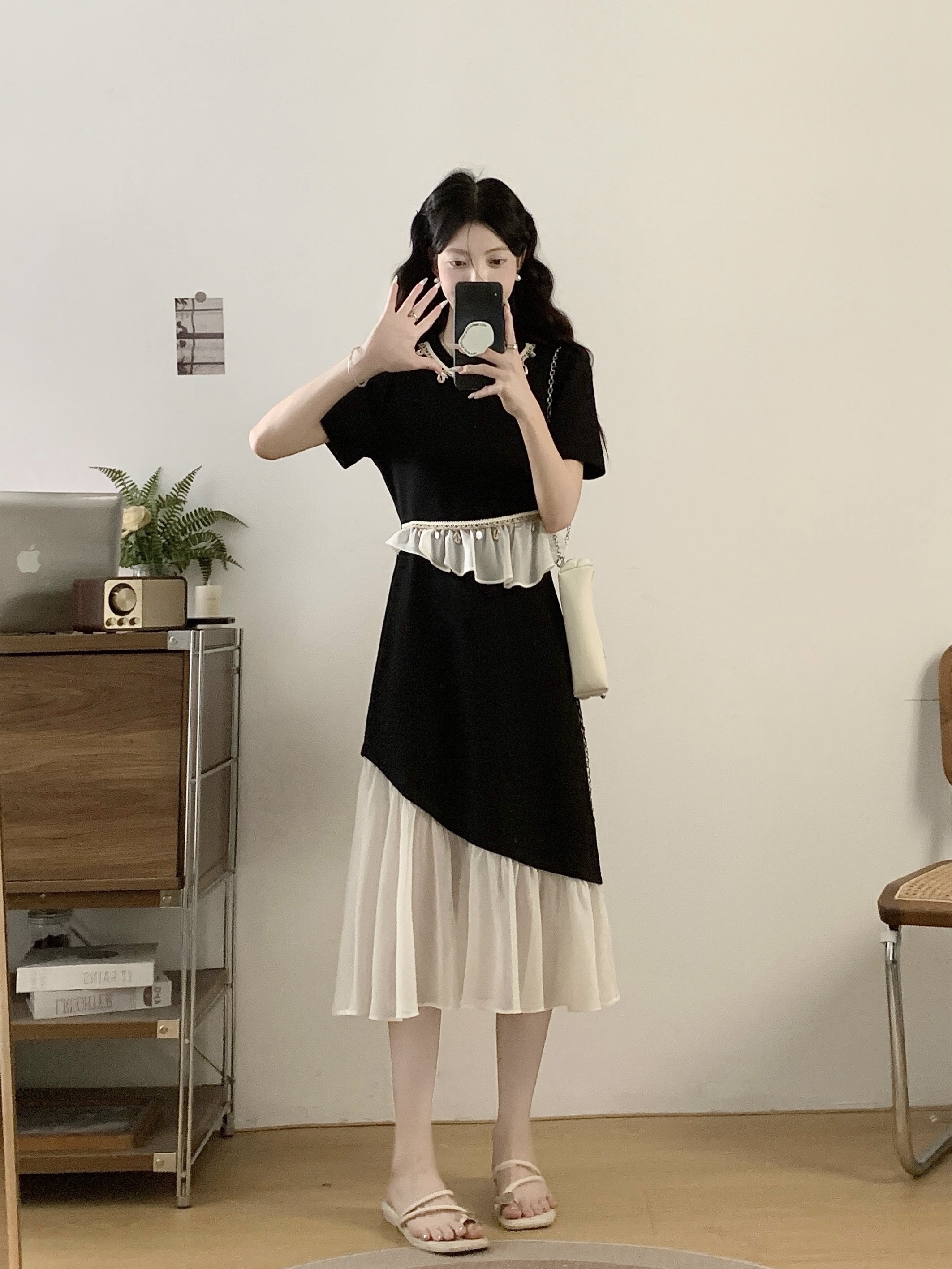 MY15597# 大码女装夏季法式小香风气质荷叶边收腰显瘦假两件连衣裙女裝貨源服裝批發
