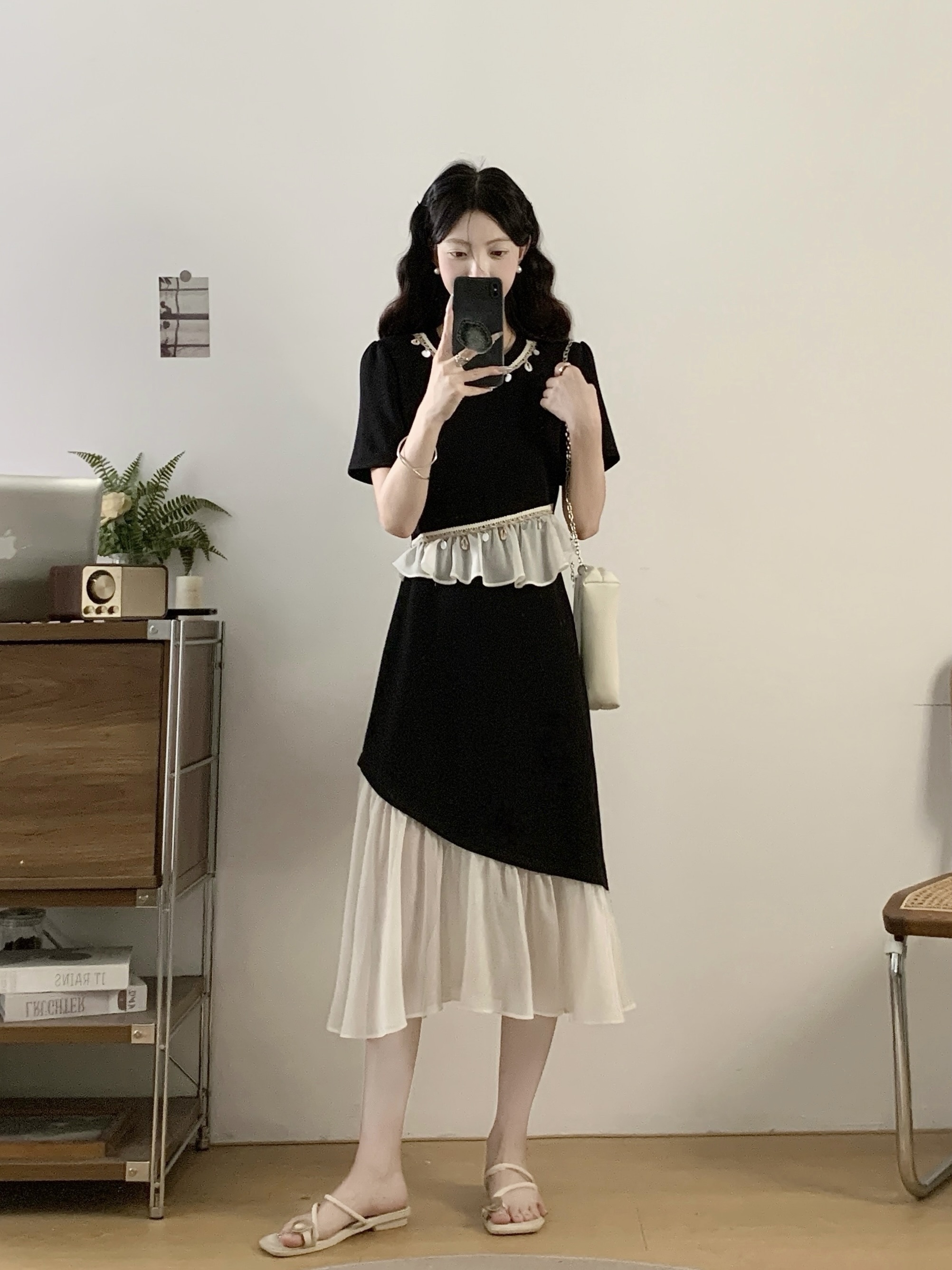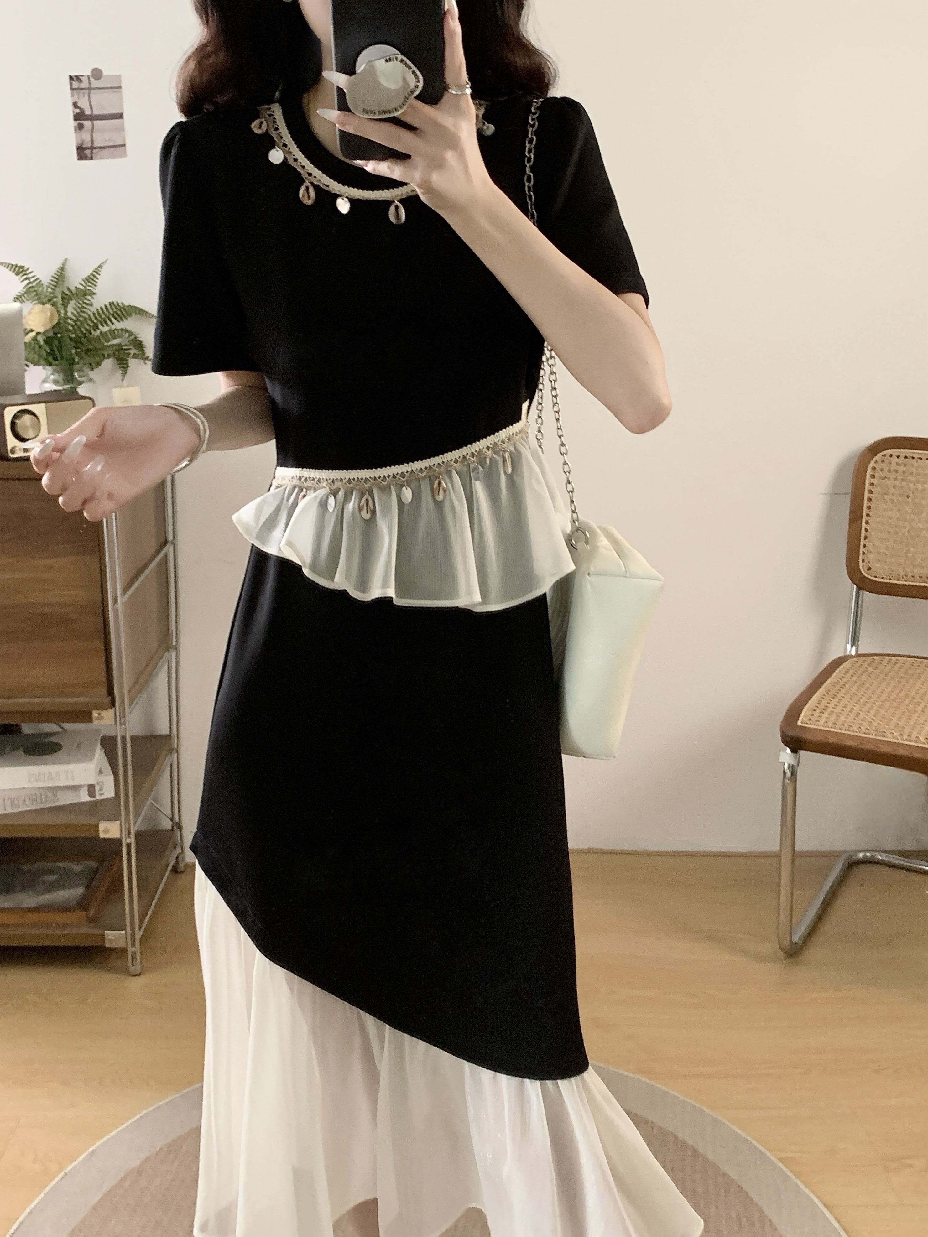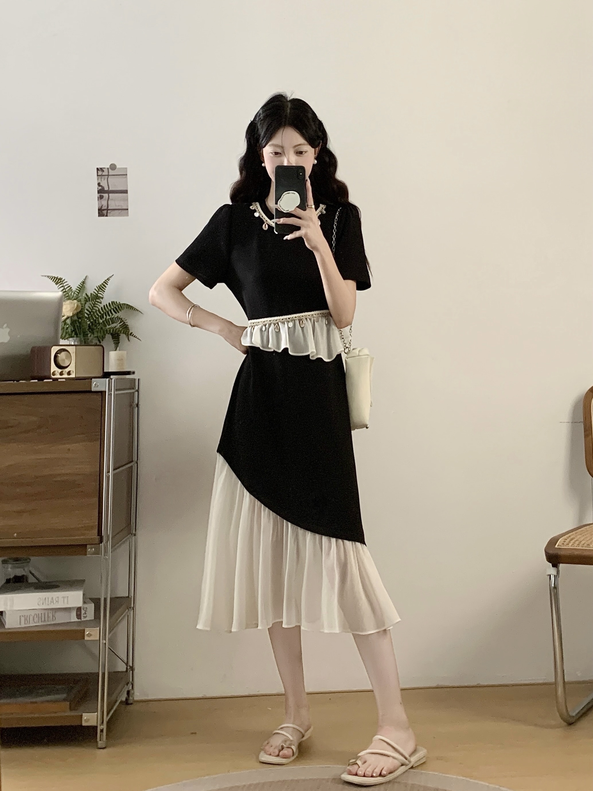 MY15597# 大码女装夏季法式小香风气质荷叶边收腰显瘦假两件连衣裙女裝貨源服裝批發