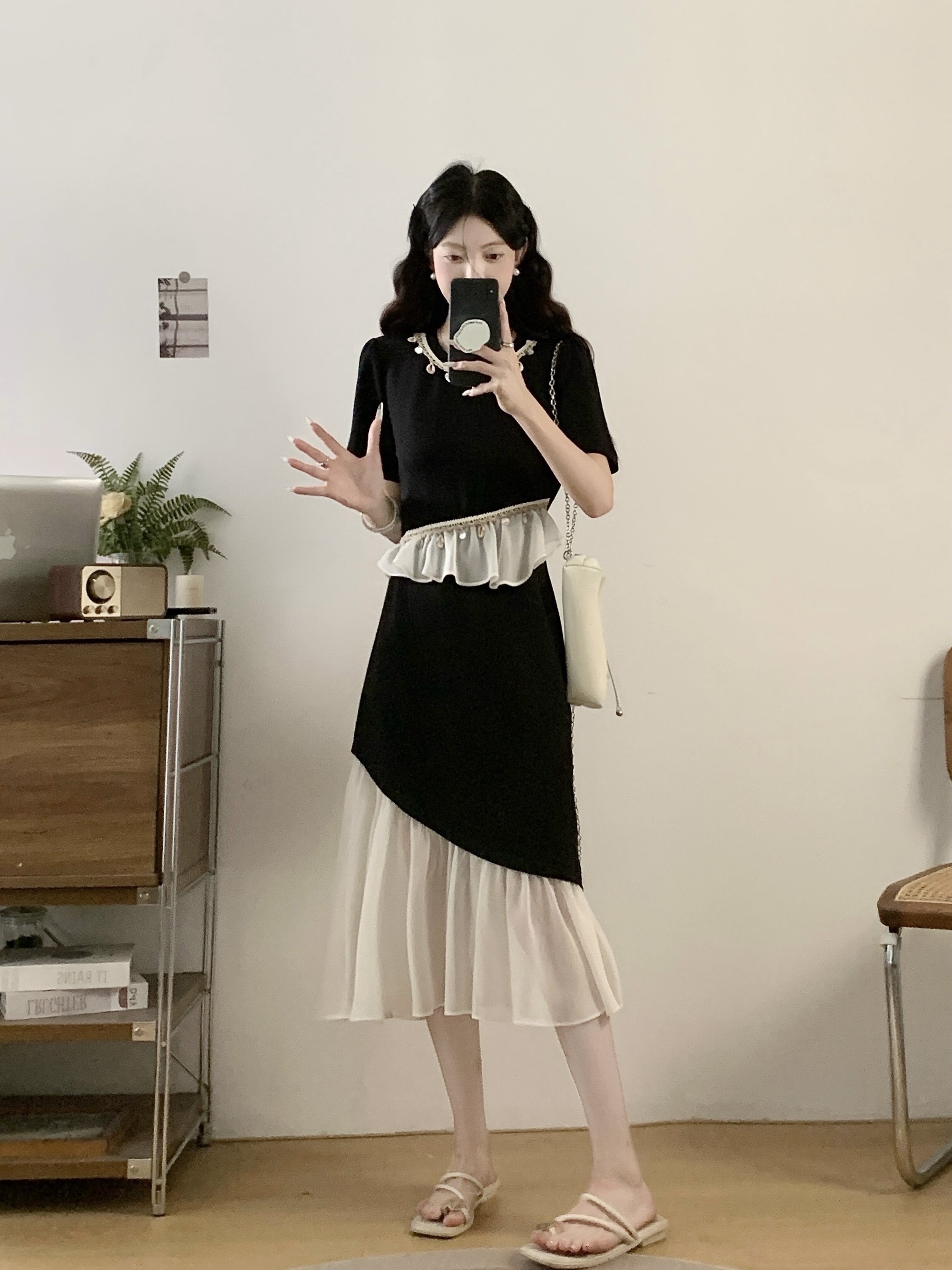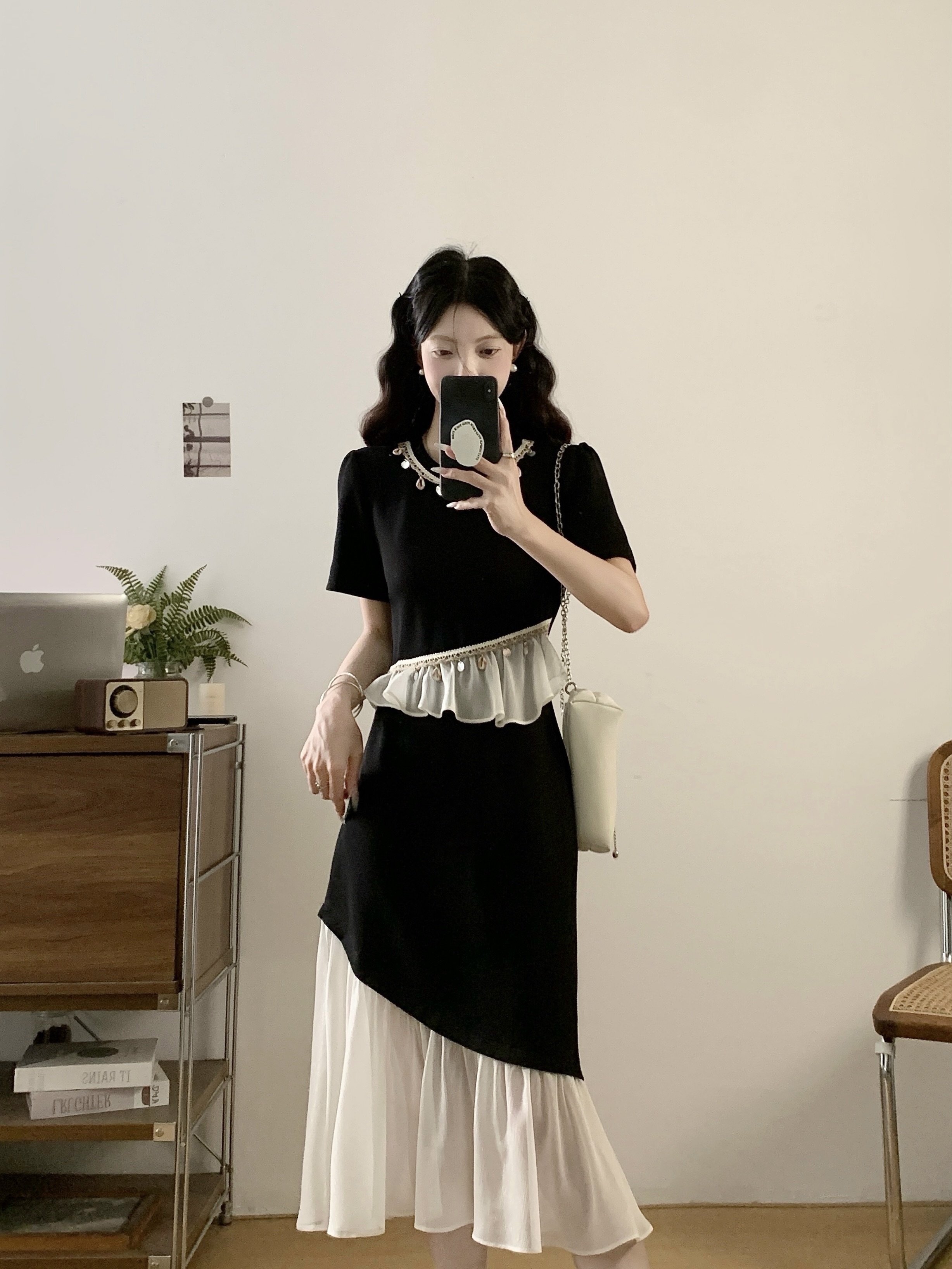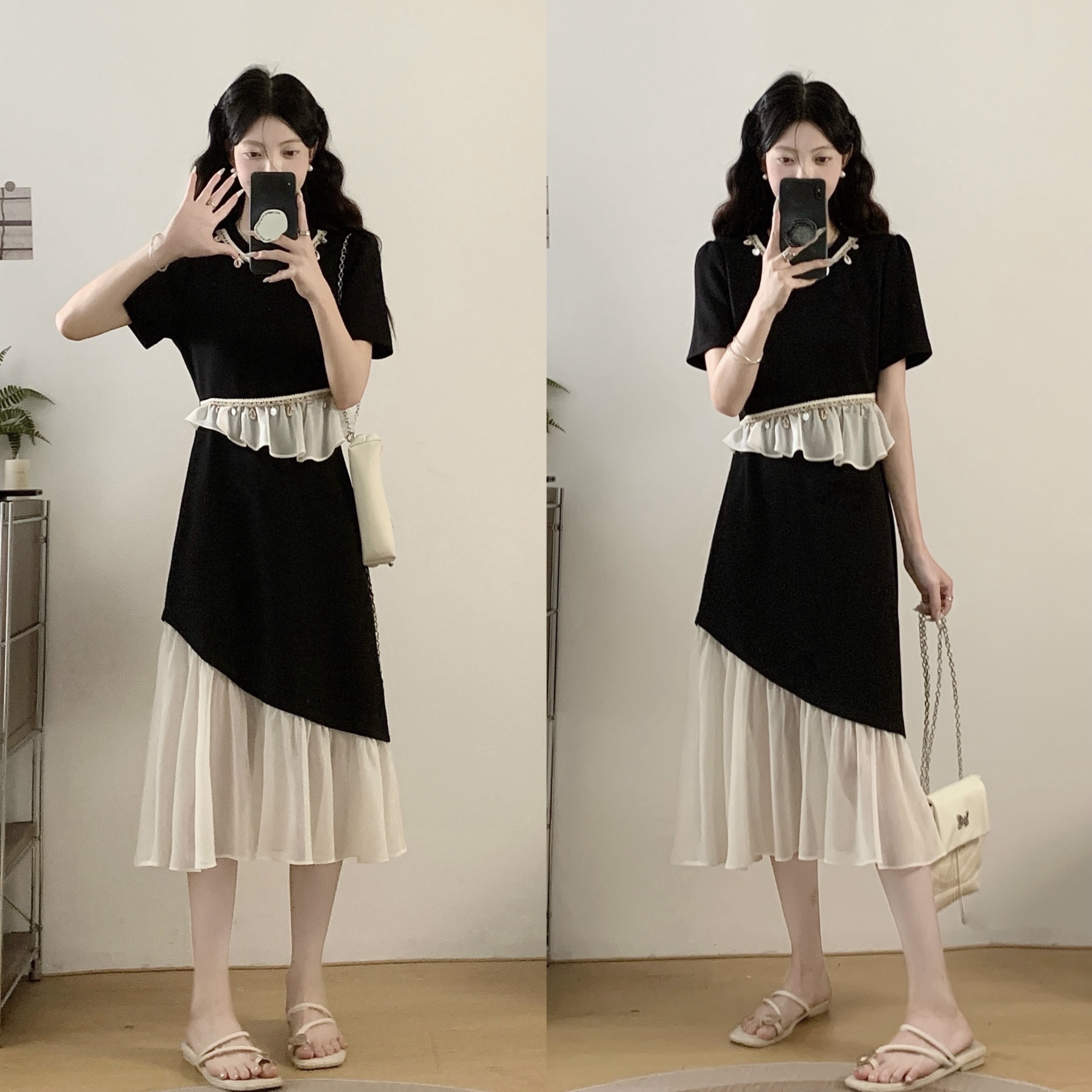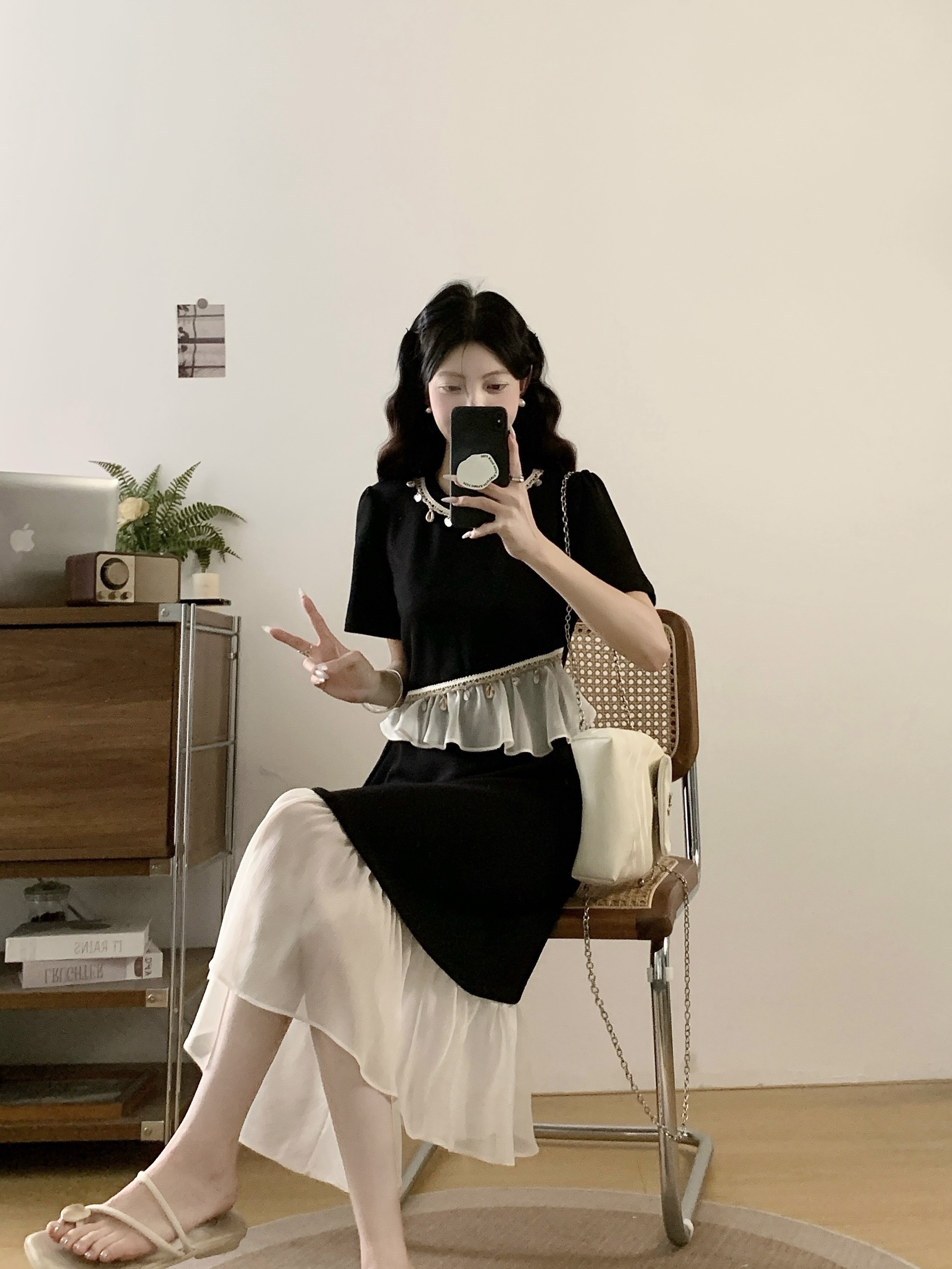 MY15597# 大码女装夏季法式小香风气质荷叶边收腰显瘦假两件连衣裙女裝貨源服裝批發