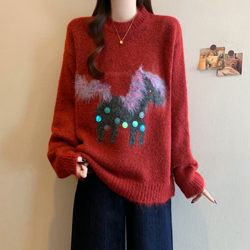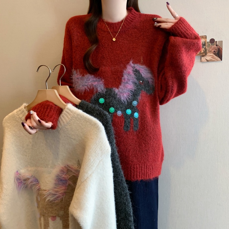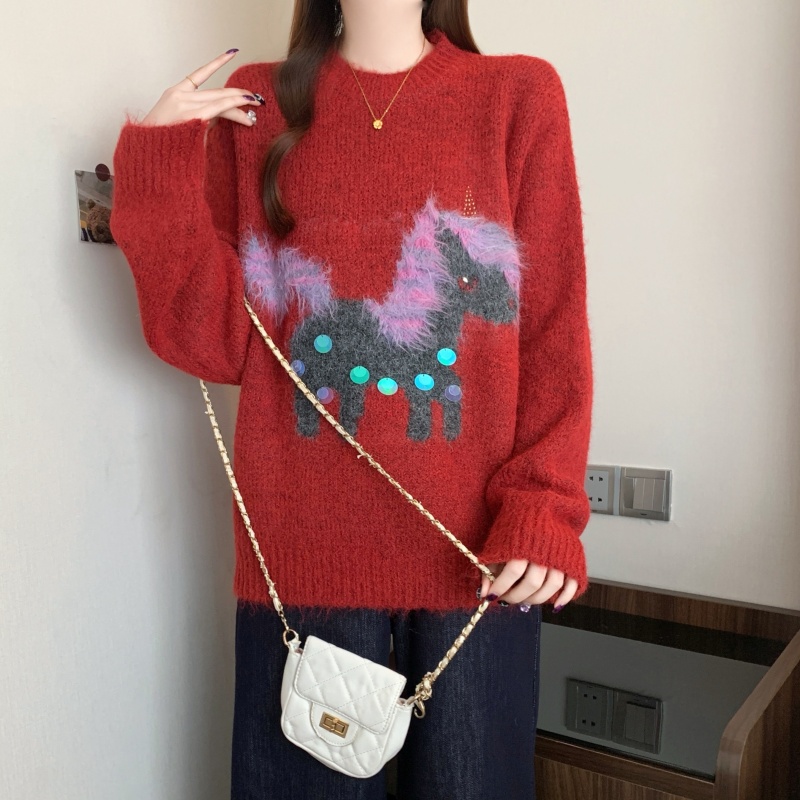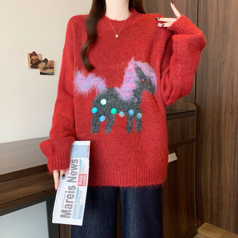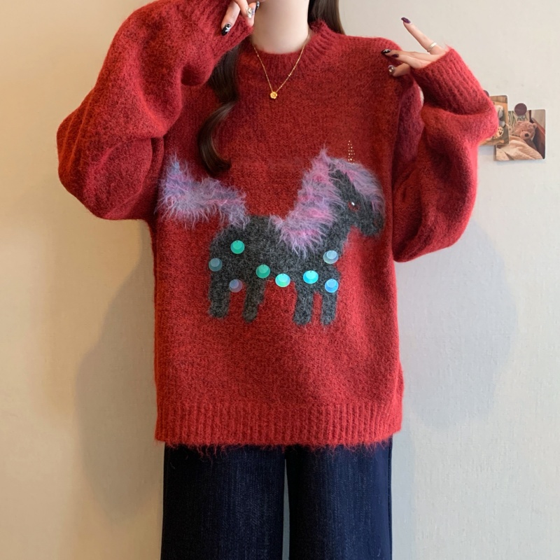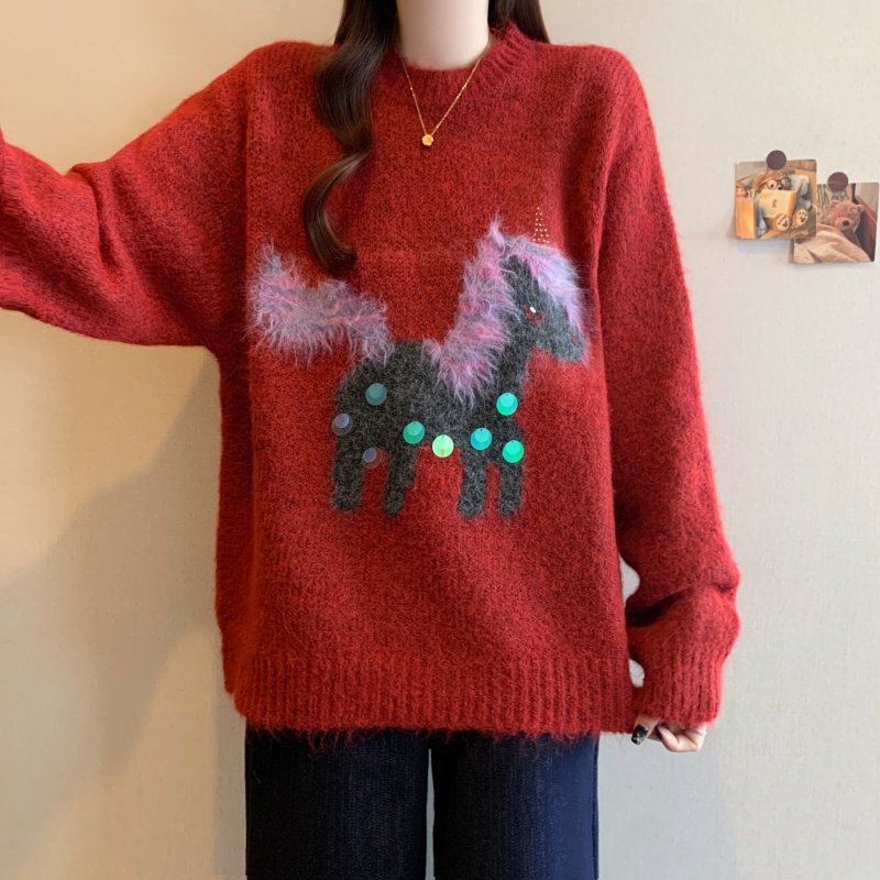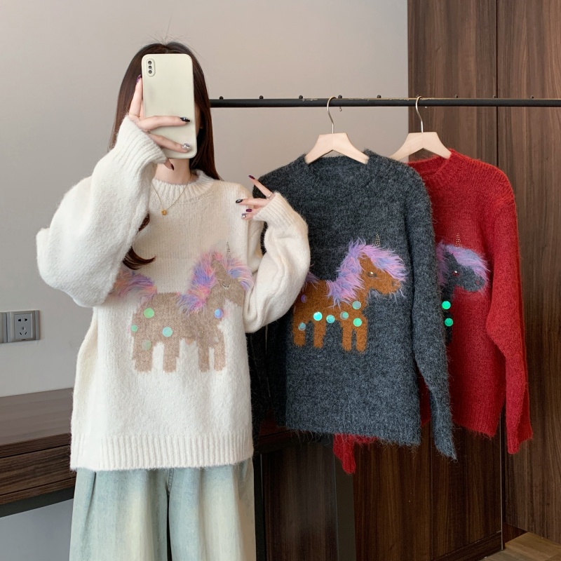 MY15600# 大码女装圣诞小马亮片新年毛衣胖MM时尚显瘦内搭针织上衣女裝貨源服裝批發