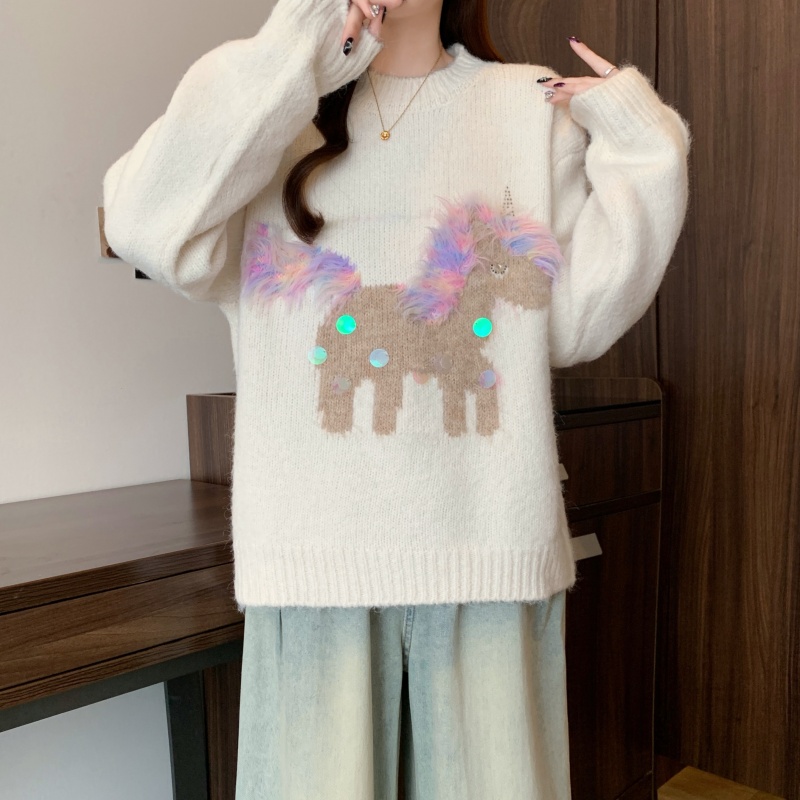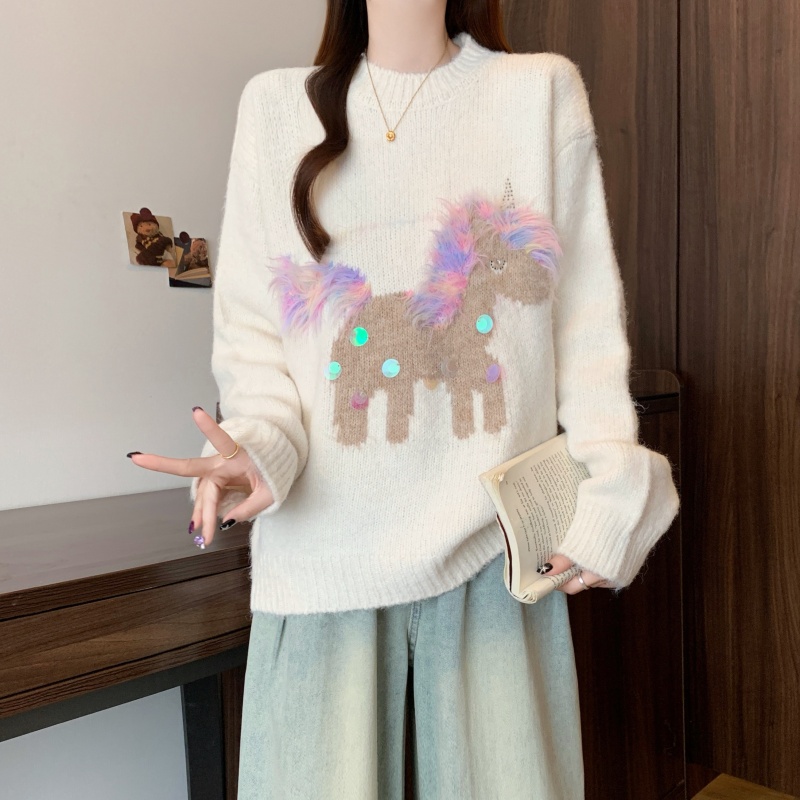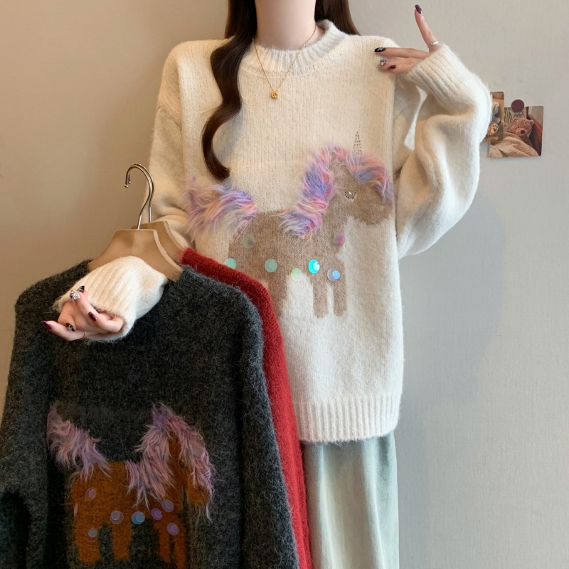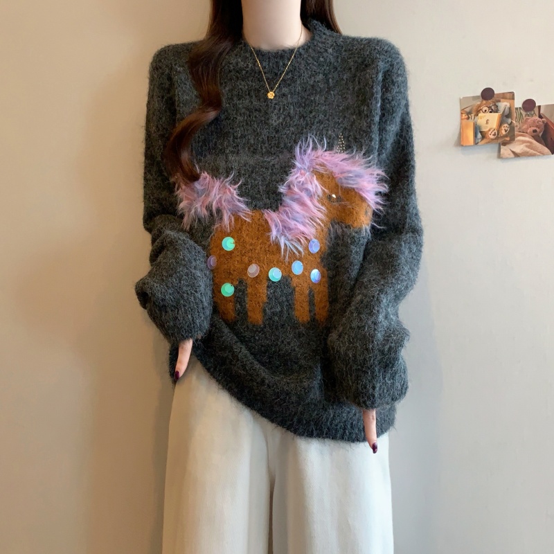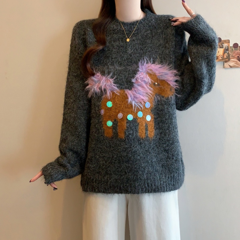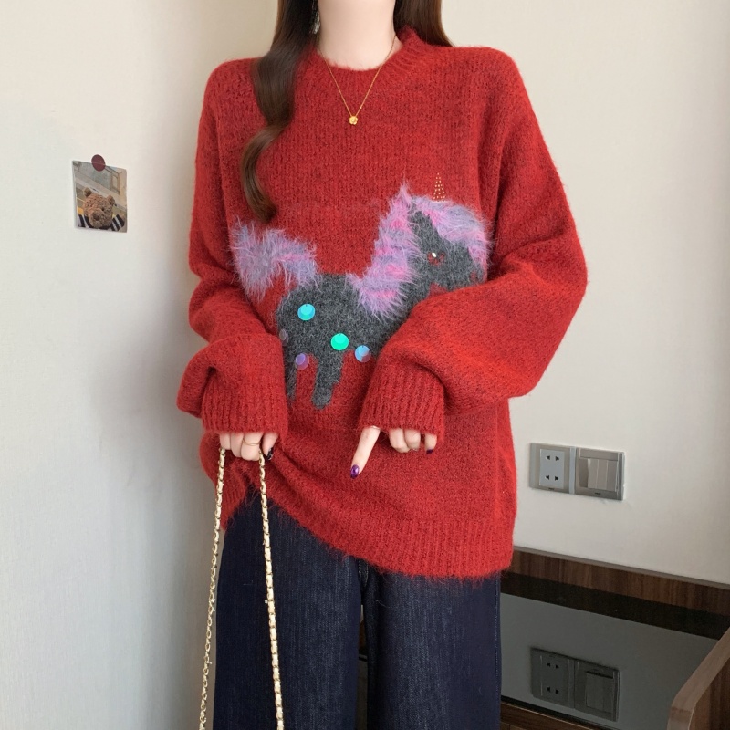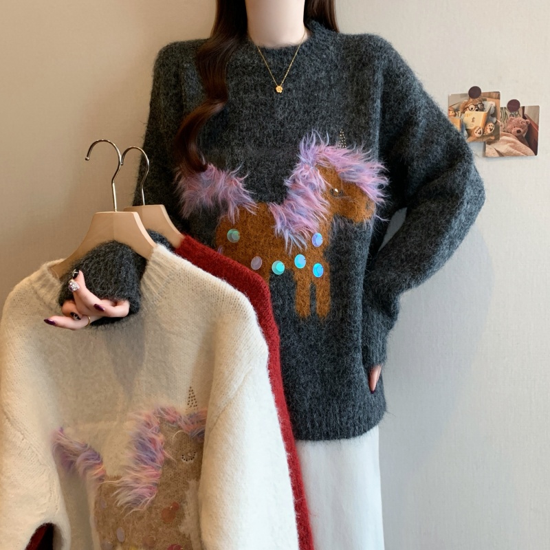 MY15600# 大码女装圣诞小马亮片新年毛衣胖MM时尚显瘦内搭针织上衣女裝貨源服裝批發