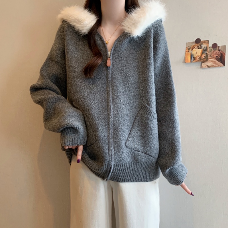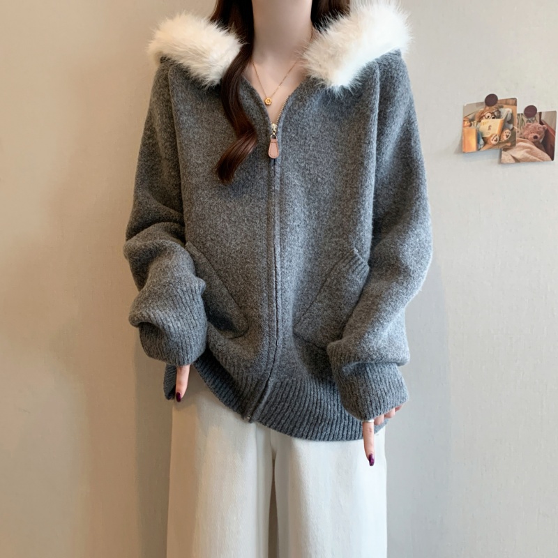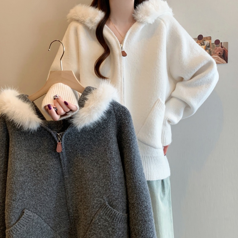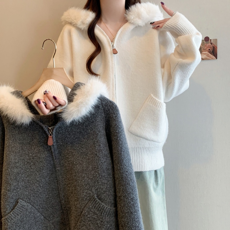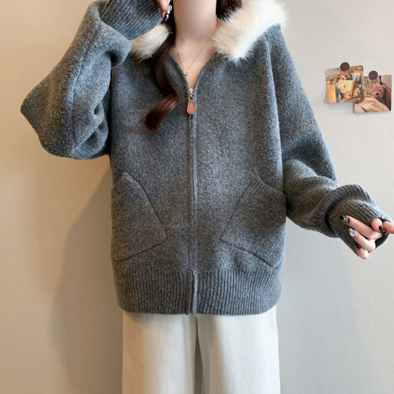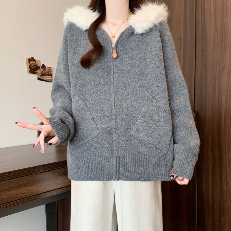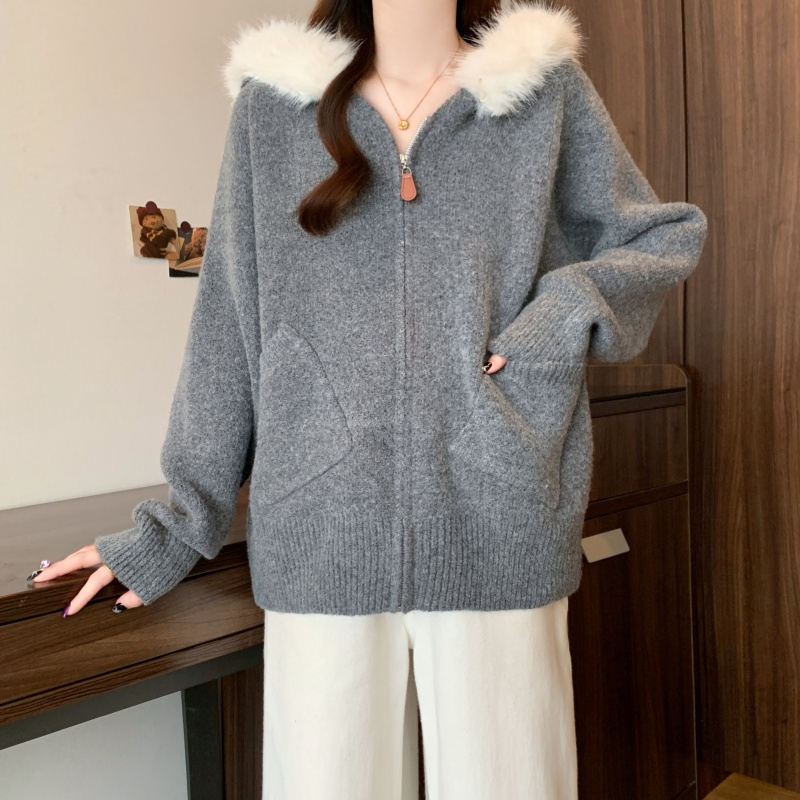 MY15602# 大码女装胖MM冬季毛领连帽毛衣开衫时尚减龄慵懒加厚针织外套女裝貨源服裝批發