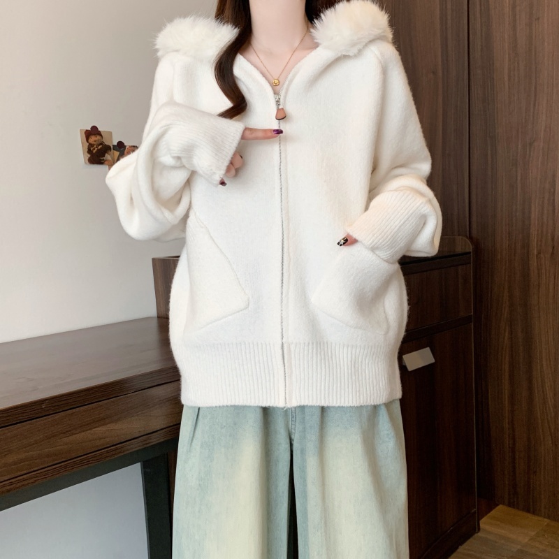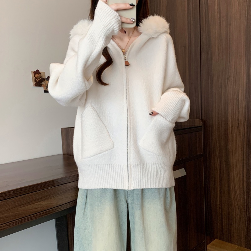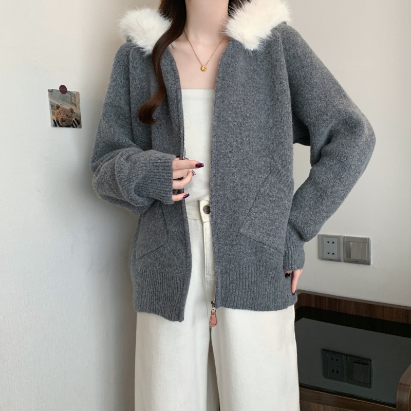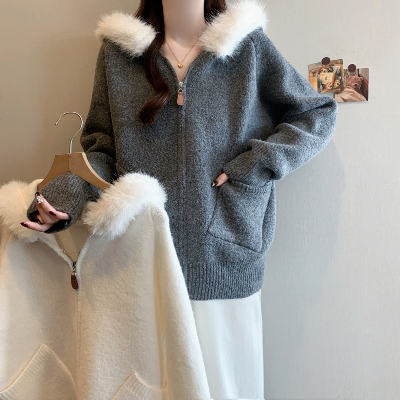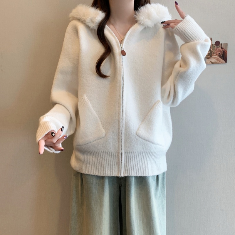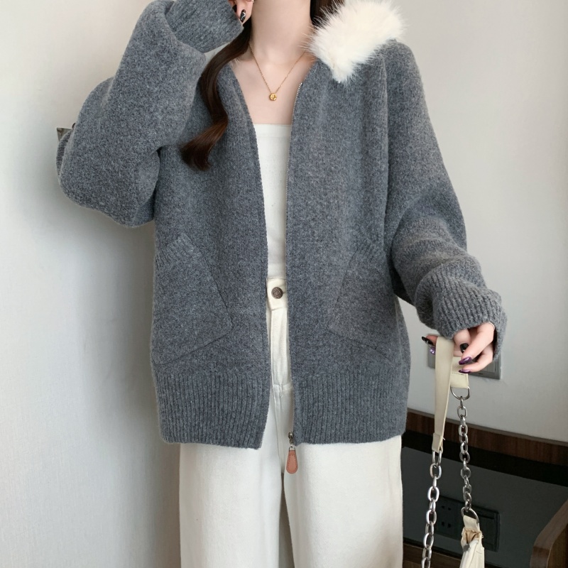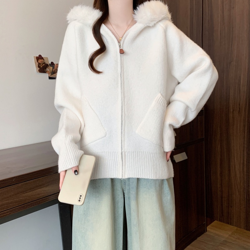 MY15602# 大码女装胖MM冬季毛领连帽毛衣开衫时尚减龄慵懒加厚针织外套女裝貨源服裝批發