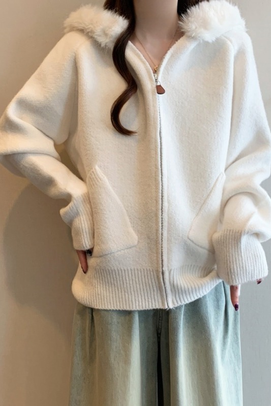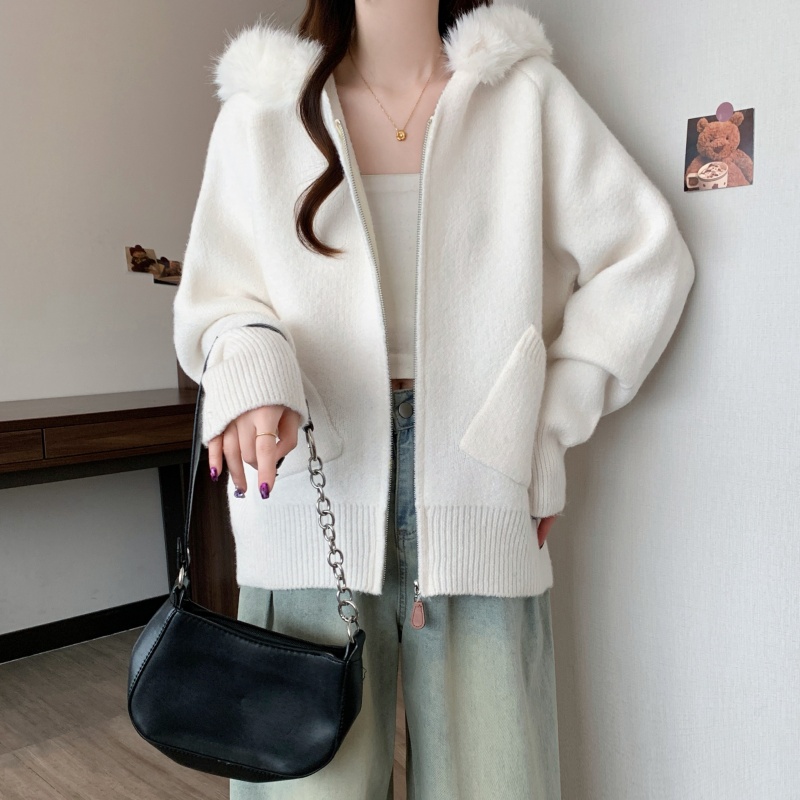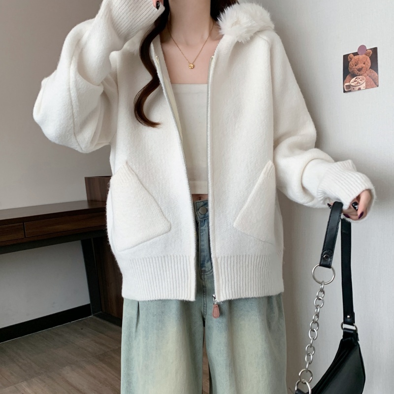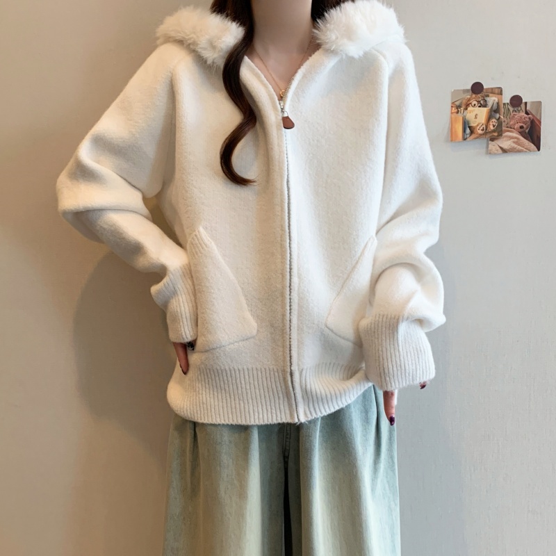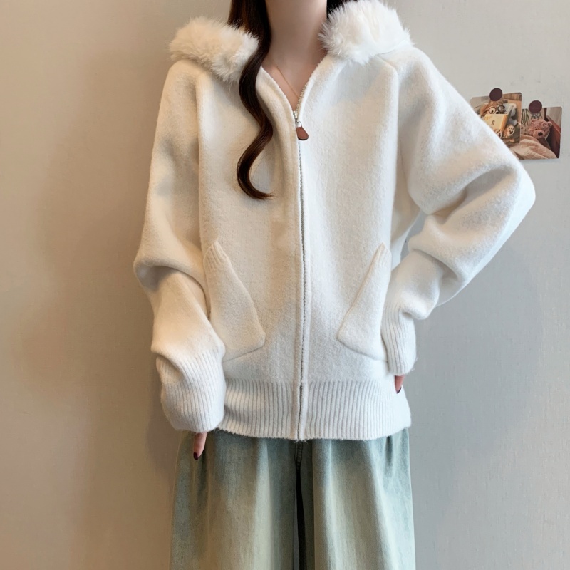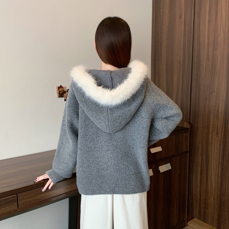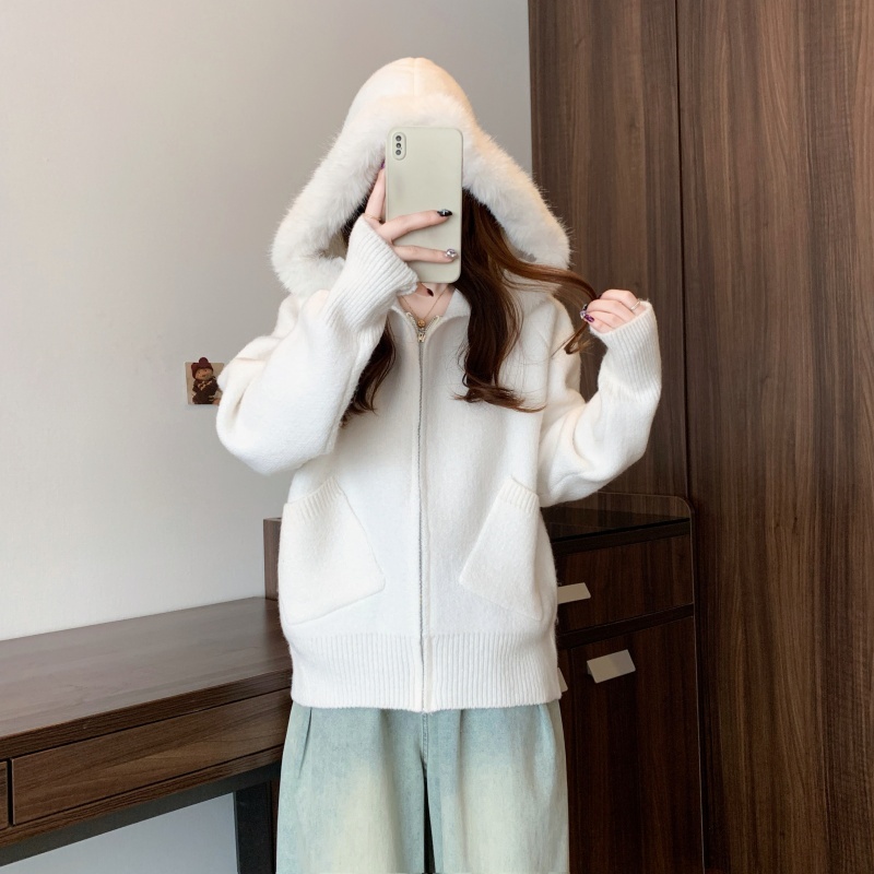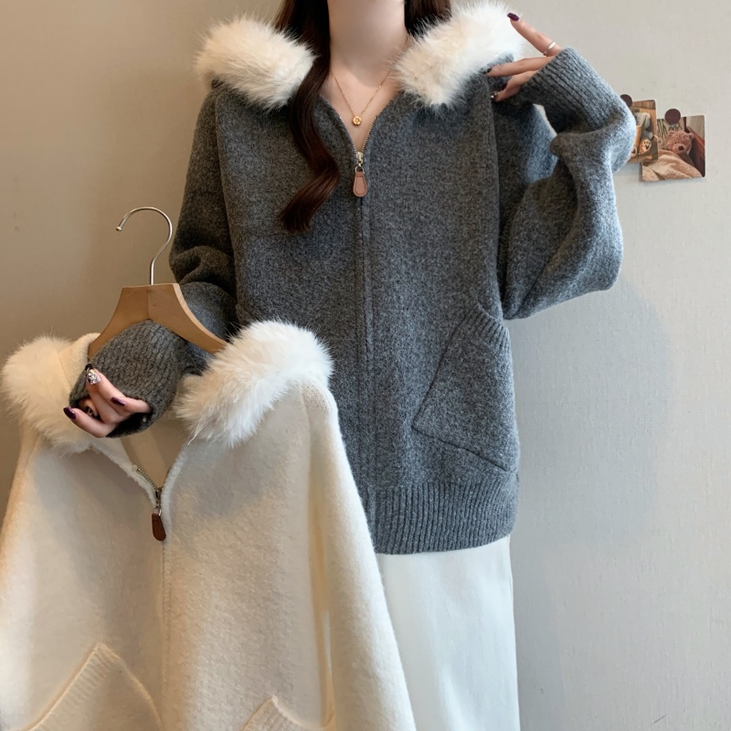 MY15602# 大码女装胖MM冬季毛领连帽毛衣开衫时尚减龄慵懒加厚针织外套女裝貨源服裝批發