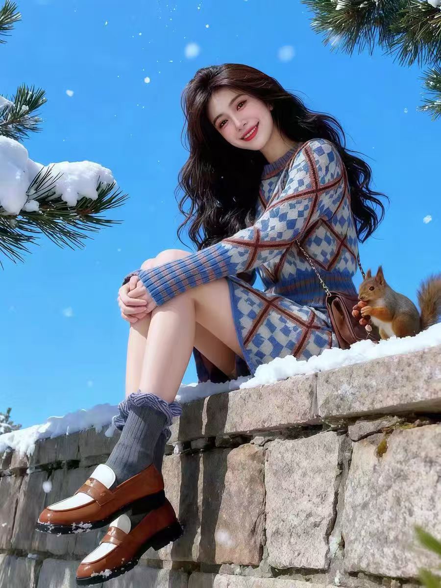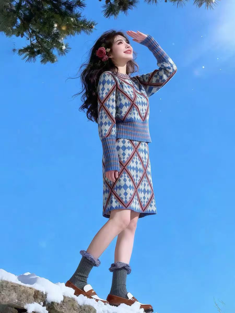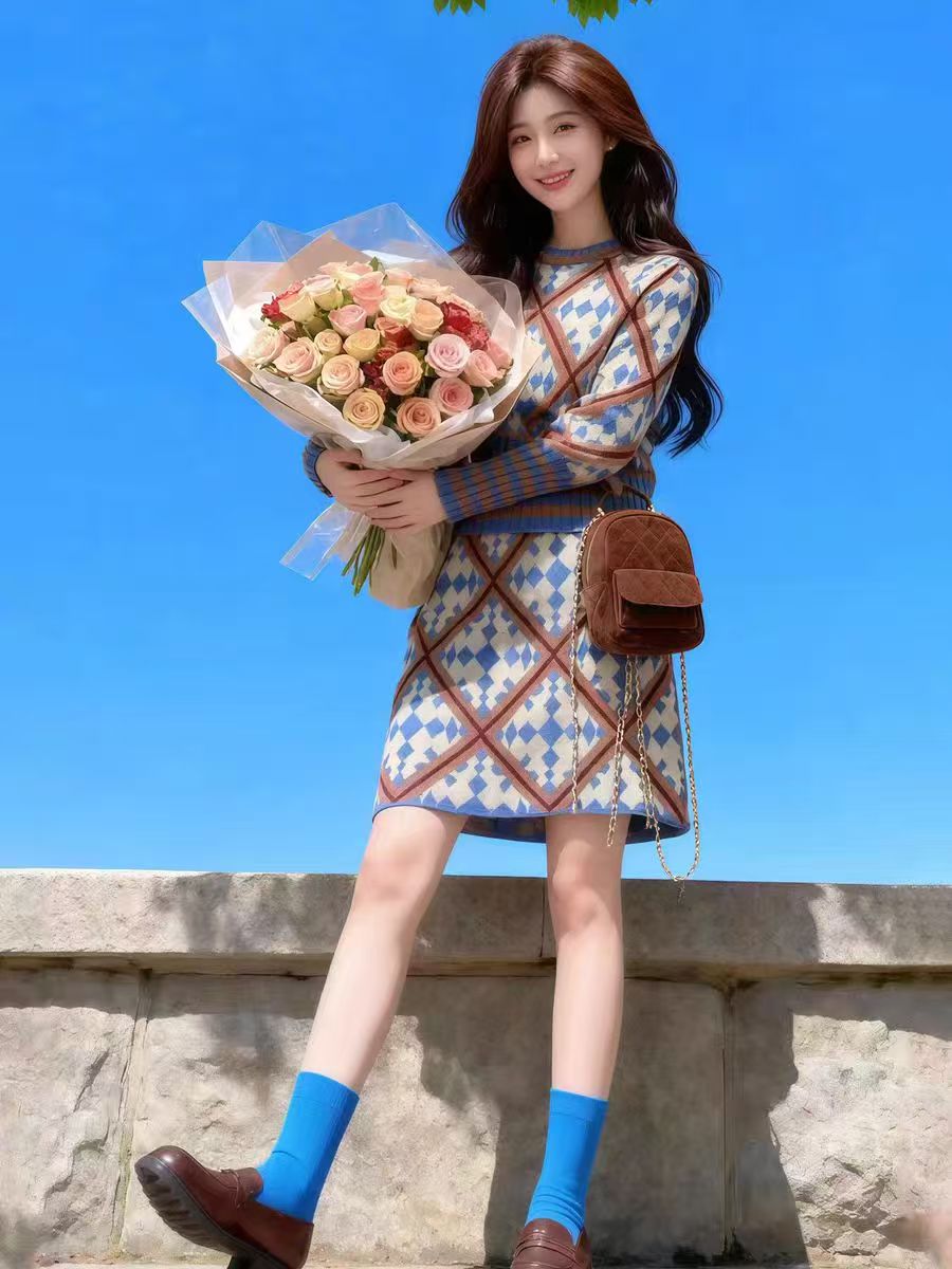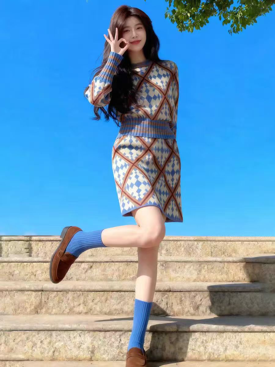 MY15620# 韩系一整套深冬穿搭毛衣短裙女小个子针织衫格纹半裙两件套装女裝貨源服裝批發