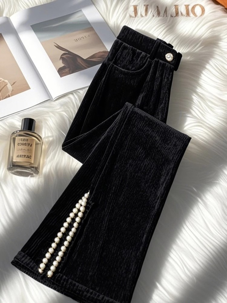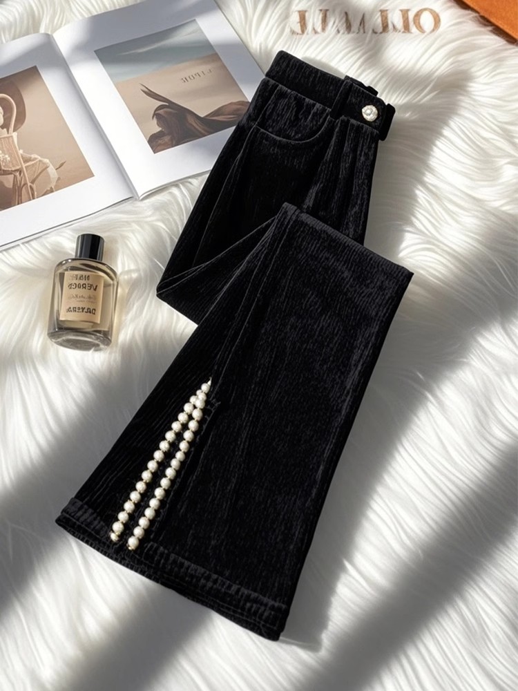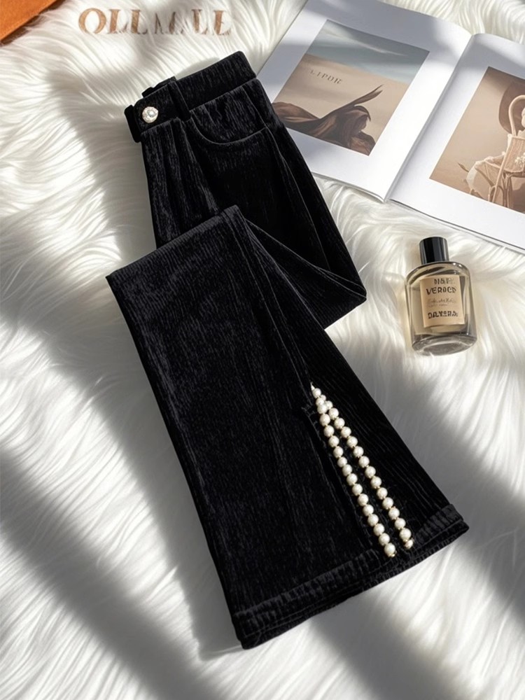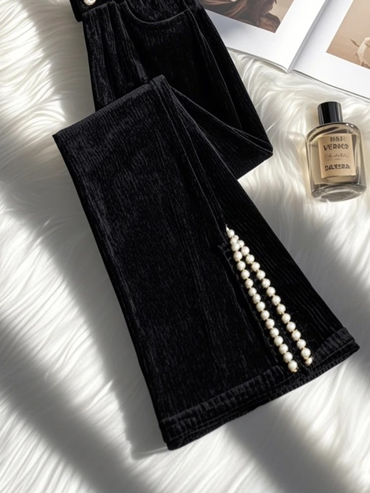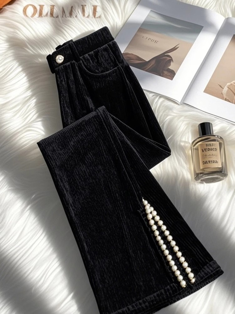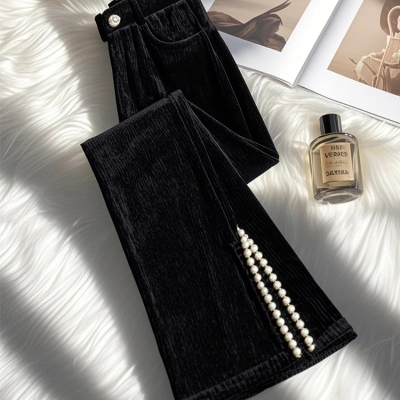 MY15628# 新款爆款小个子独特别致黑色侧开叉灯芯绒微喇裤女冬女裝貨源服裝批發