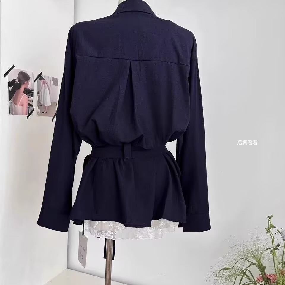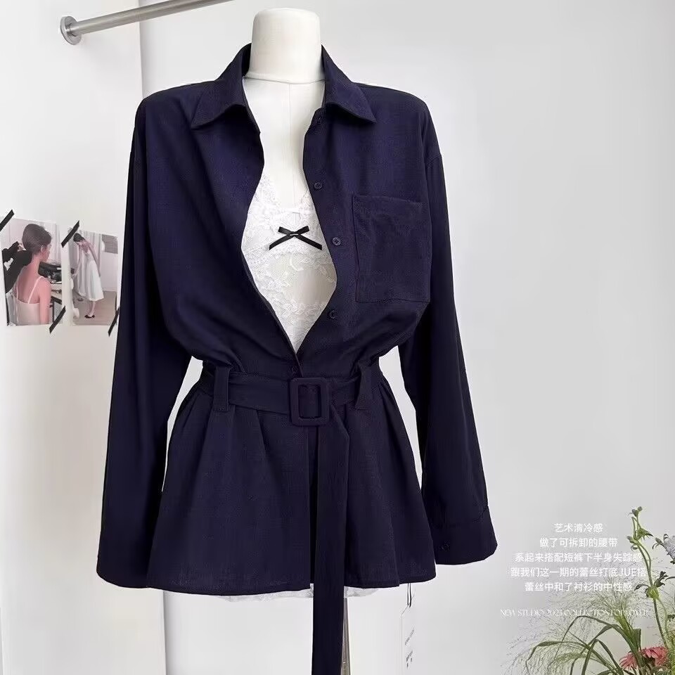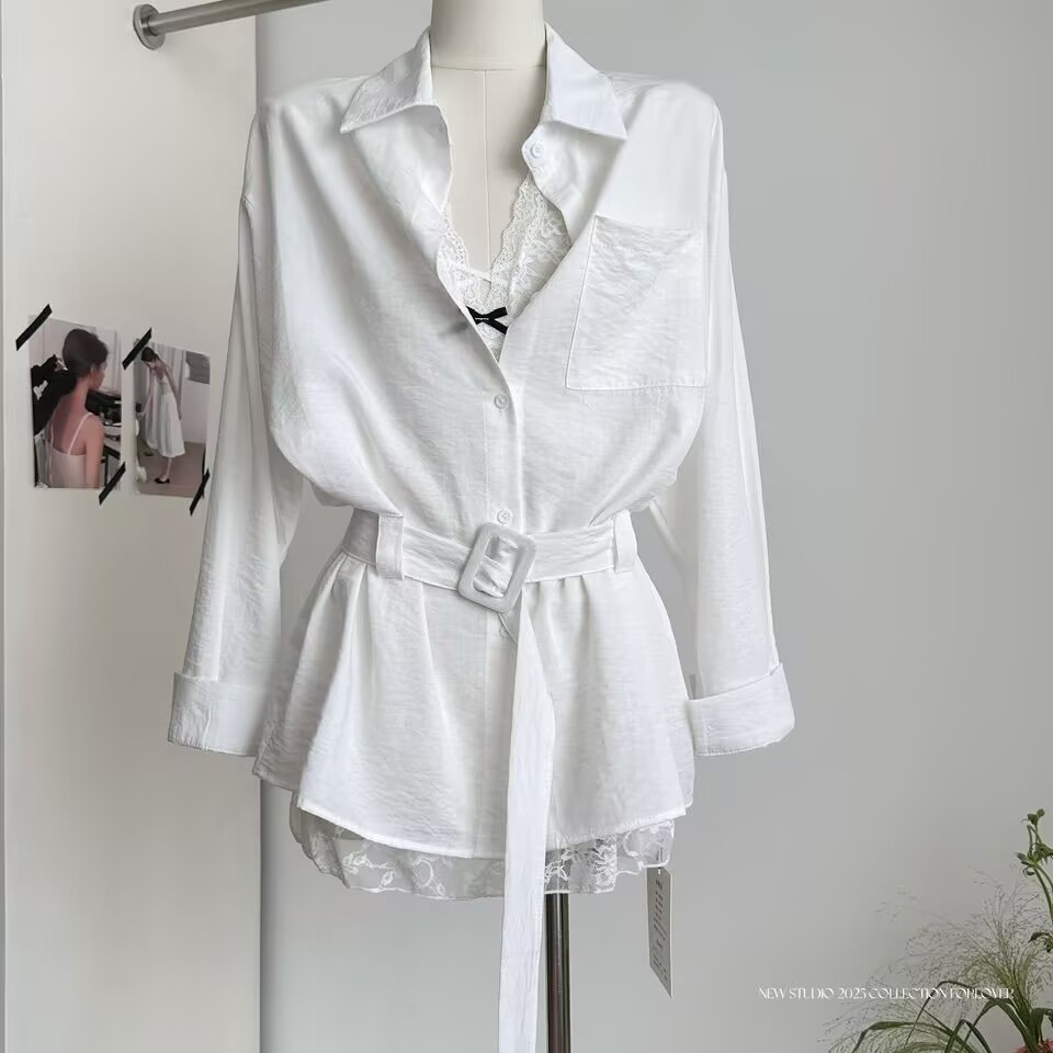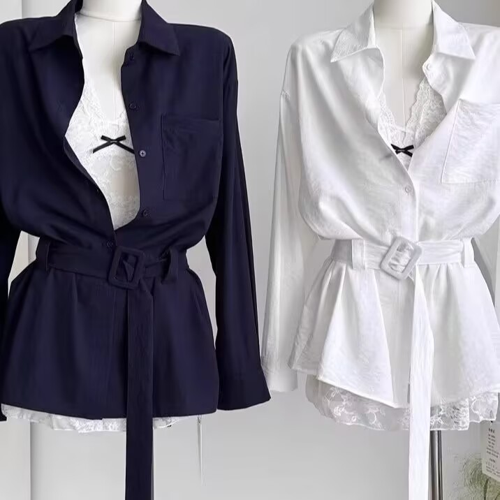 MY15651# 纯欲风穿搭衬衫翻领收腰显瘦衬衫裙绑带时尚辣妹上衣女女裝貨源服裝批發