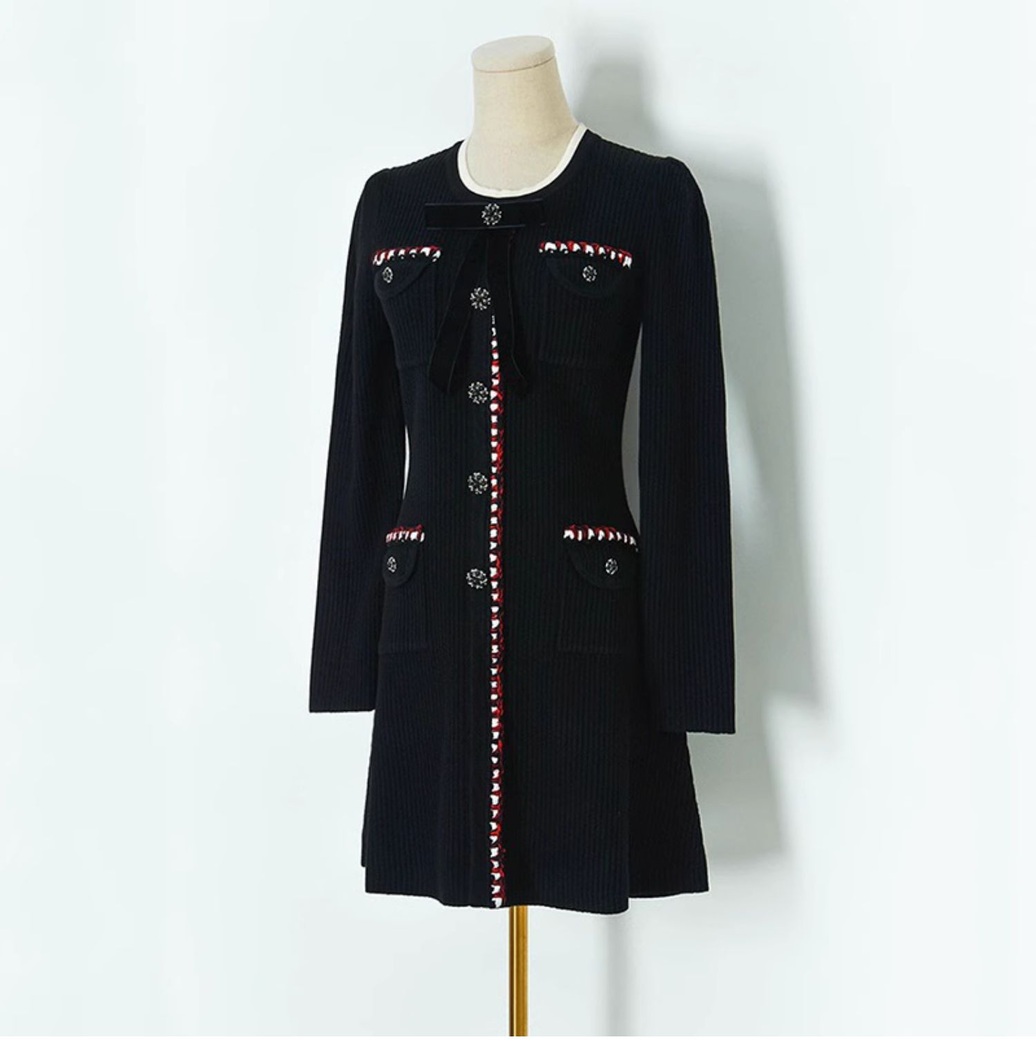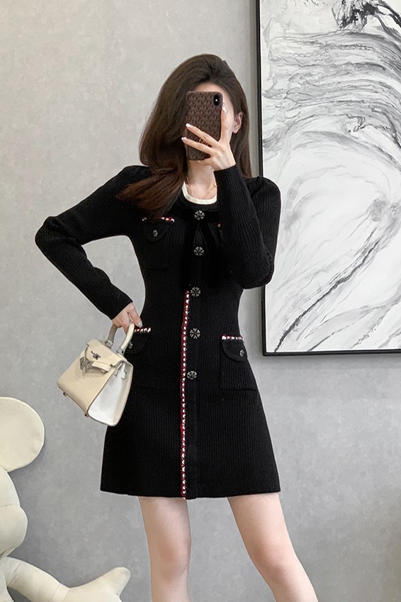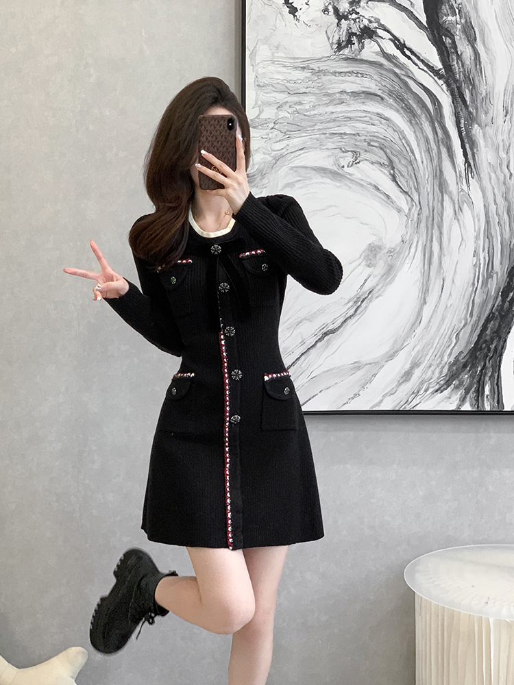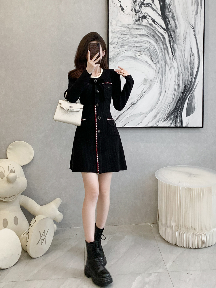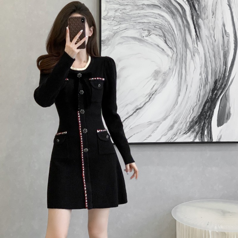 MY15656# 新款法式名媛赫本风高级感气质收腰显瘦黑色针织连衣裙女女裝貨源服裝批發