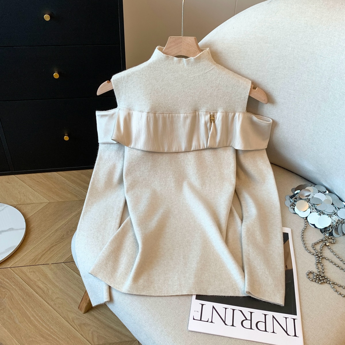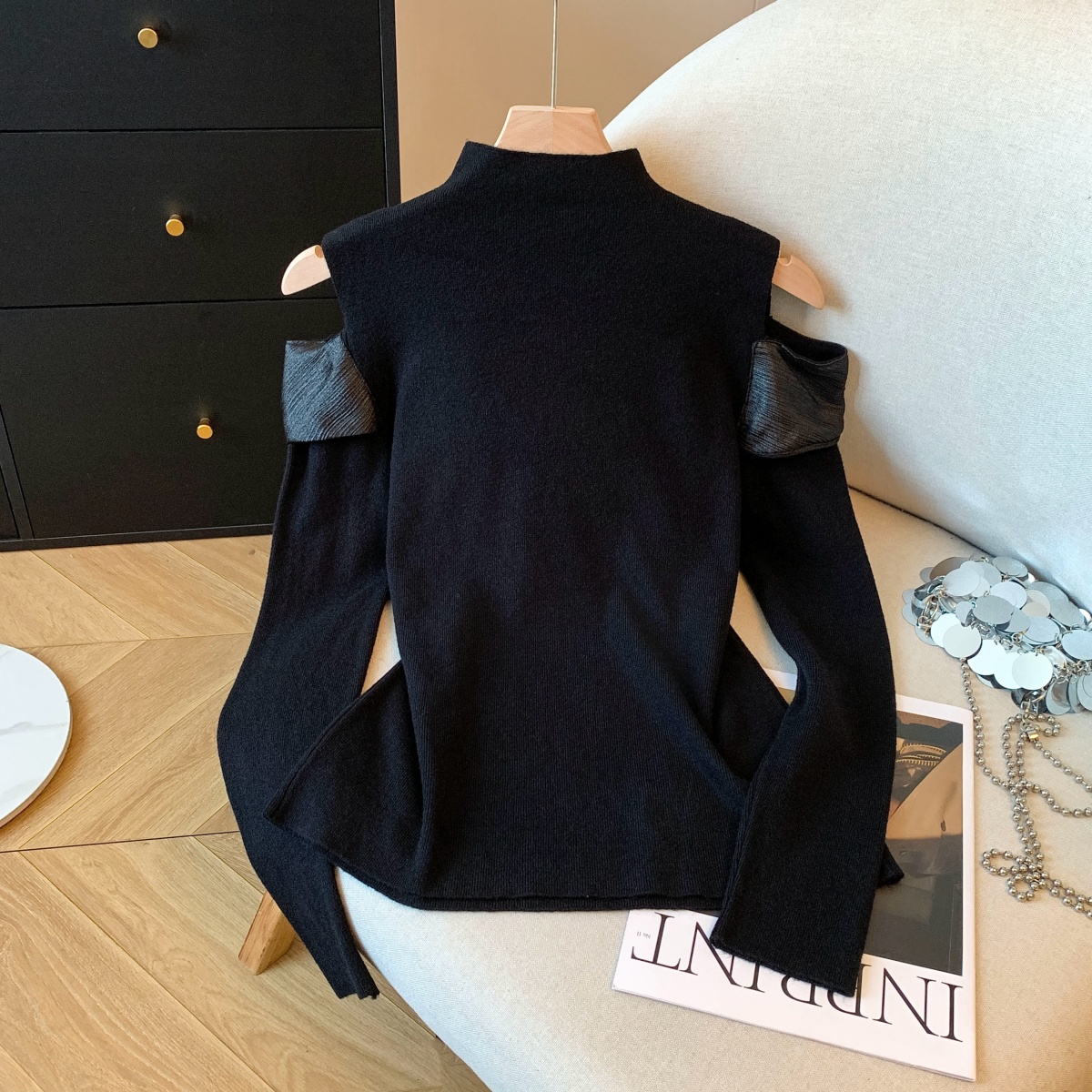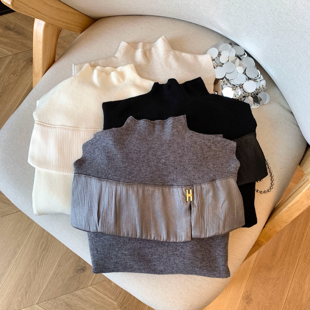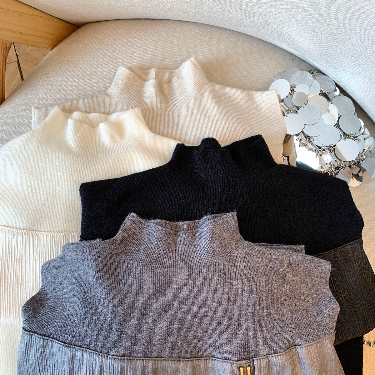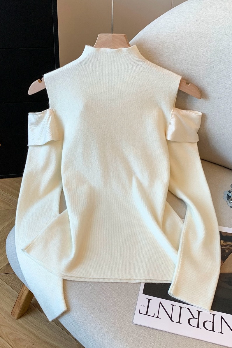 MY15658# 新款打底露肩针织衫缎面拼接荷叶边内搭毛衣半高领女裝貨源服裝批發
