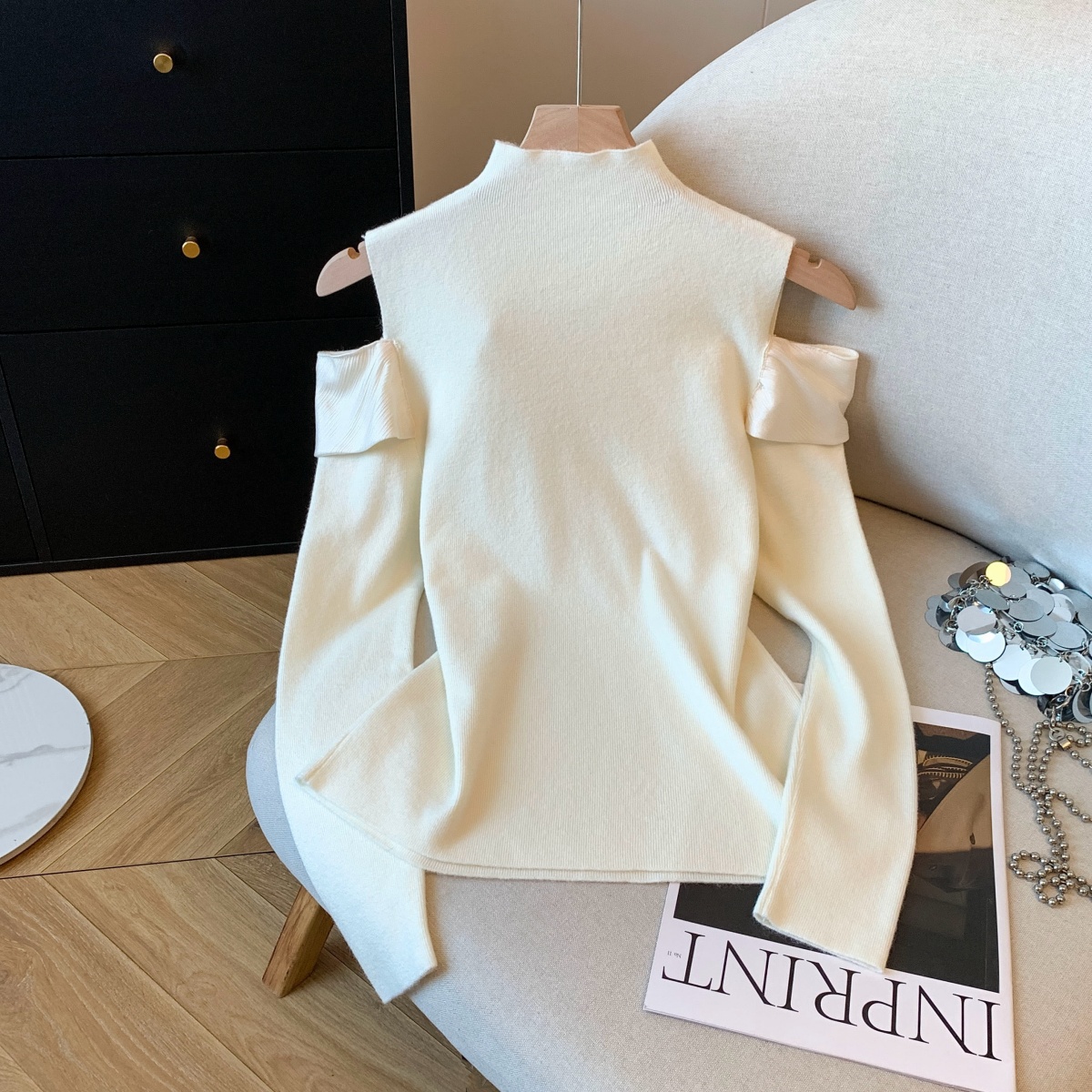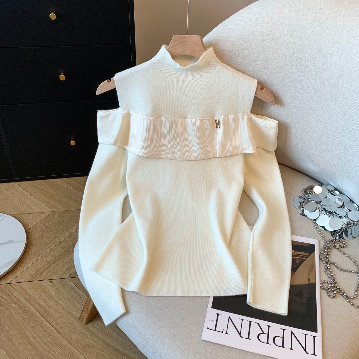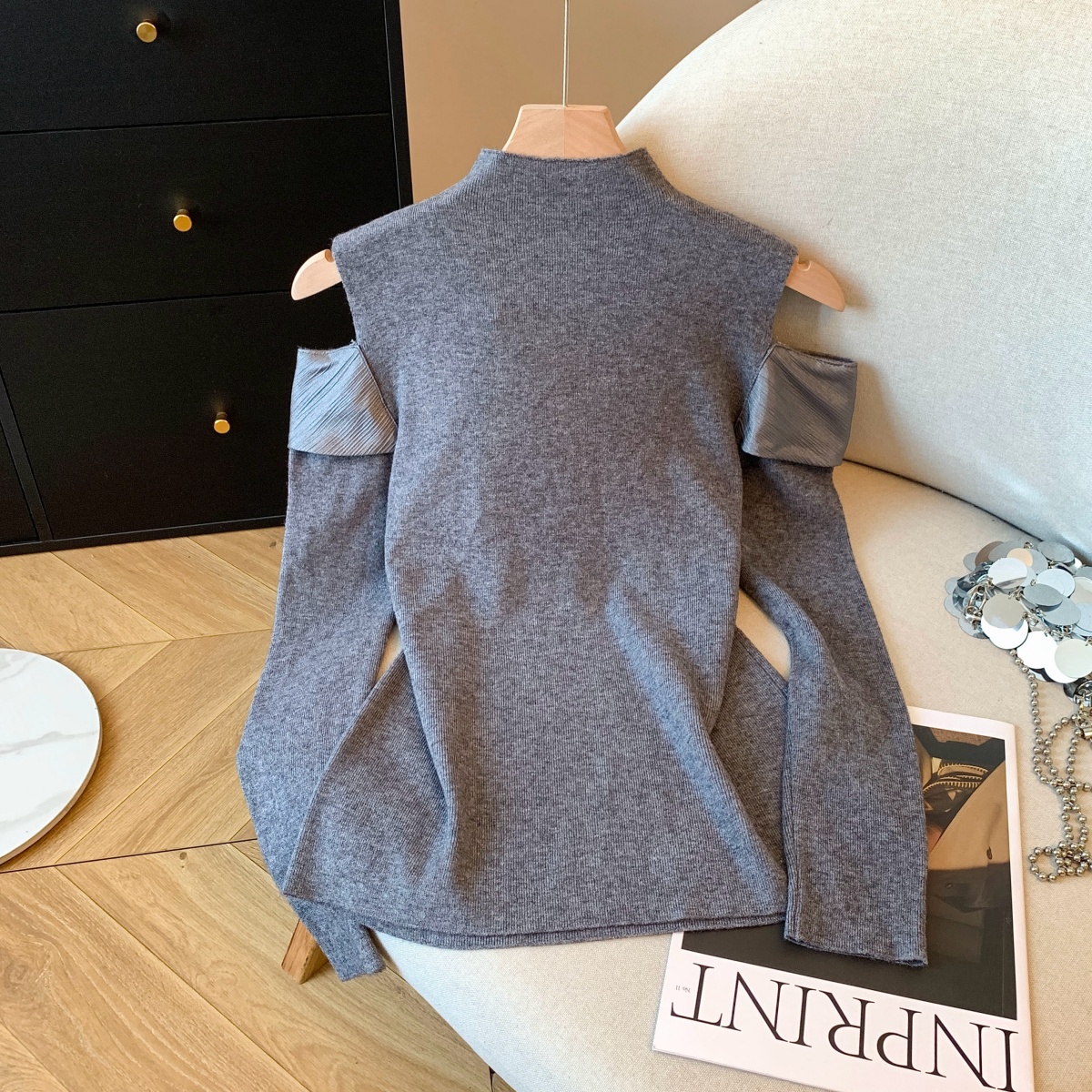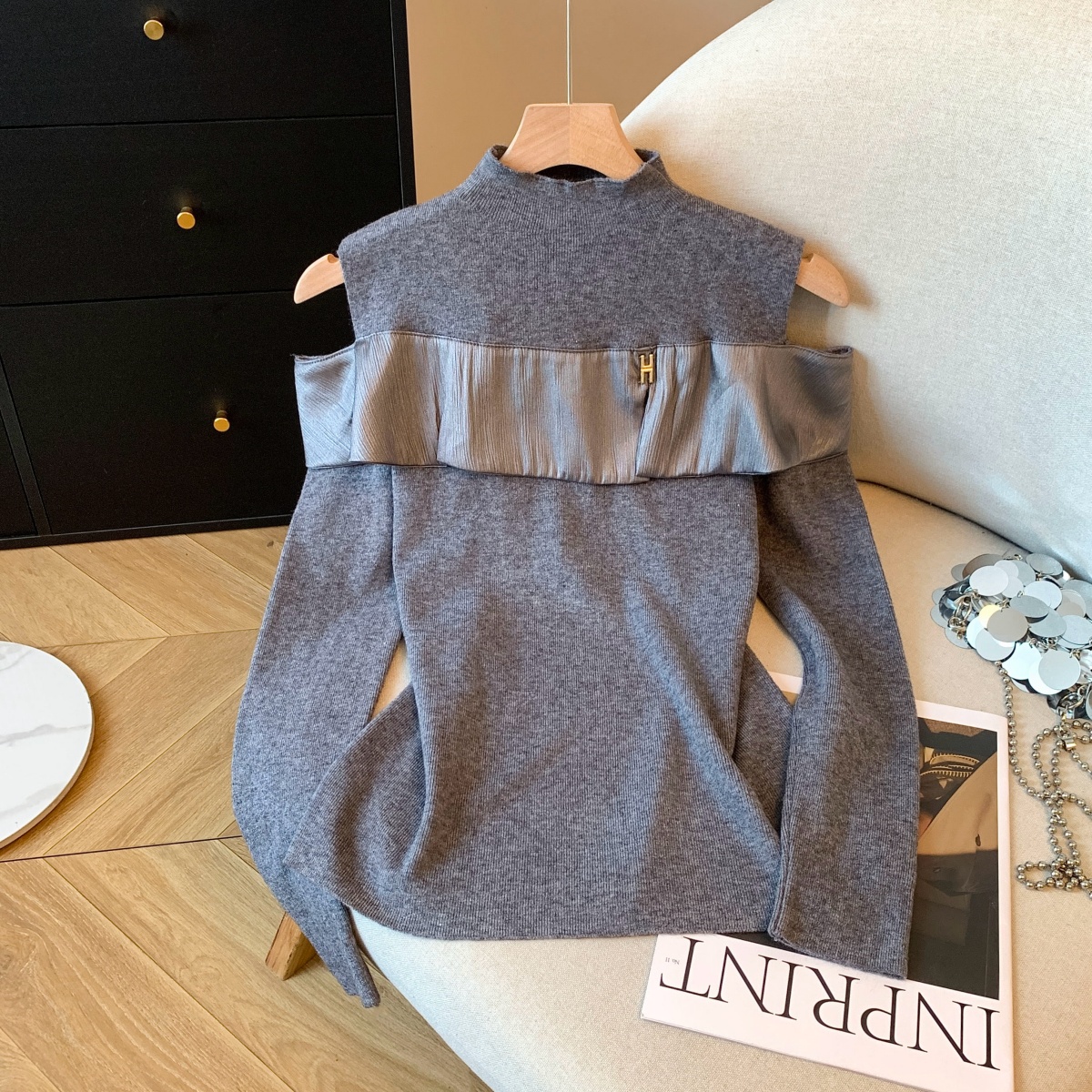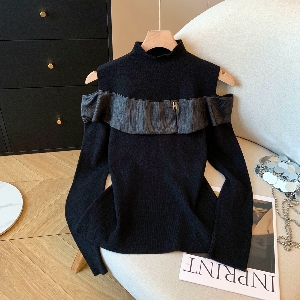 MY15658# 新款打底露肩针织衫缎面拼接荷叶边内搭毛衣半高领女裝貨源服裝批發