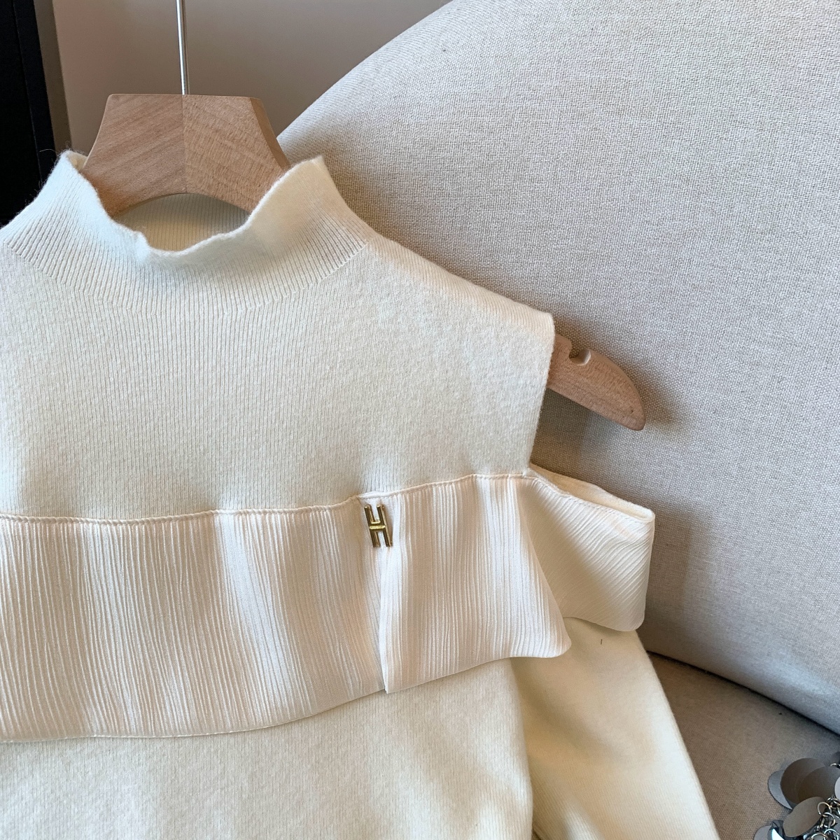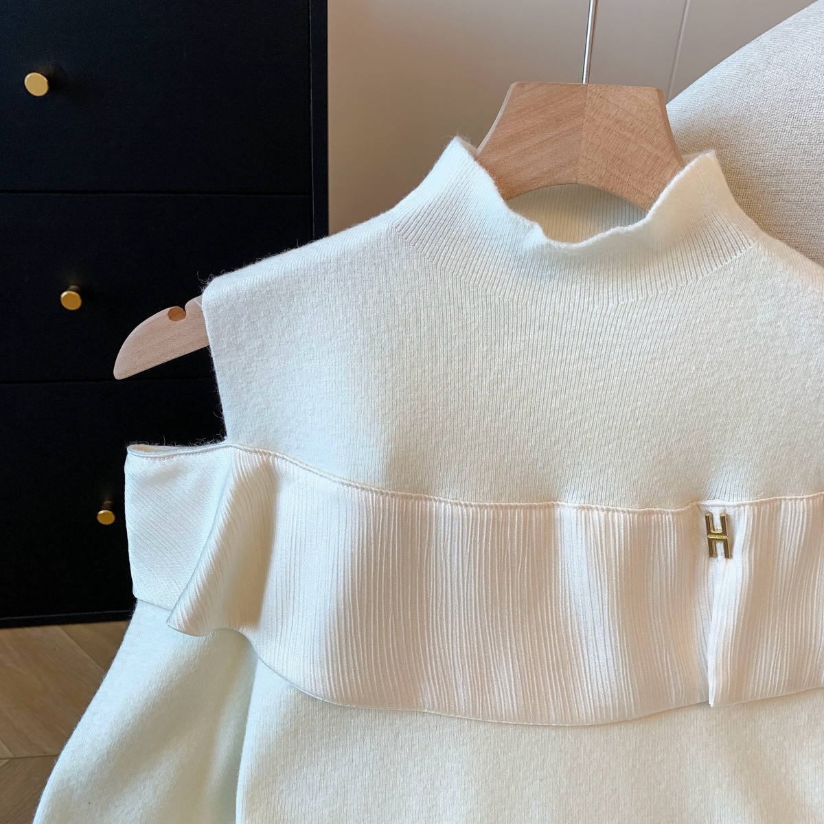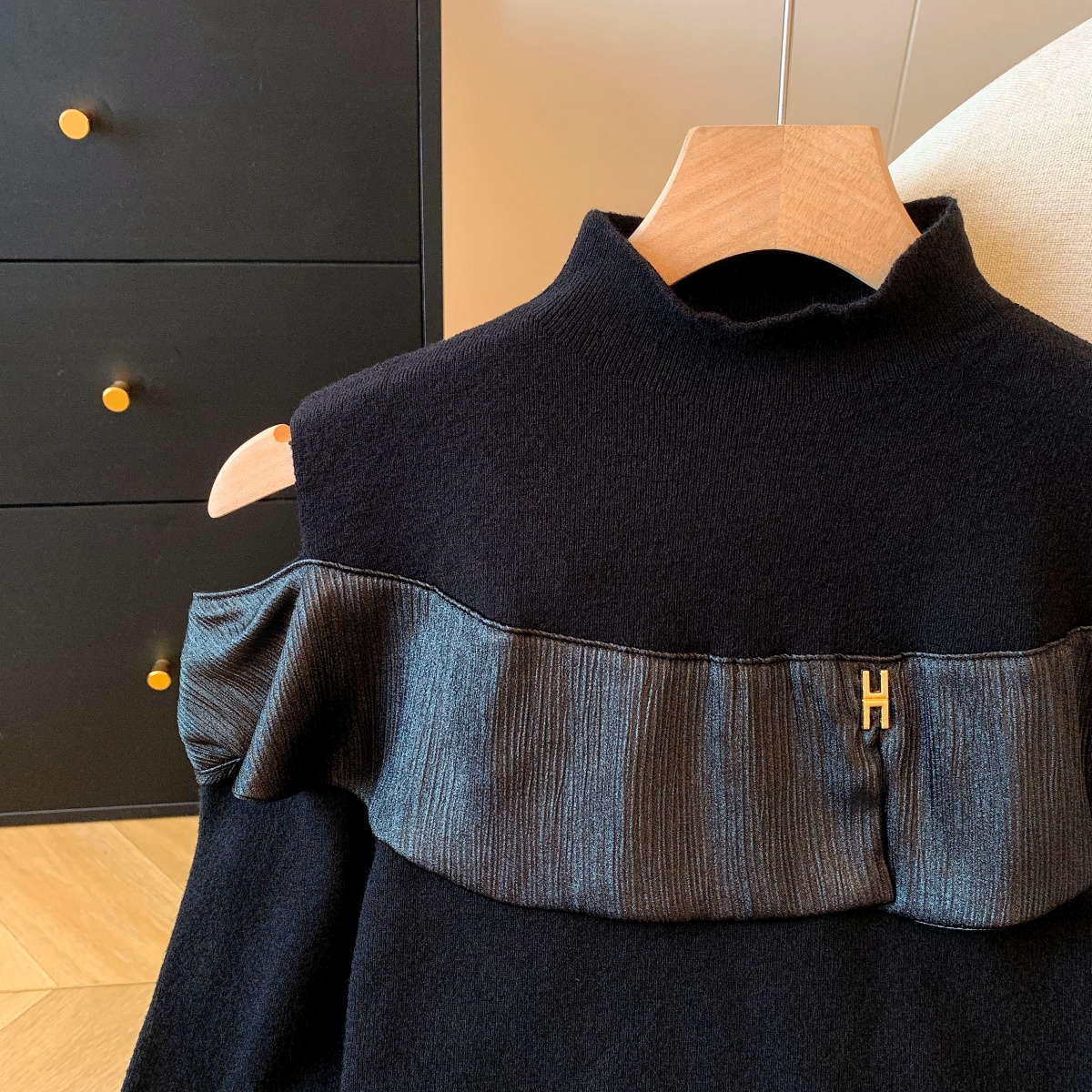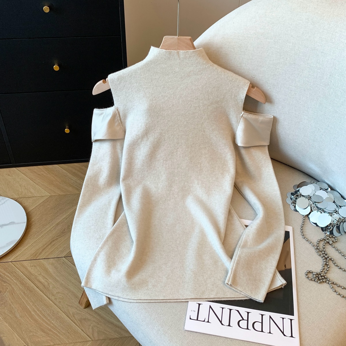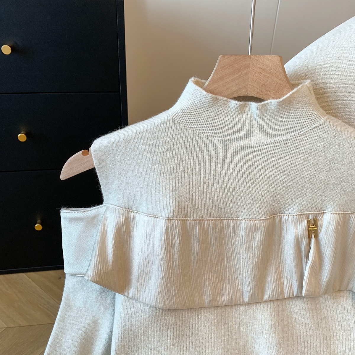 MY15658# 新款打底露肩针织衫缎面拼接荷叶边内搭毛衣半高领女裝貨源服裝批發