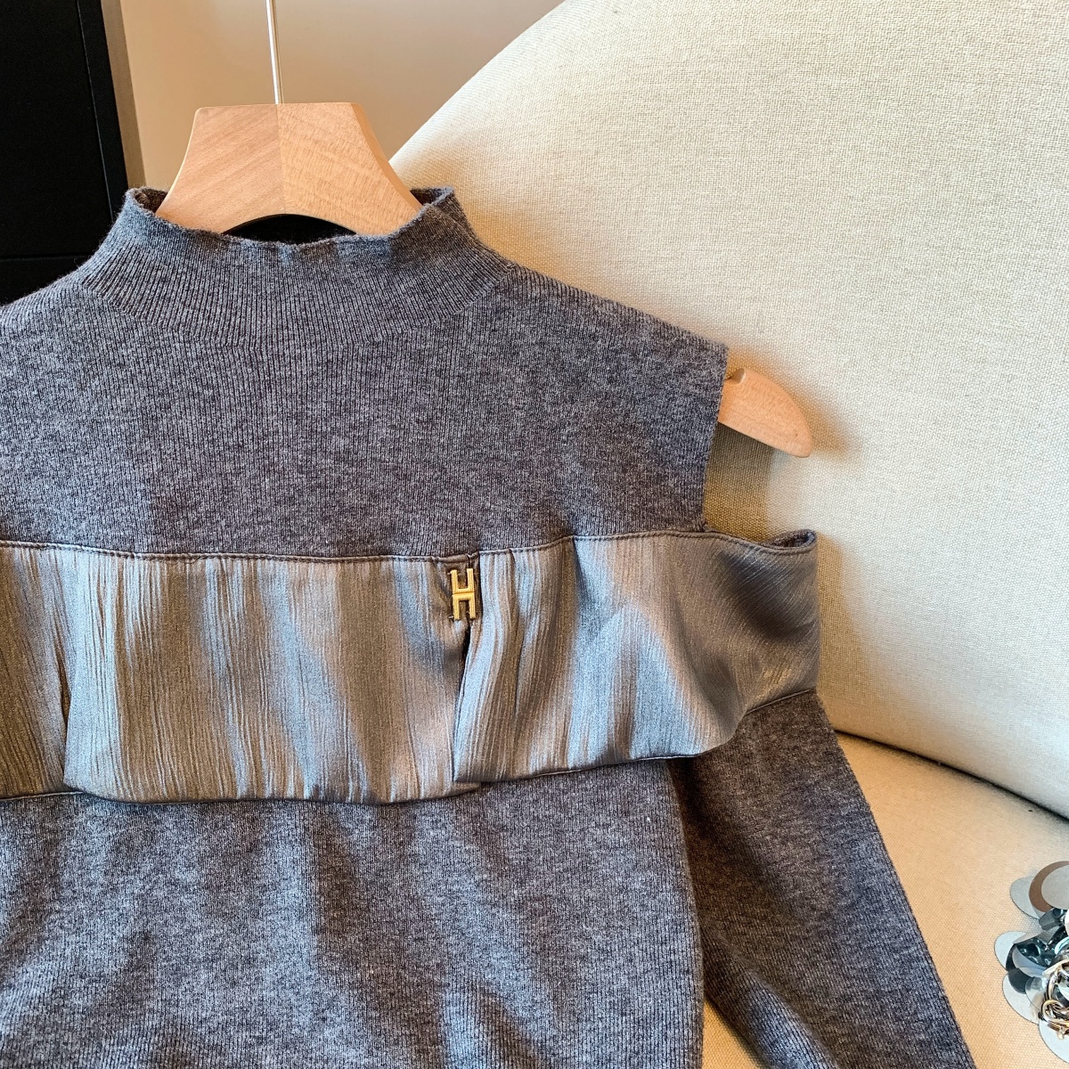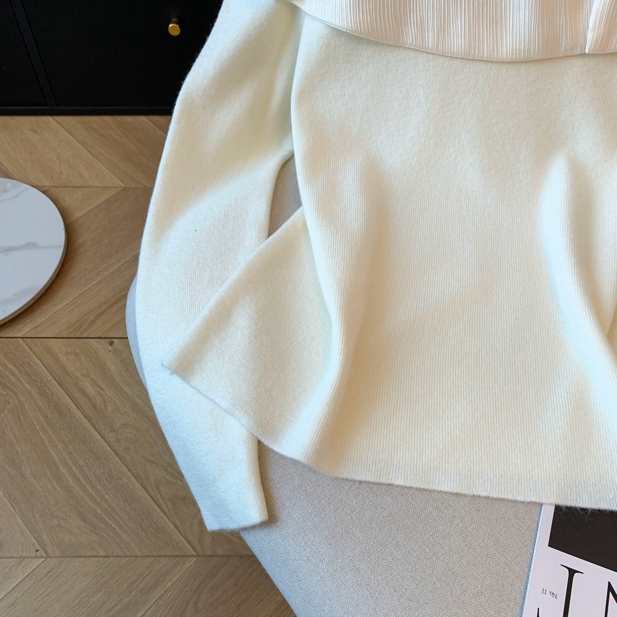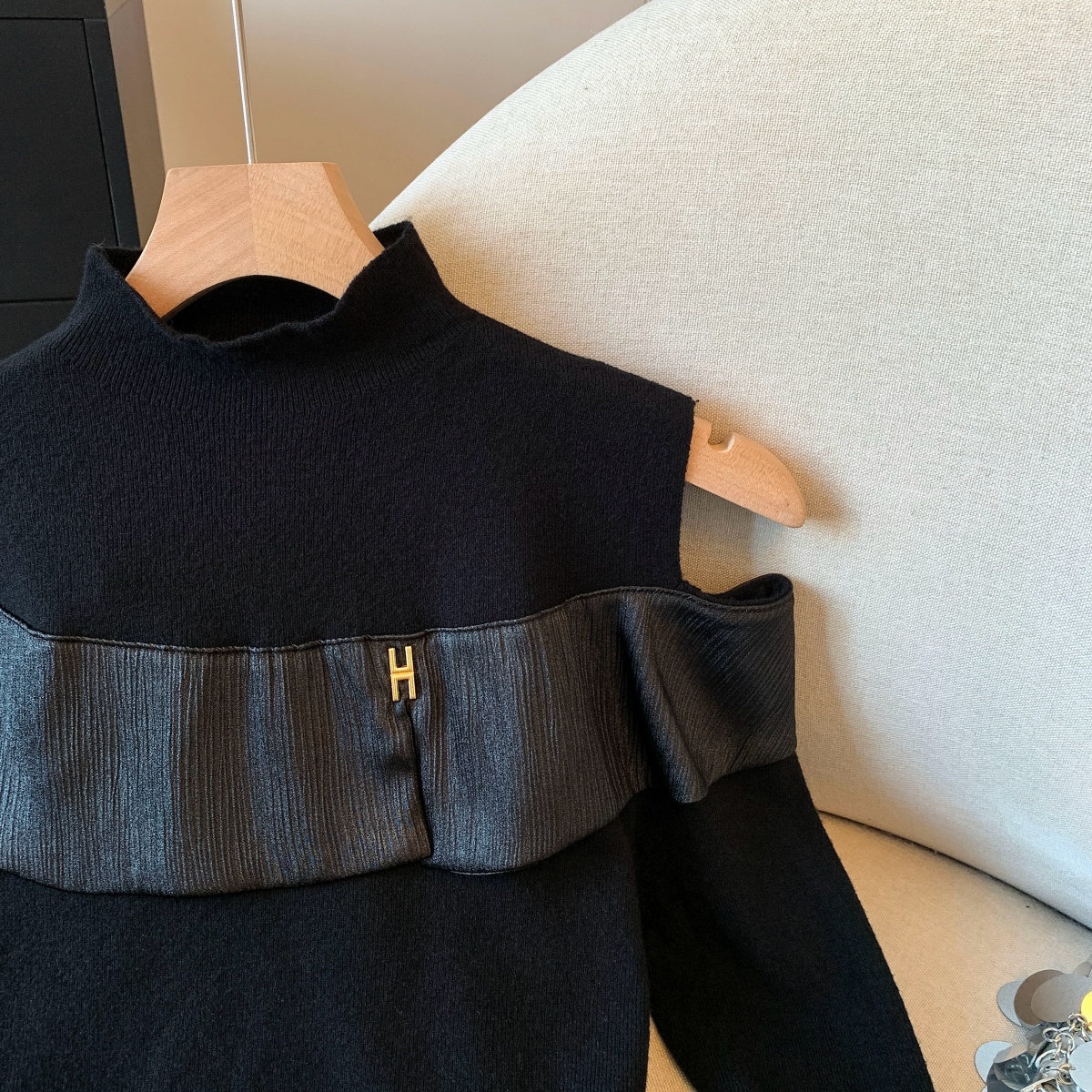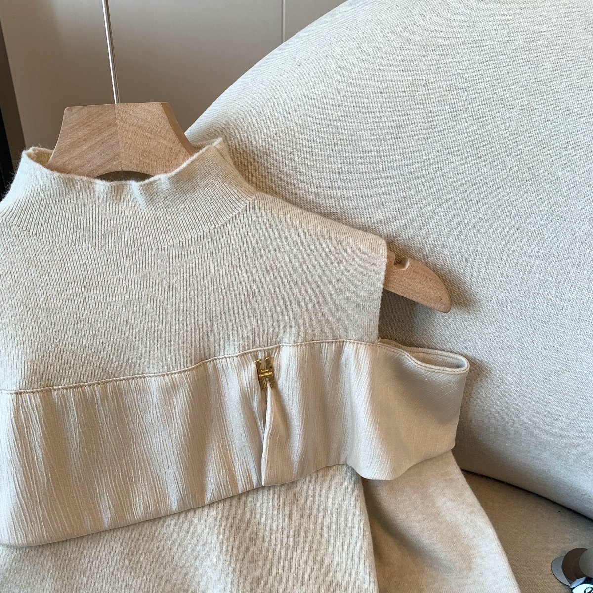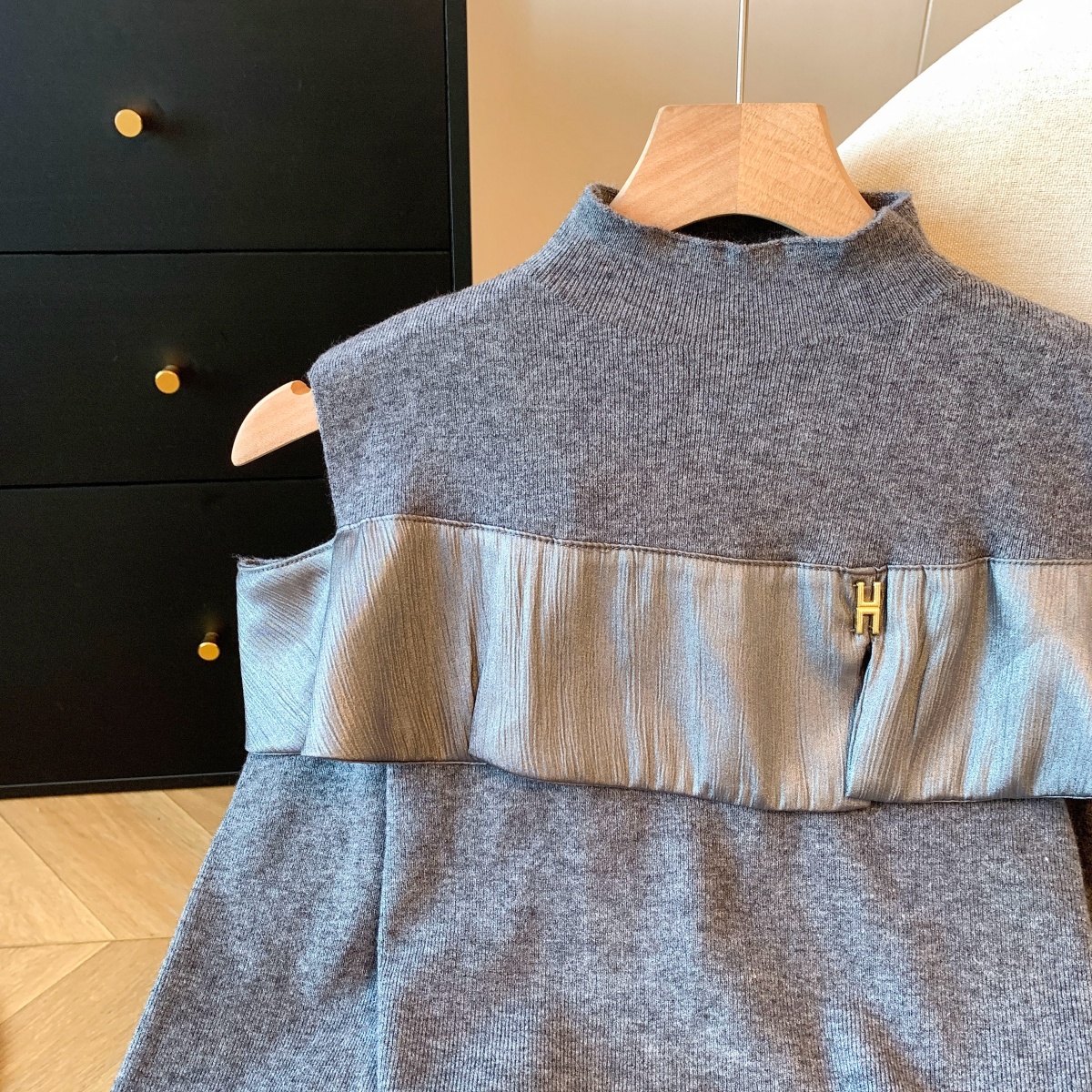 MY15658# 新款打底露肩针织衫缎面拼接荷叶边内搭毛衣半高领女裝貨源服裝批發