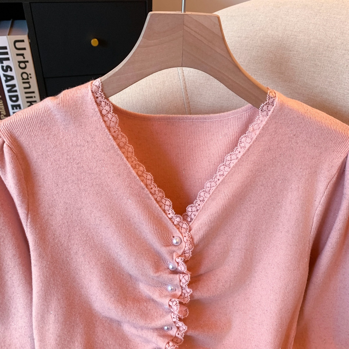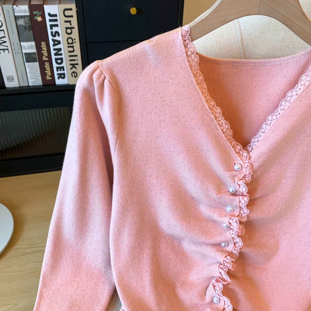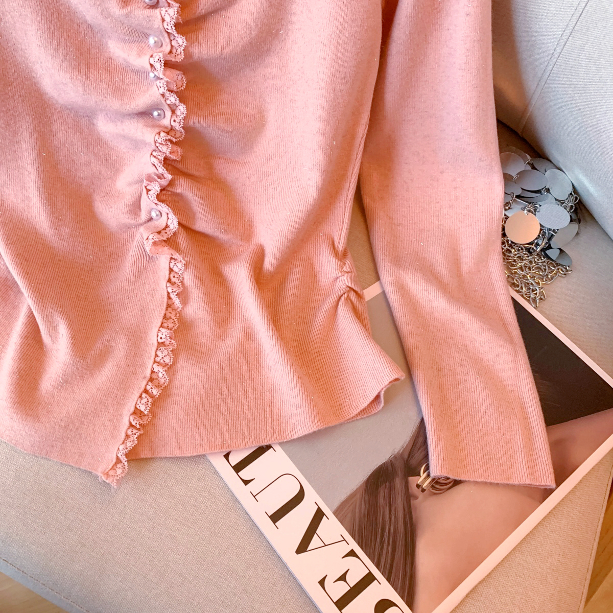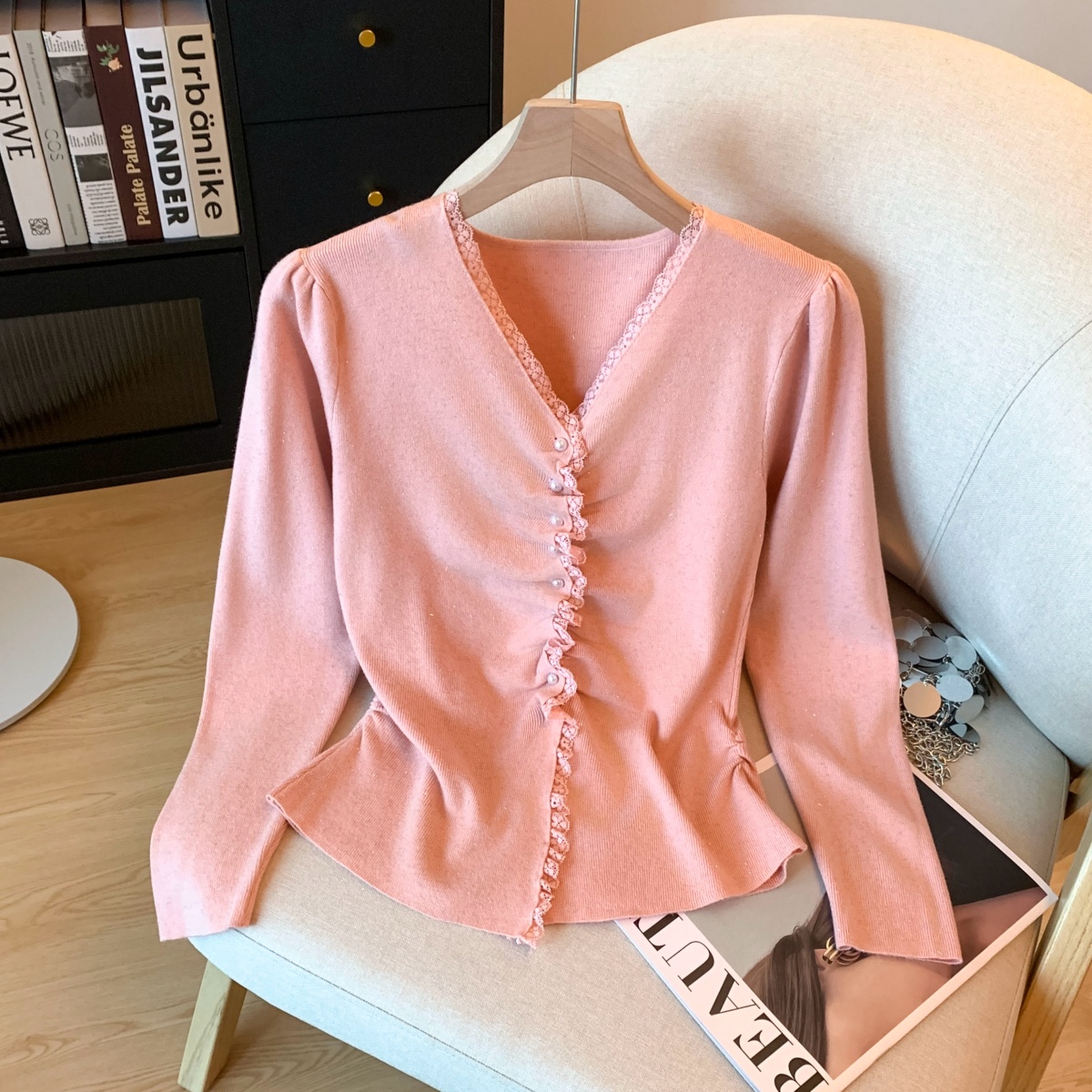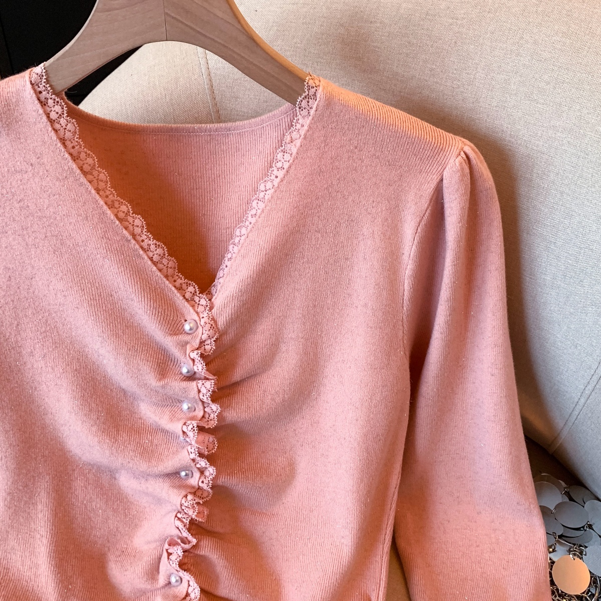 MY15661# 新款打底衫亮丝褶皱开衫蕾丝拼接V领内搭上衣温柔风女裝貨源服裝批發