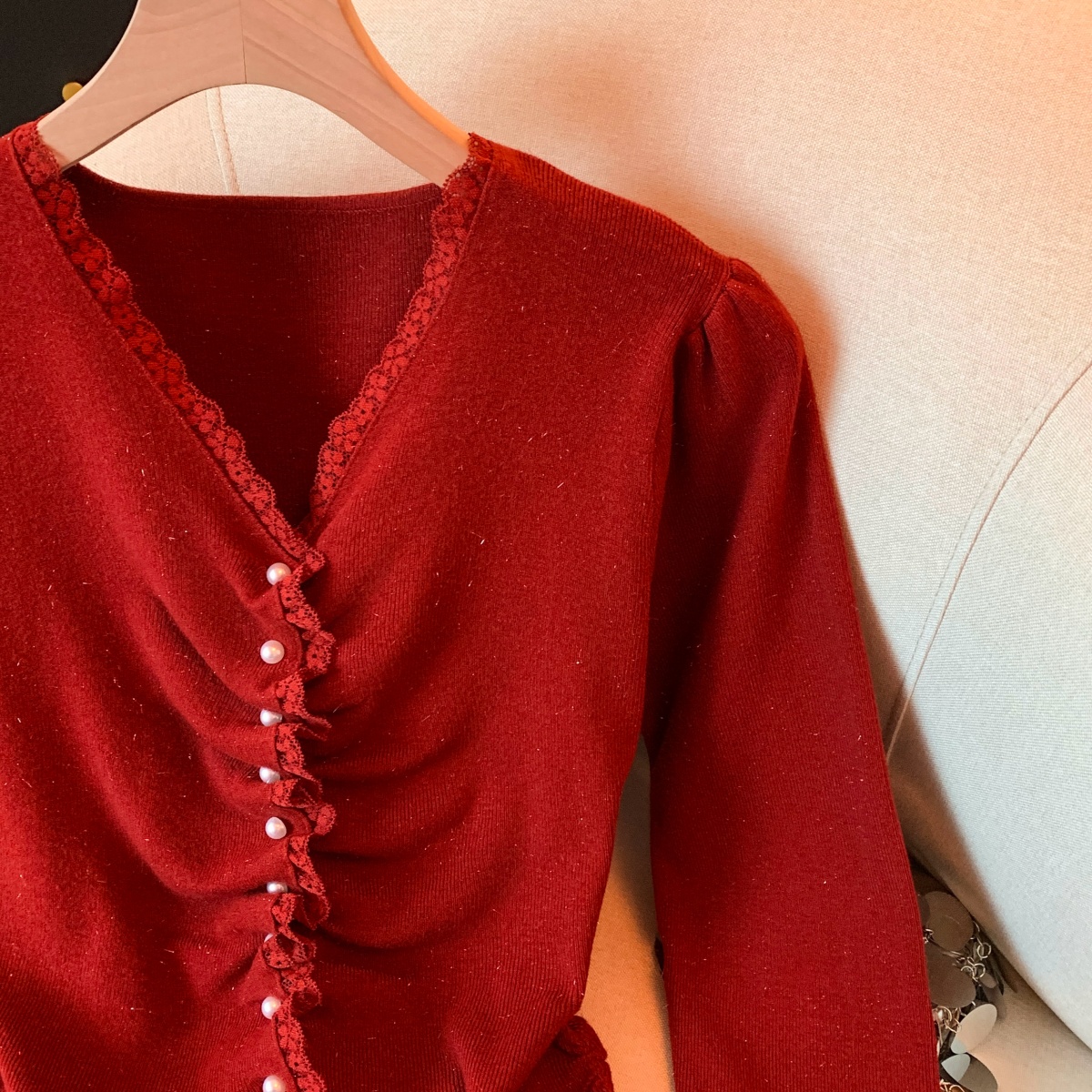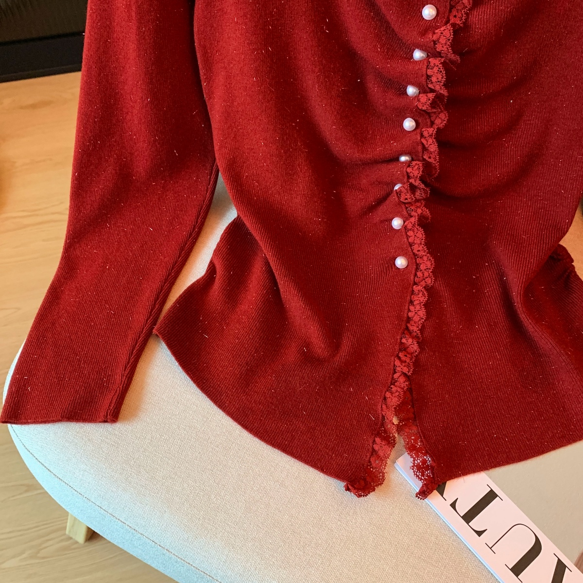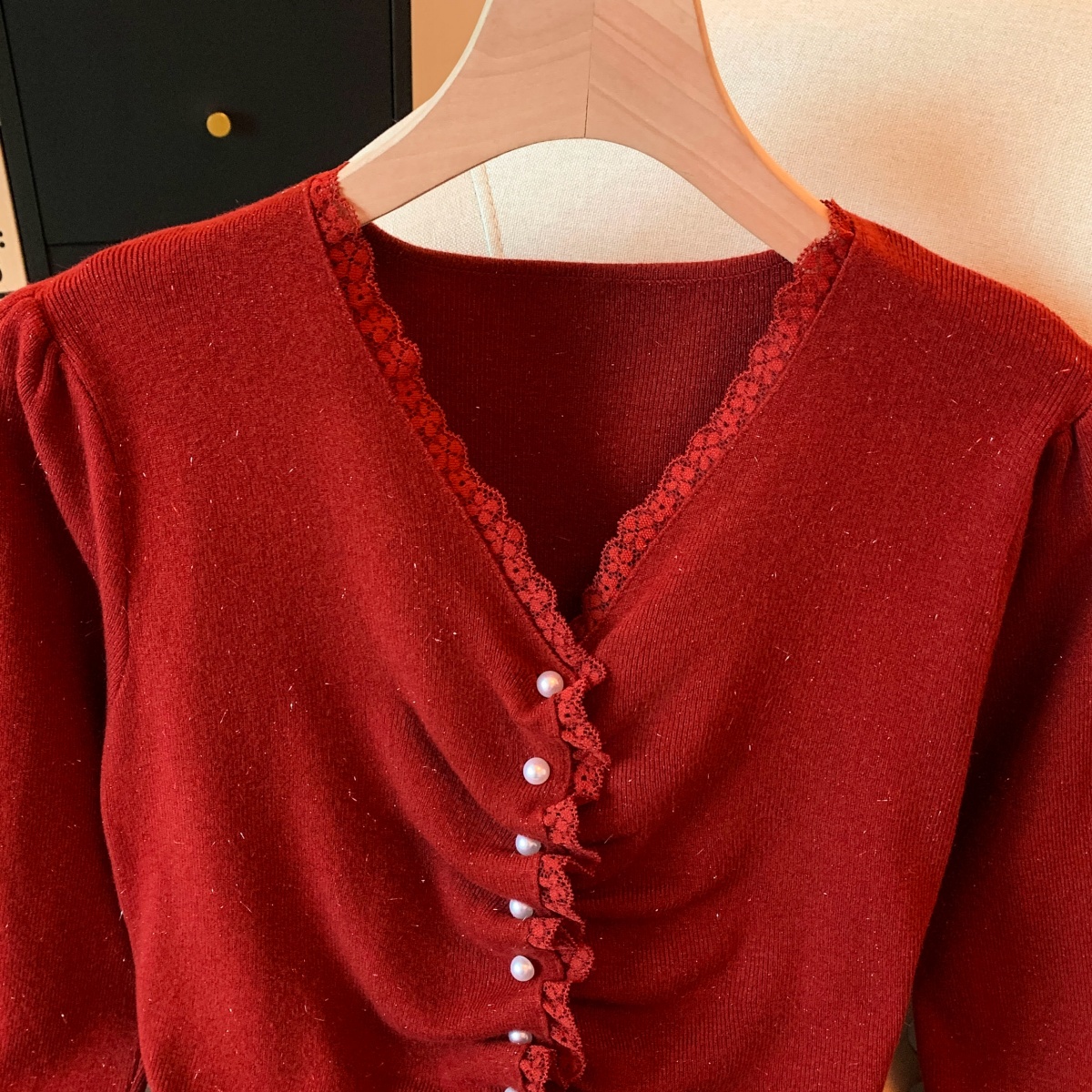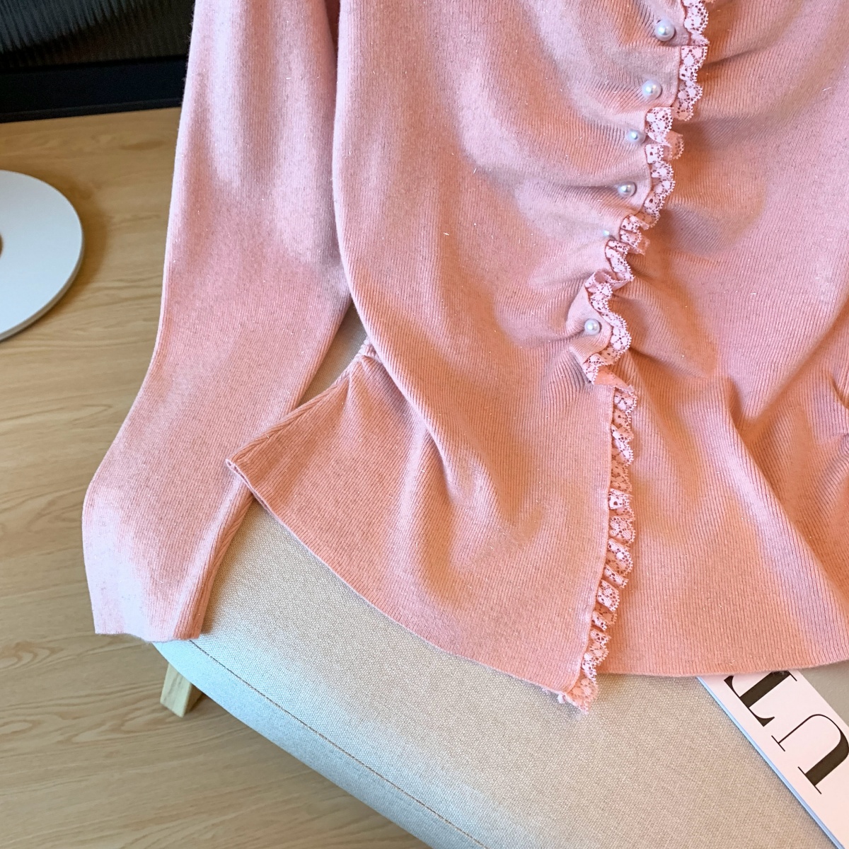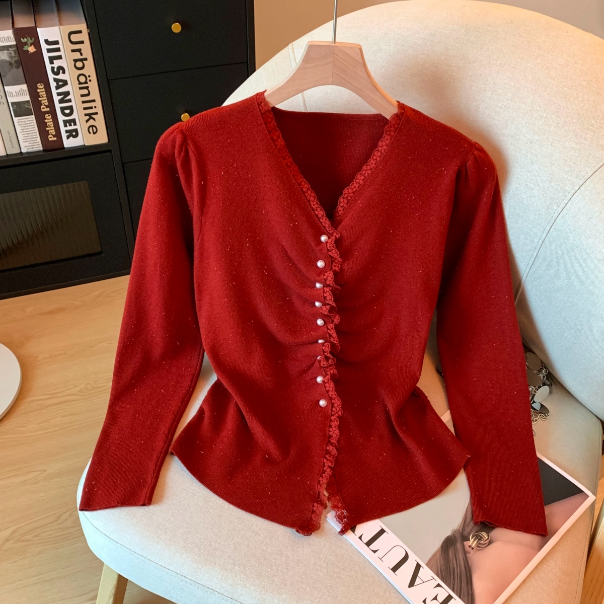 MY15661# 新款打底衫亮丝褶皱开衫蕾丝拼接V领内搭上衣温柔风女裝貨源服裝批發
