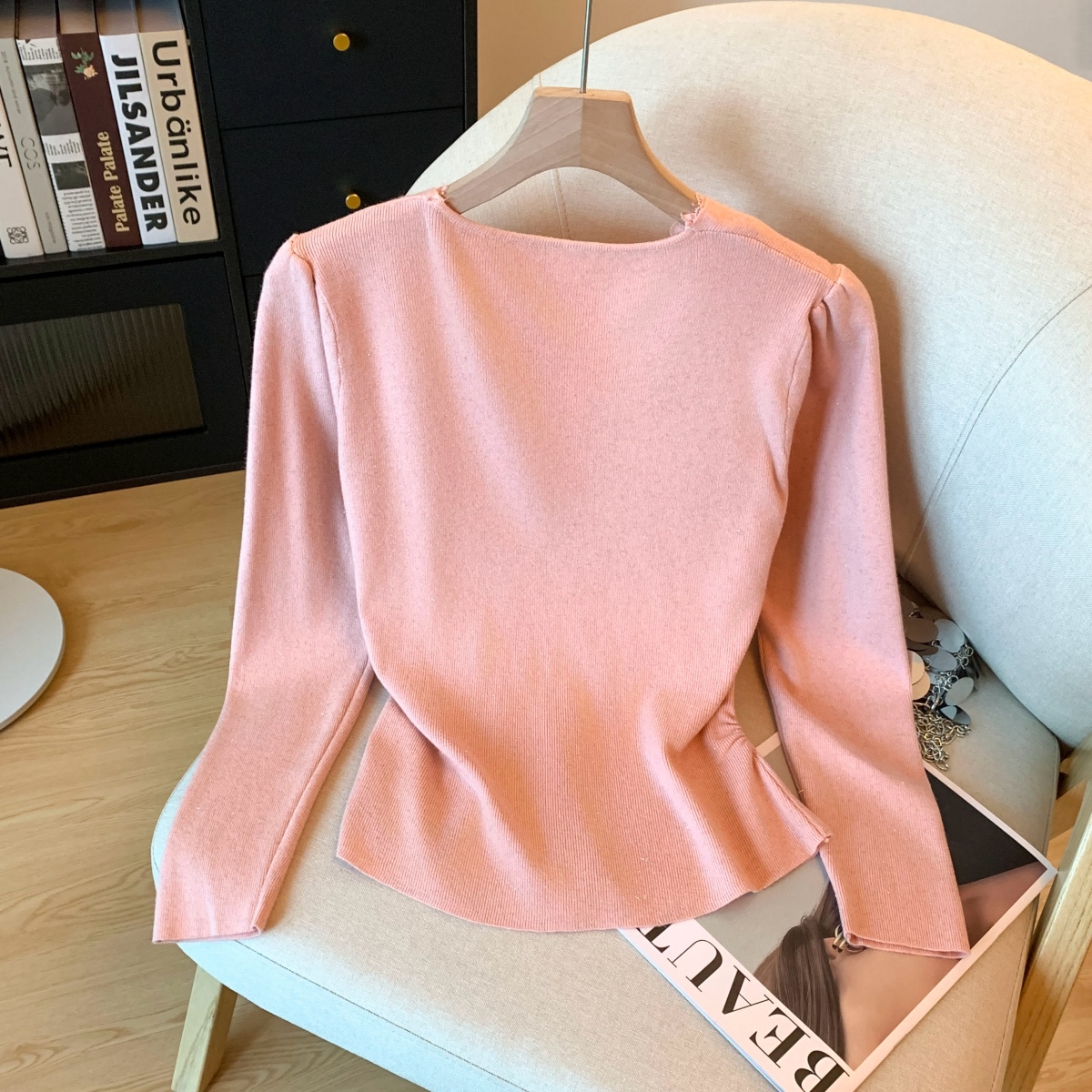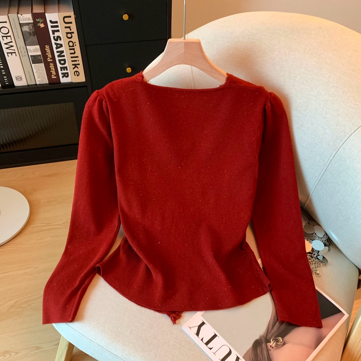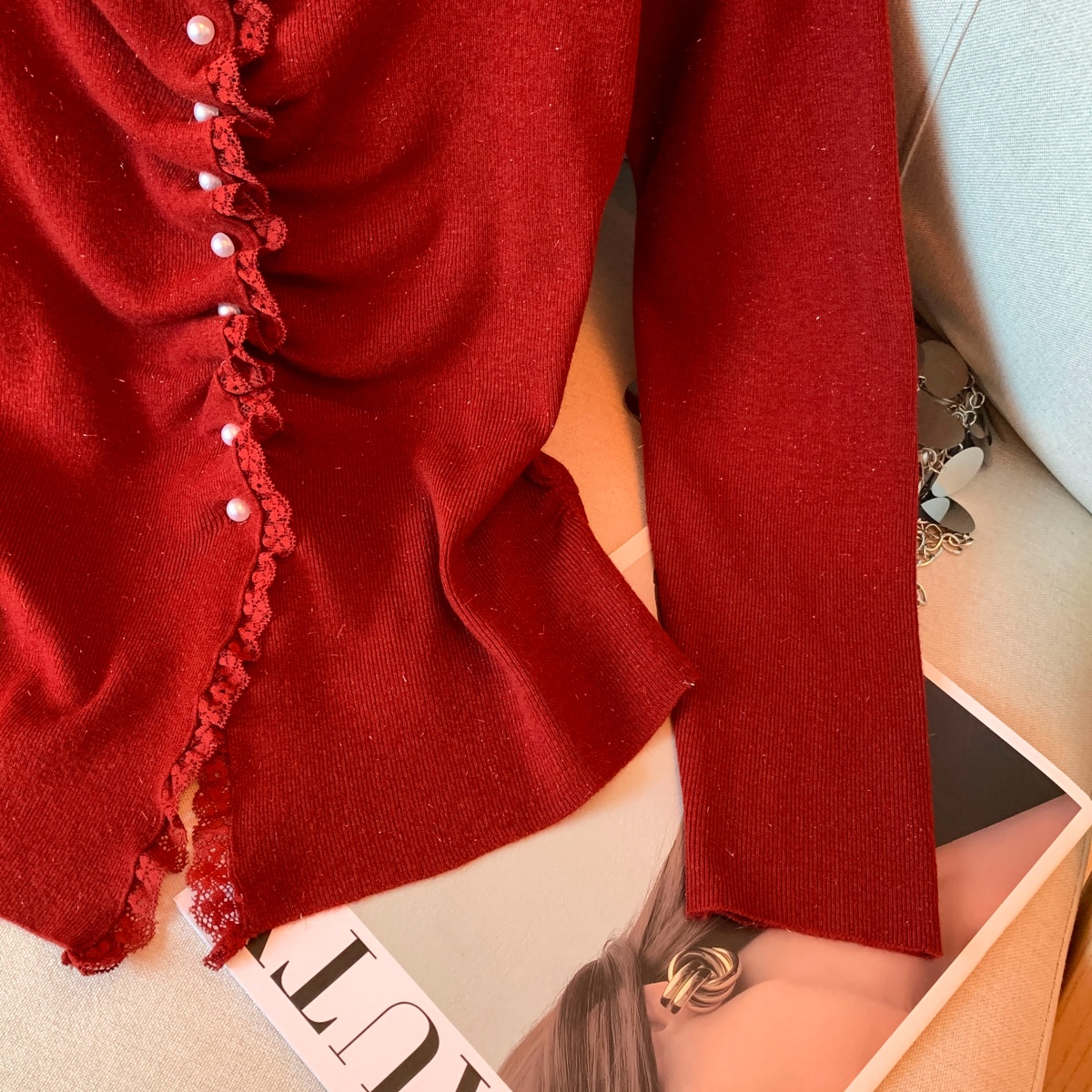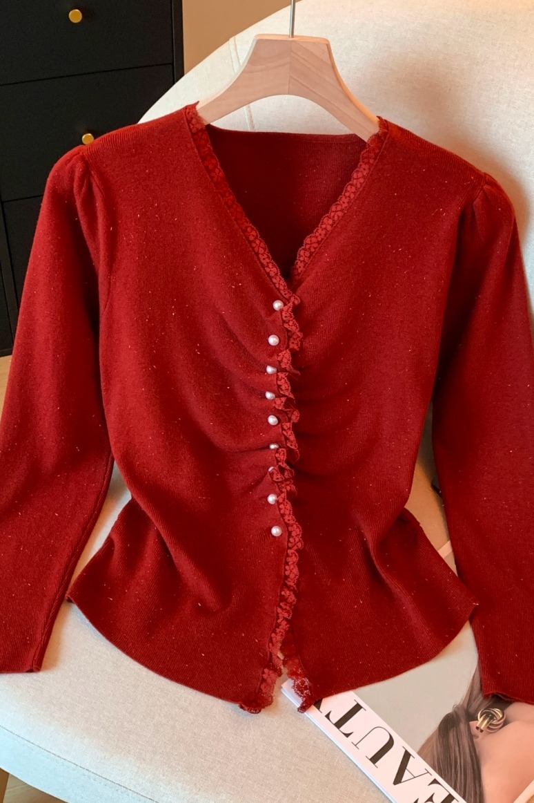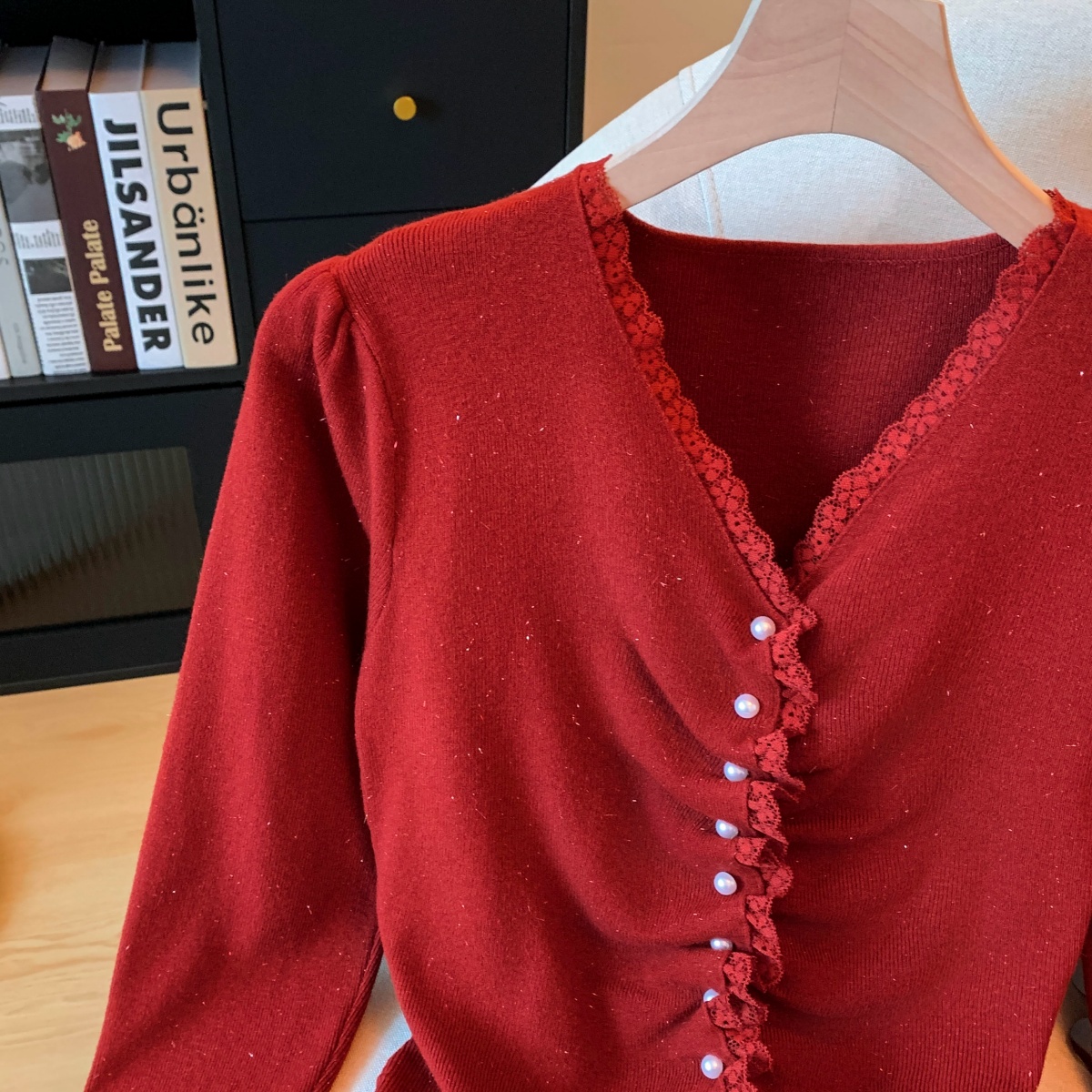 MY15661# 新款打底衫亮丝褶皱开衫蕾丝拼接V领内搭上衣温柔风女裝貨源服裝批發
