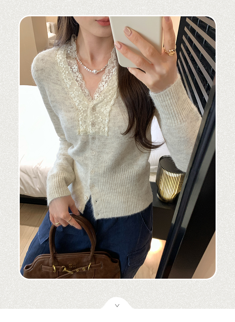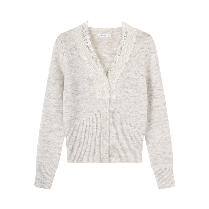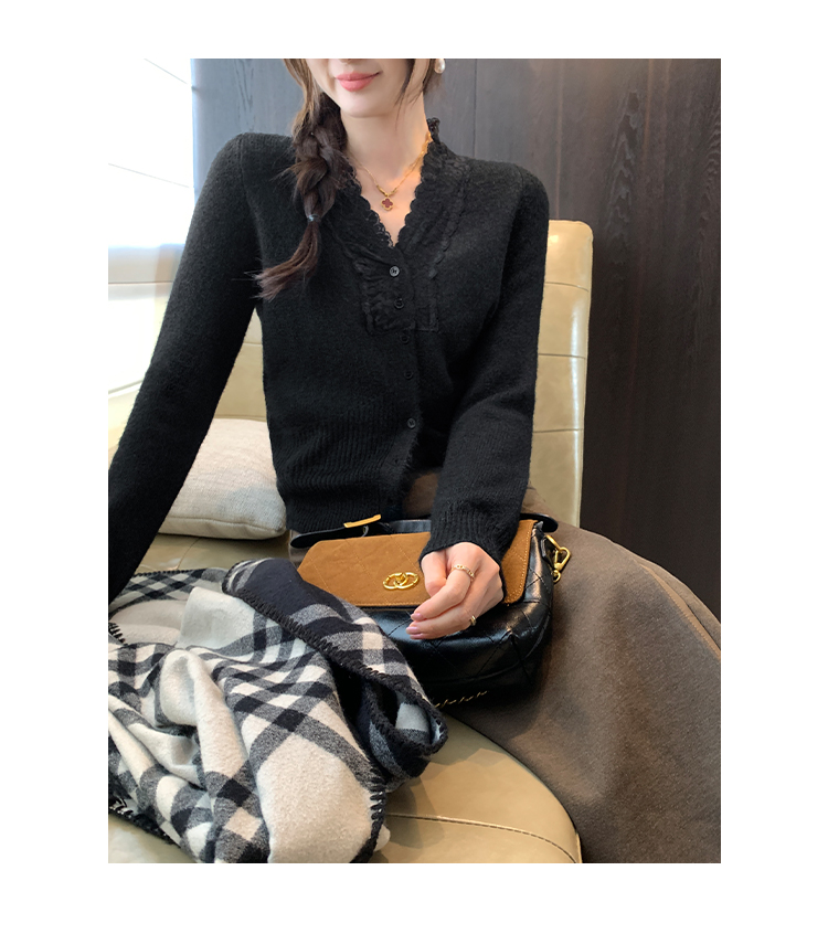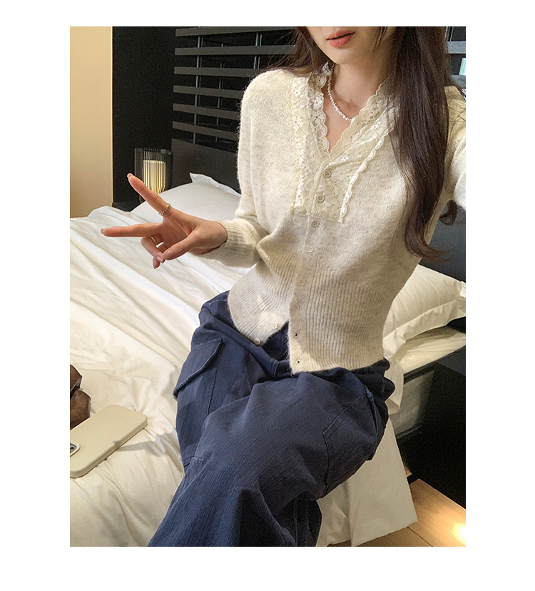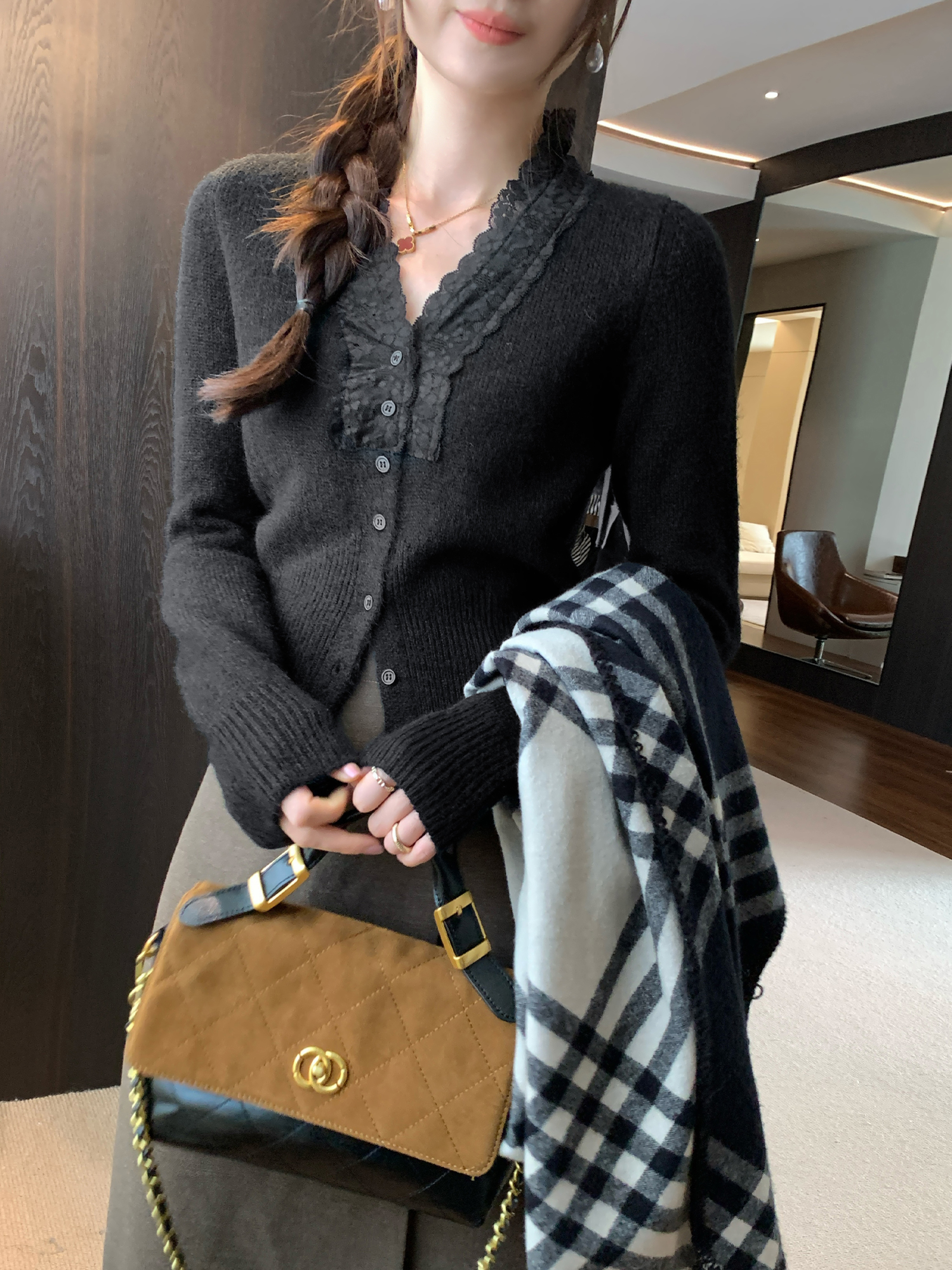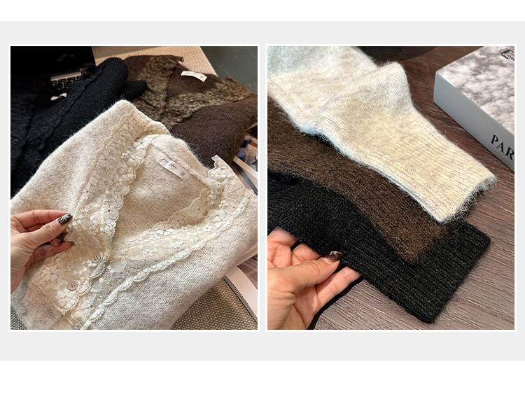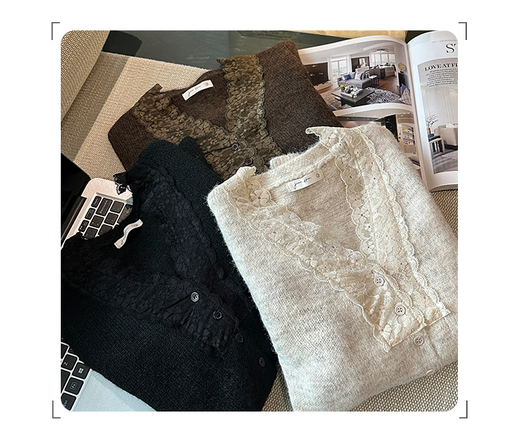 MY15681# 高知miu系蕾丝花边V领羊毛针织毛衣开衫外套女秋新款上衣女裝貨源服裝批發