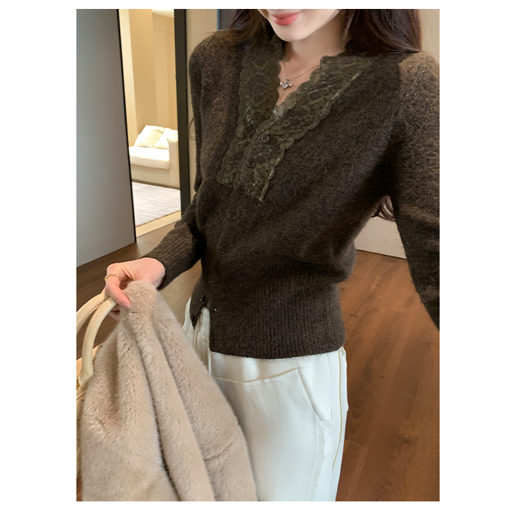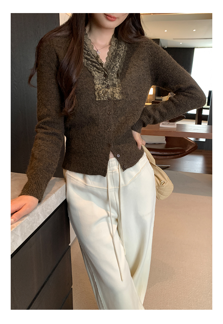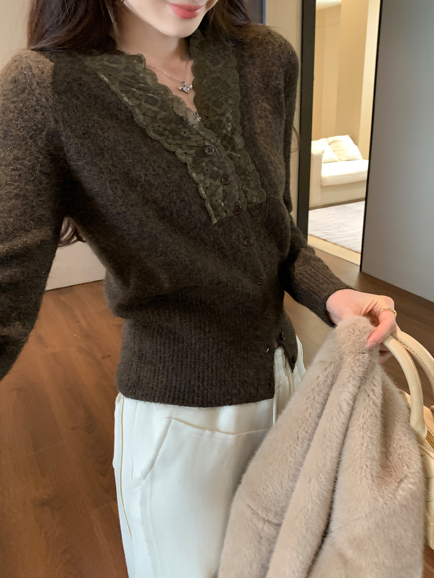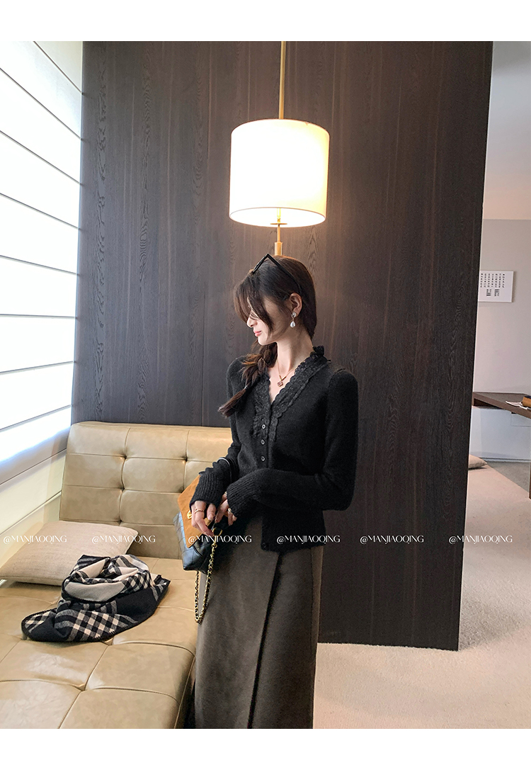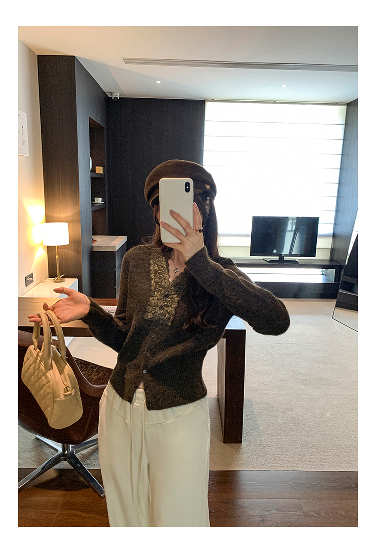 MY15681# 高知miu系蕾丝花边V领羊毛针织毛衣开衫外套女秋新款上衣女裝貨源服裝批發
