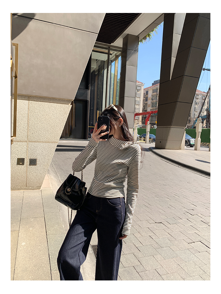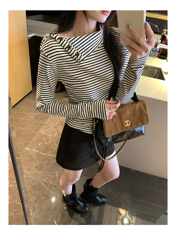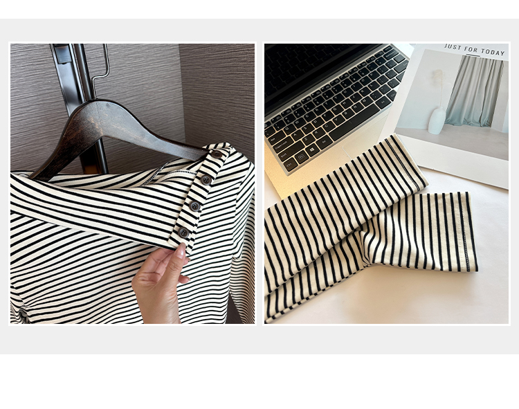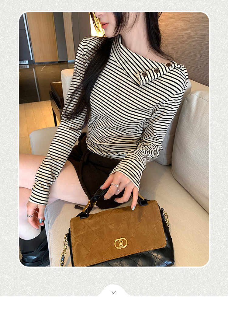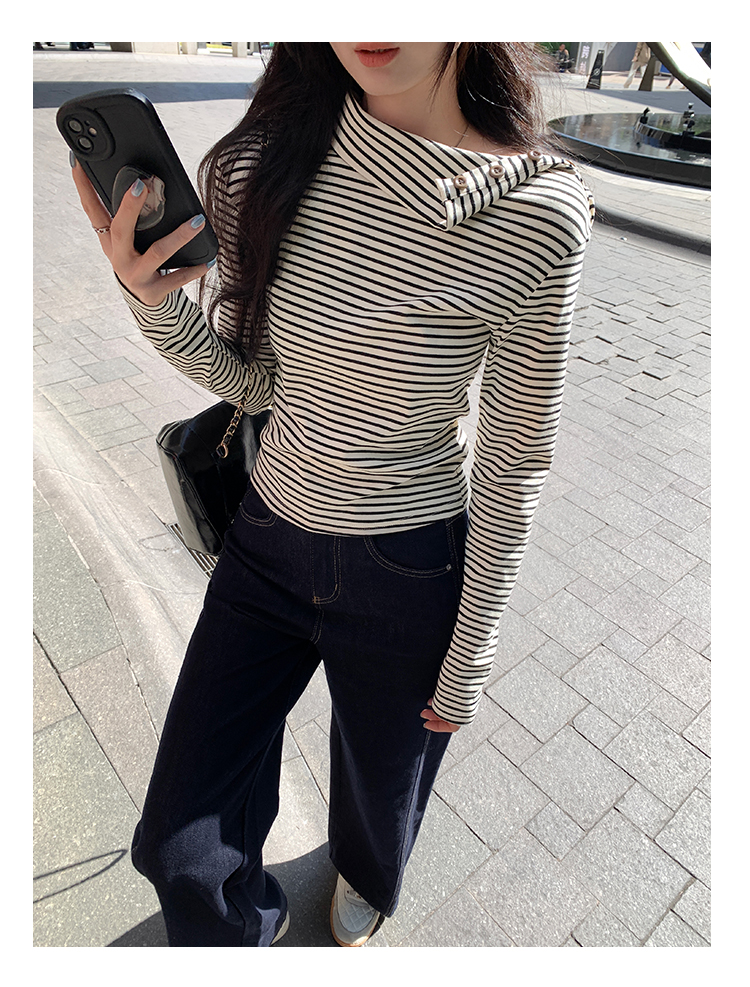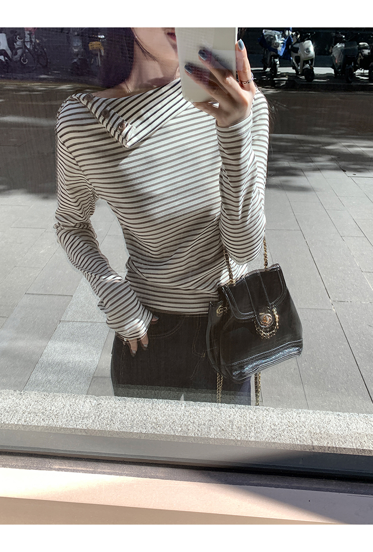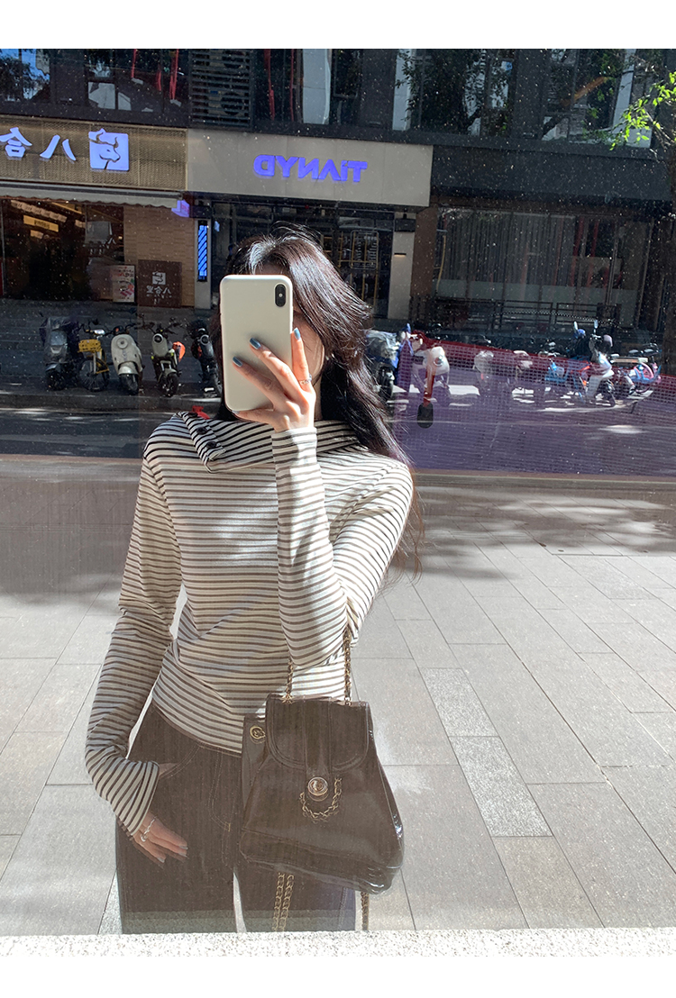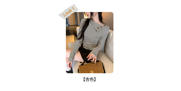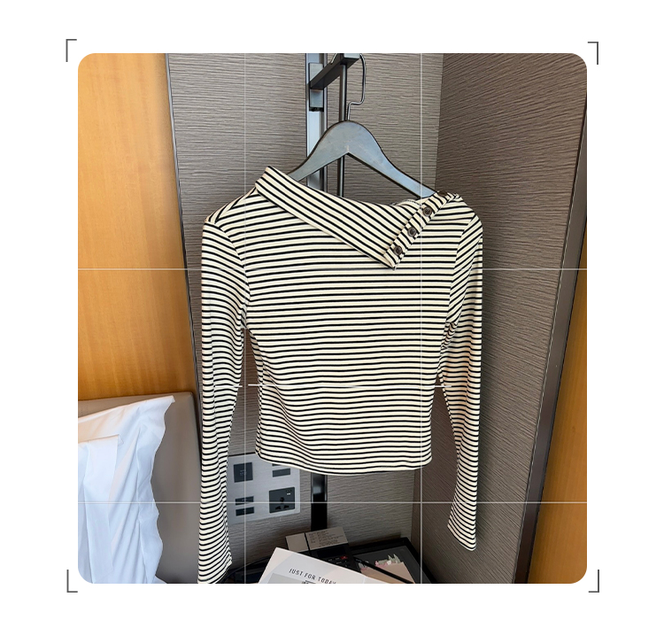 MY15683# 韩系高级感翻领内搭打底衫T恤新款独特条纹上衣女裝貨源服裝批發
