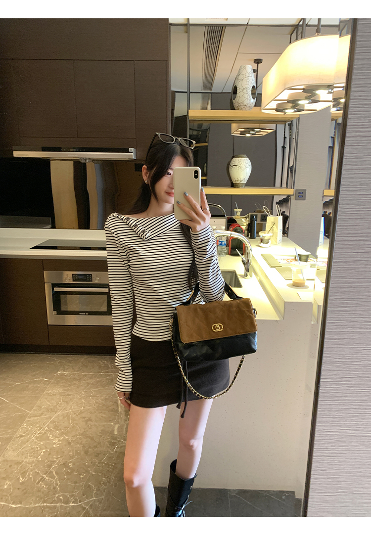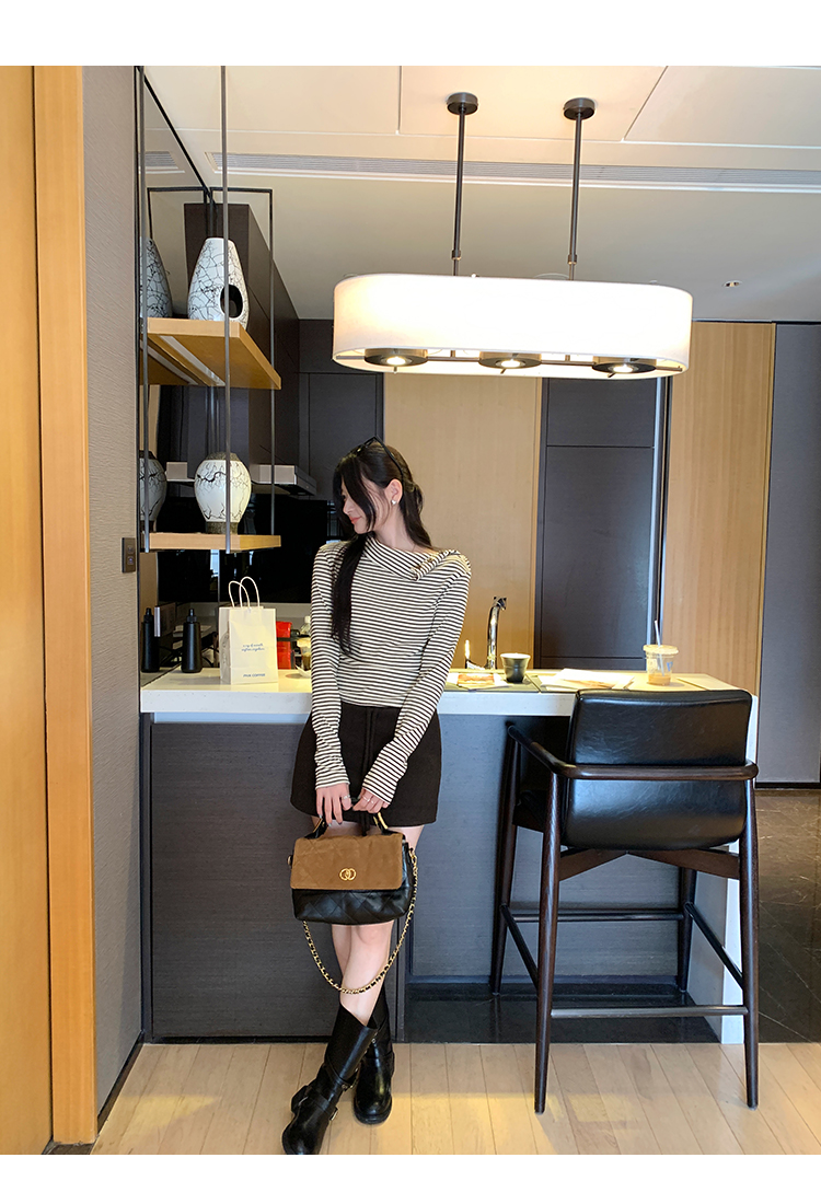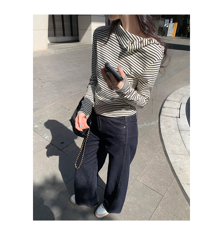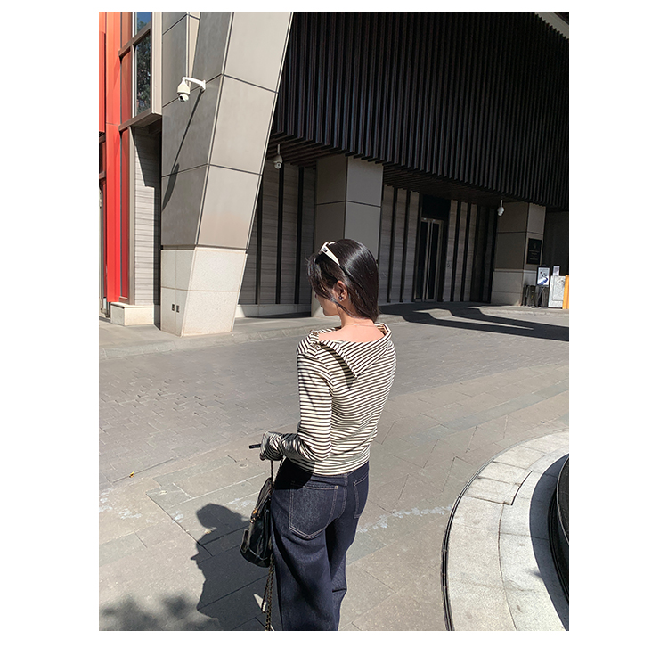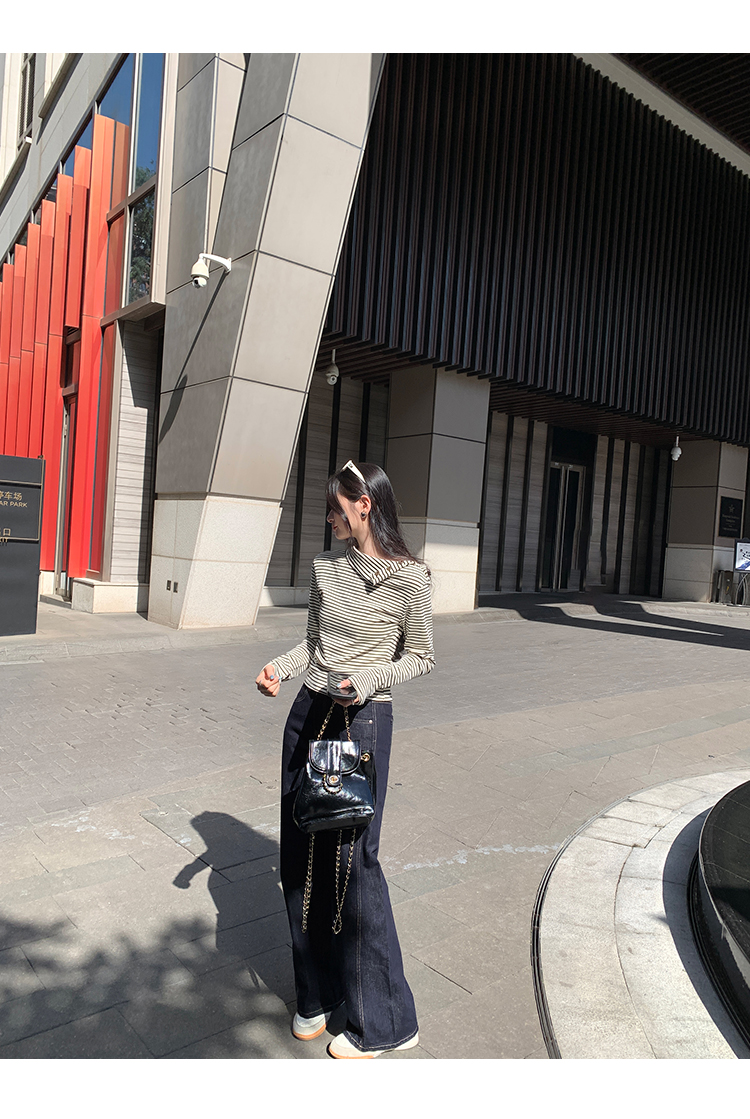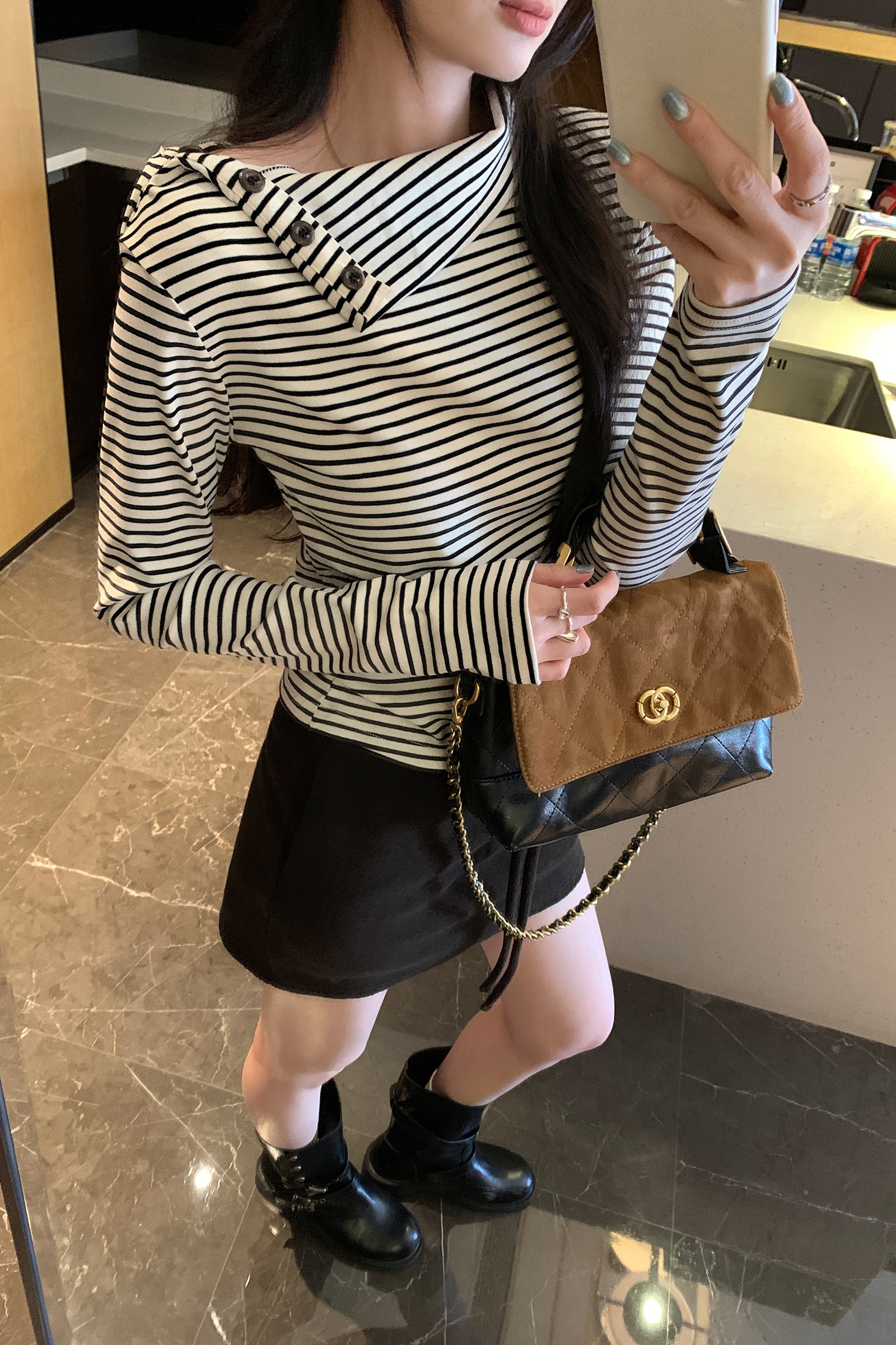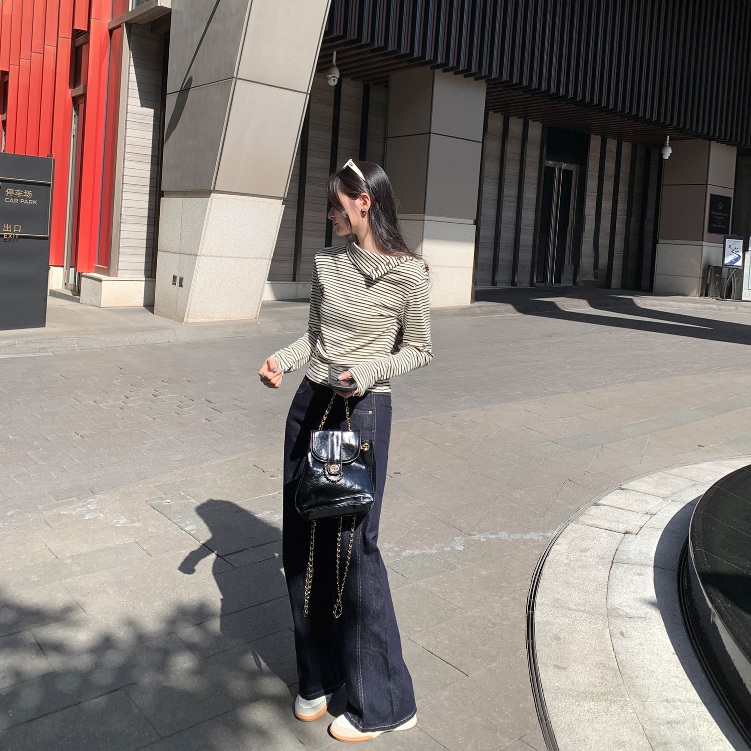 MY15683# 韩系高级感翻领内搭打底衫T恤新款独特条纹上衣女裝貨源服裝批發