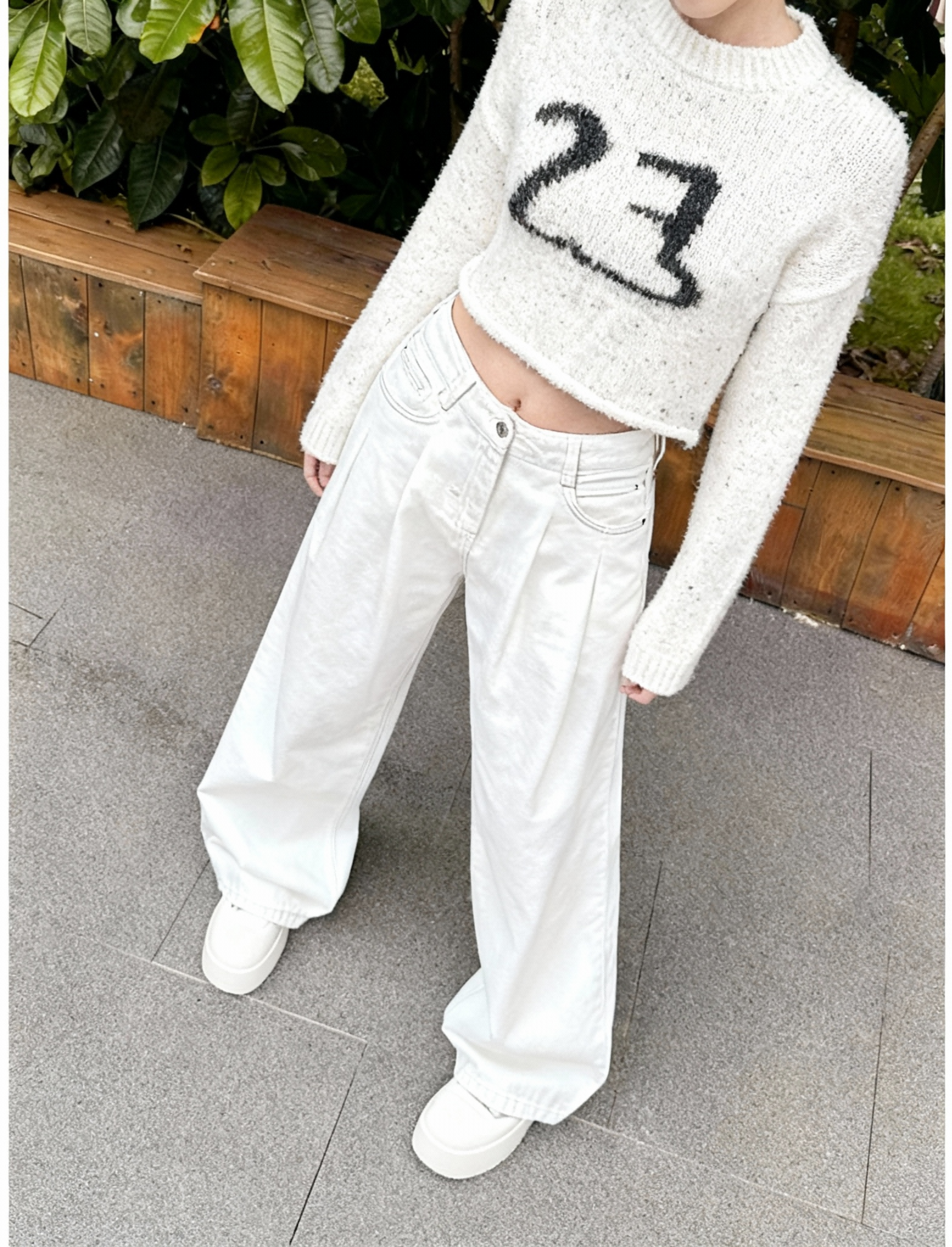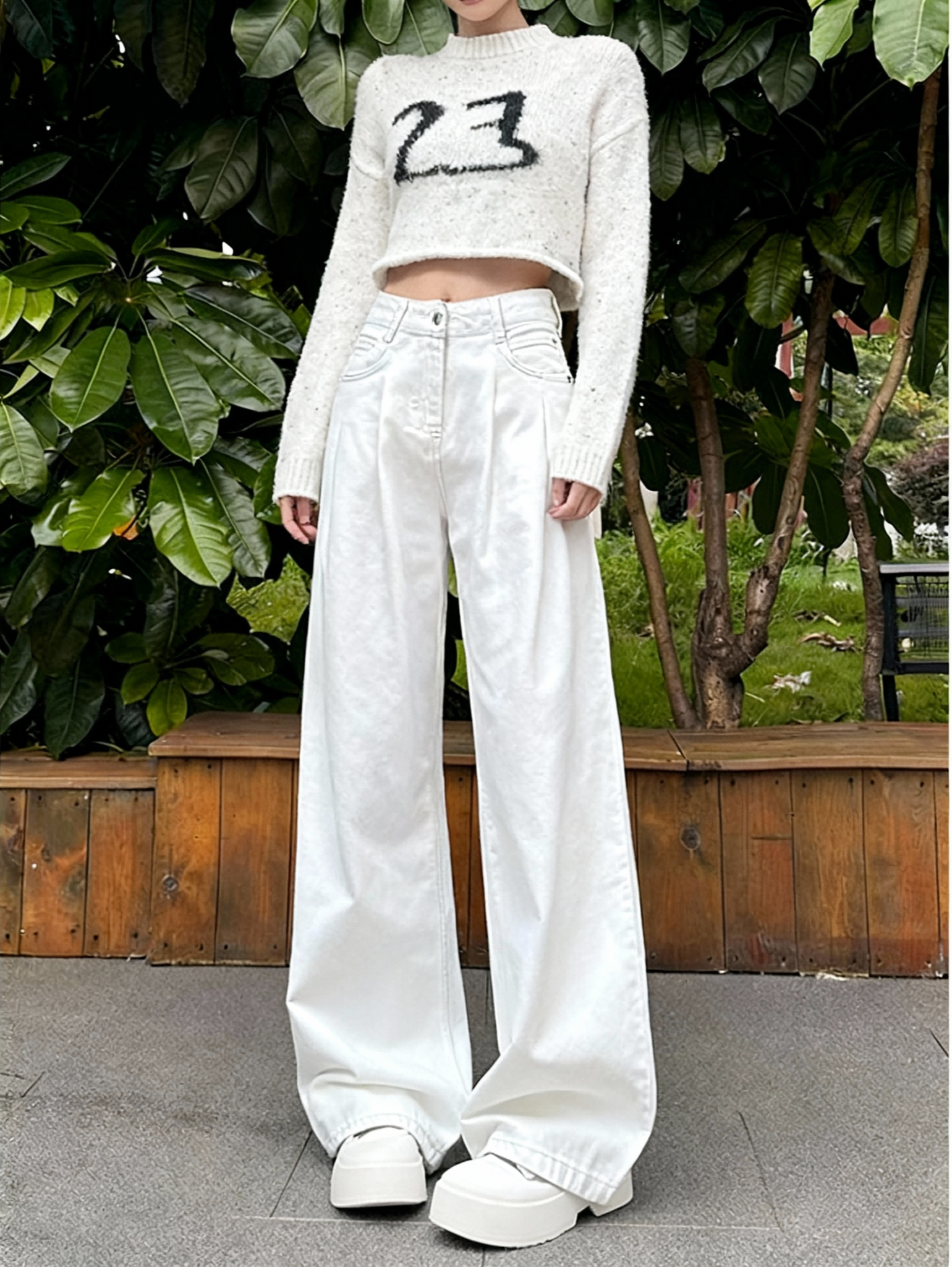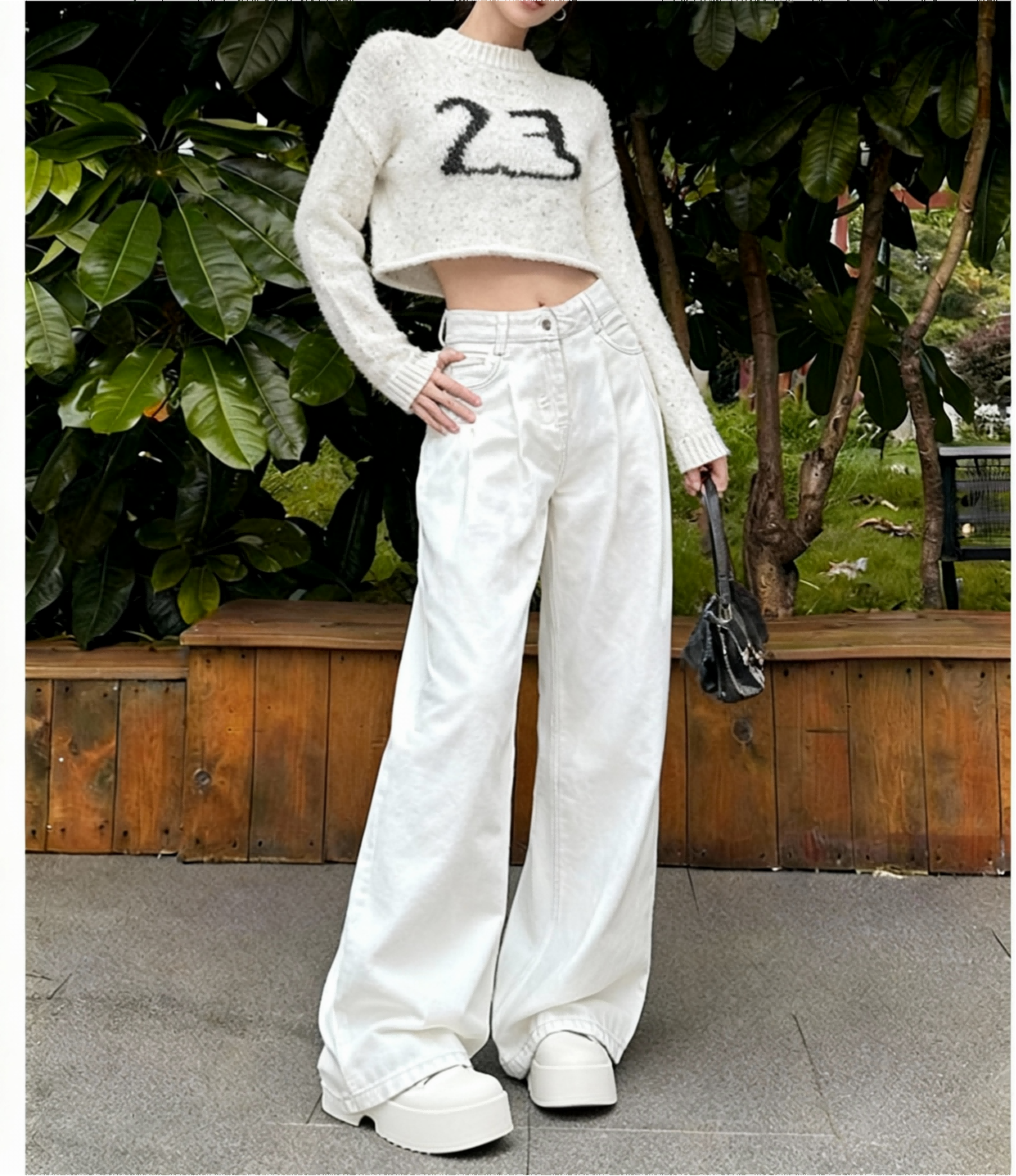 MY15689# 小个子阔腿牛仔裤女秋褶皱垂感宽松高腰抽褶直筒裤xs女裝貨源服裝批發