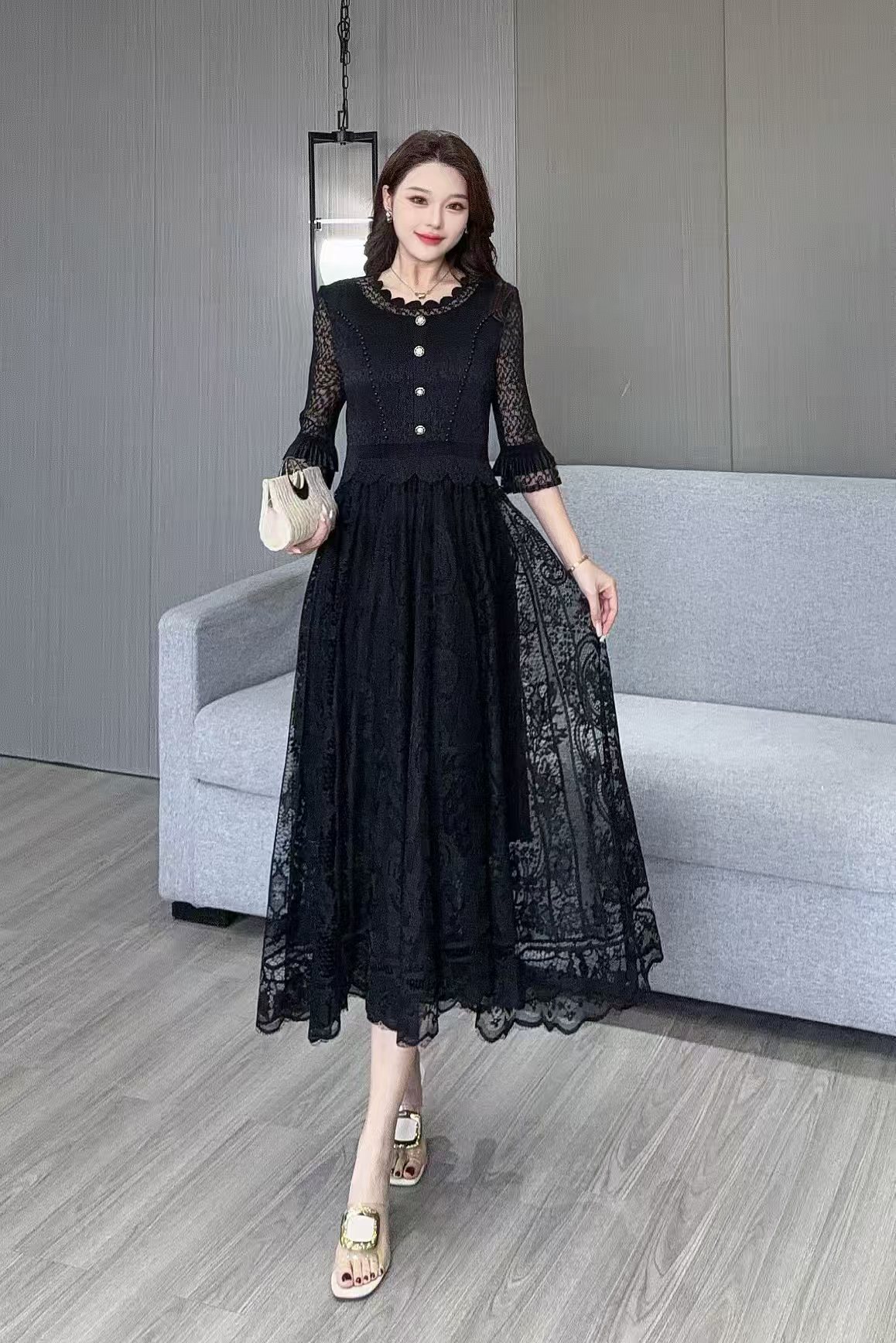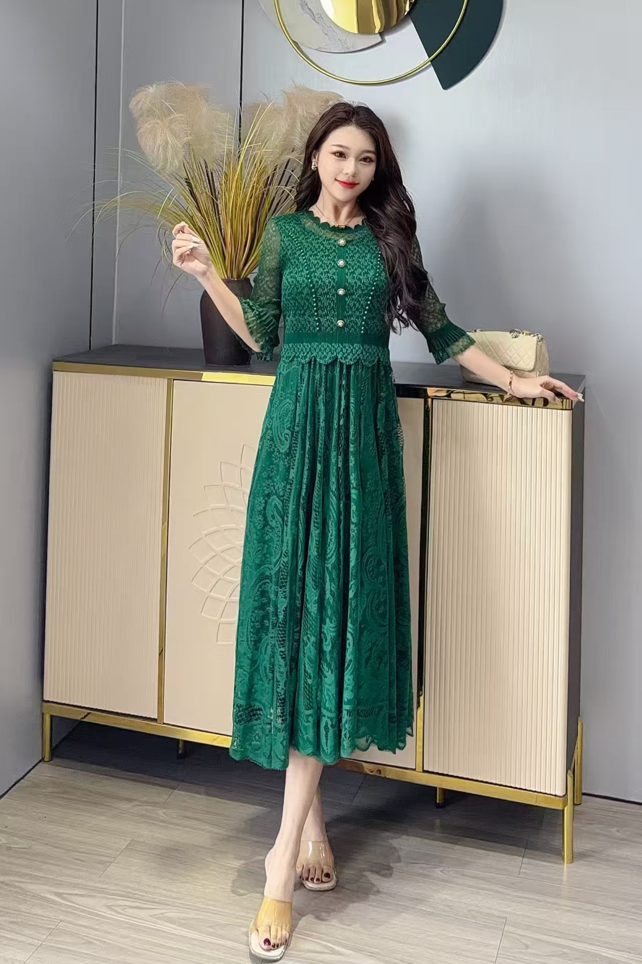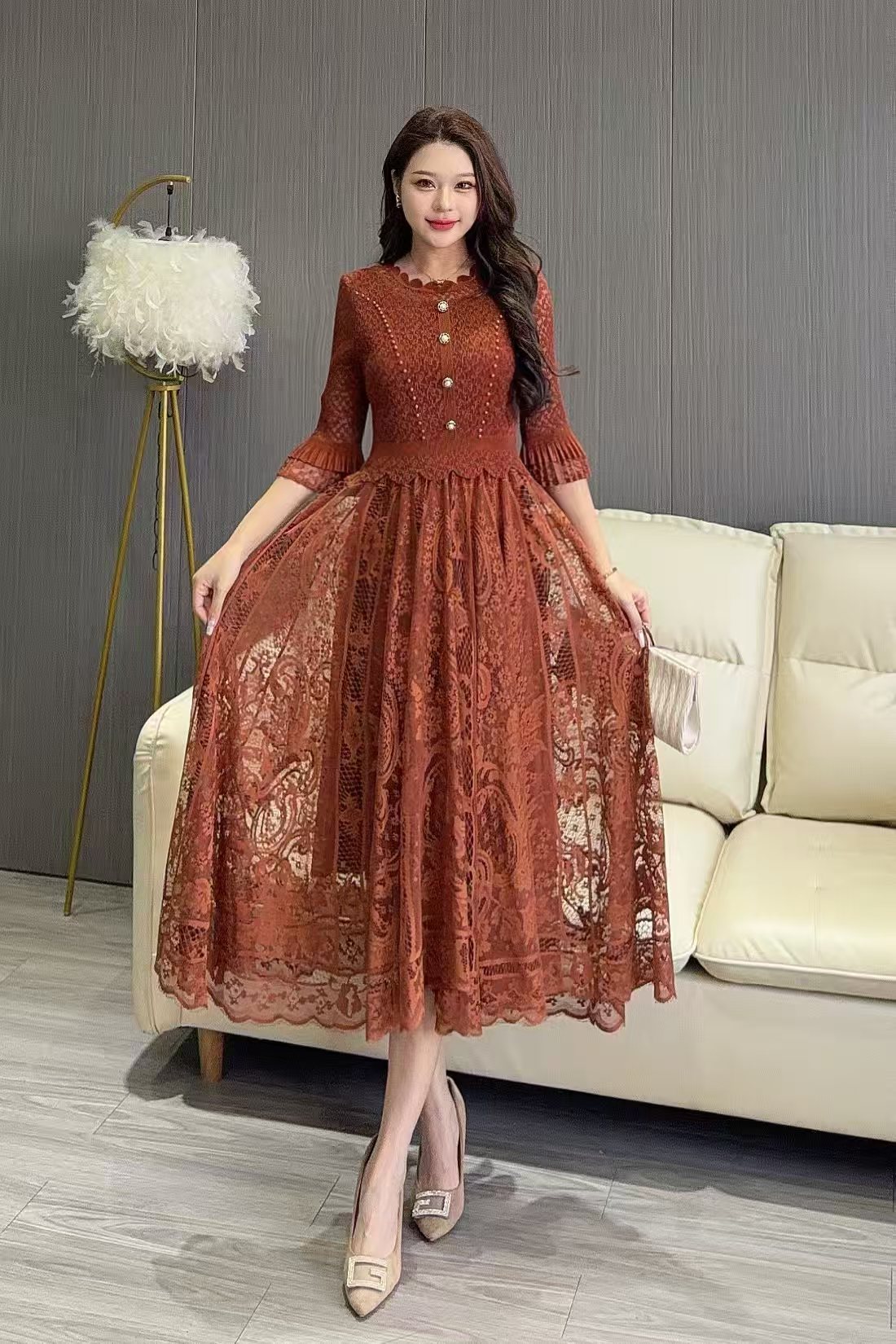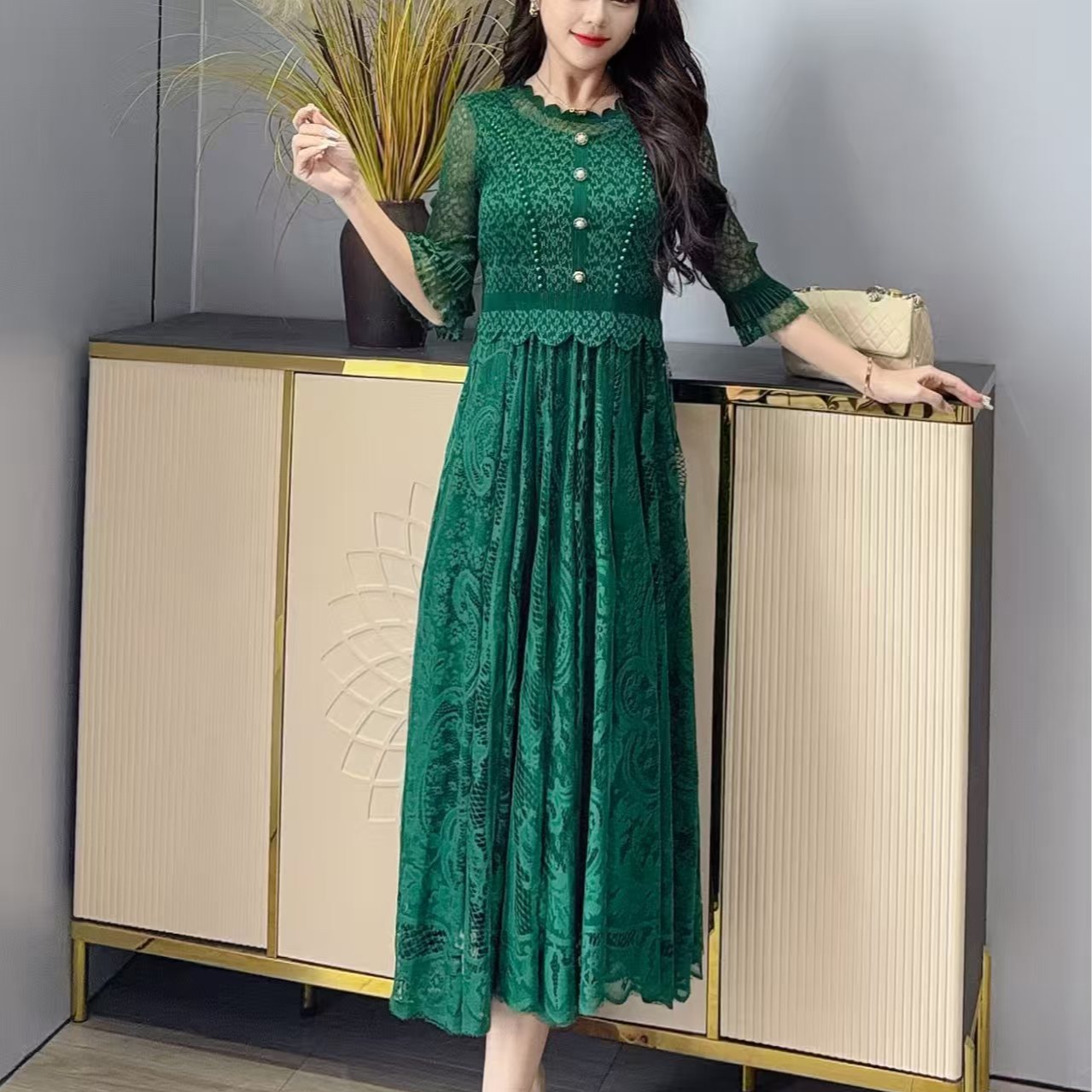 MY15694# 欧洲站新款时尚褶皱圆领拼接修身显瘦连衣裙中长款百褶裙女裝貨源服裝批發