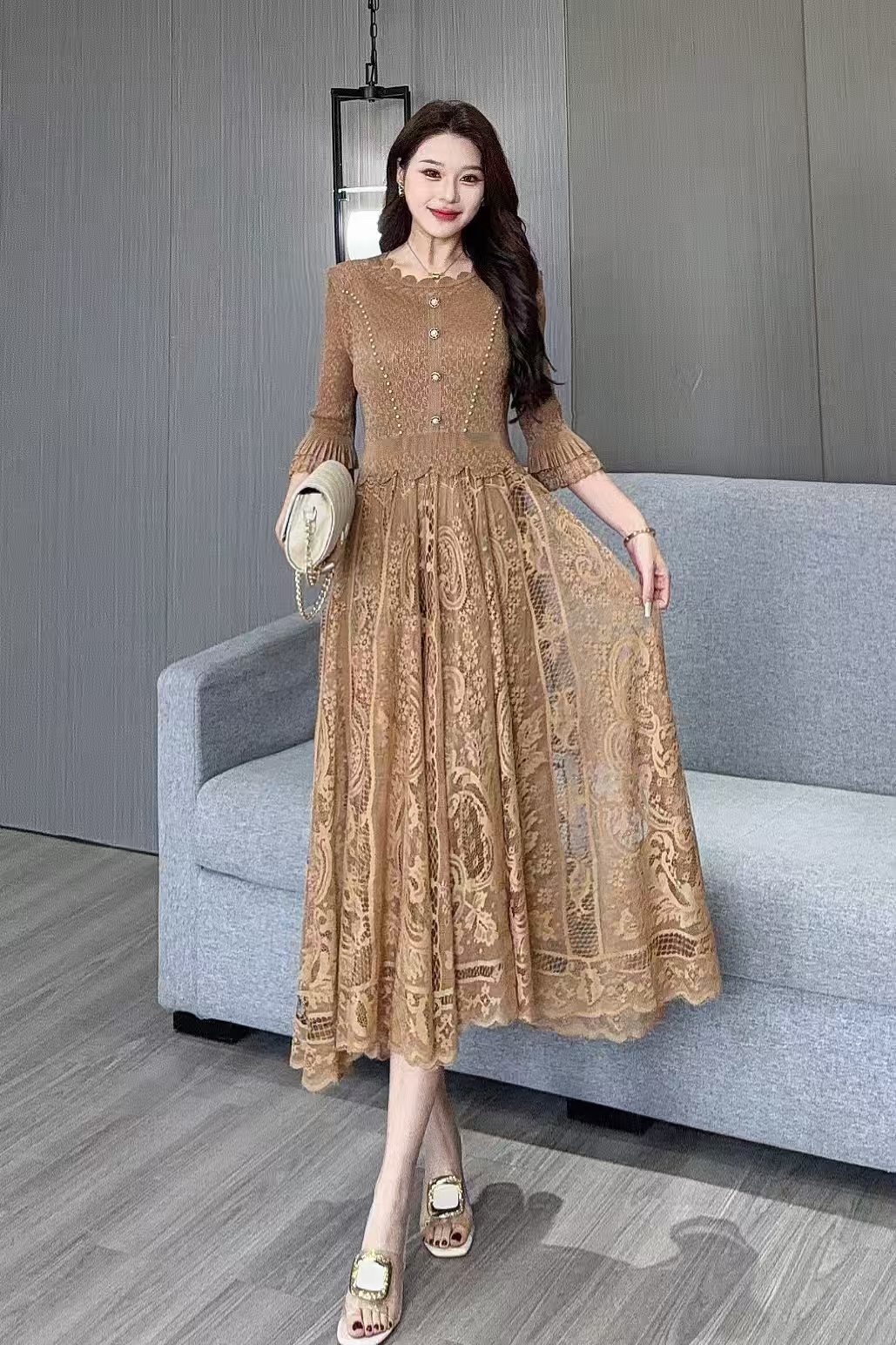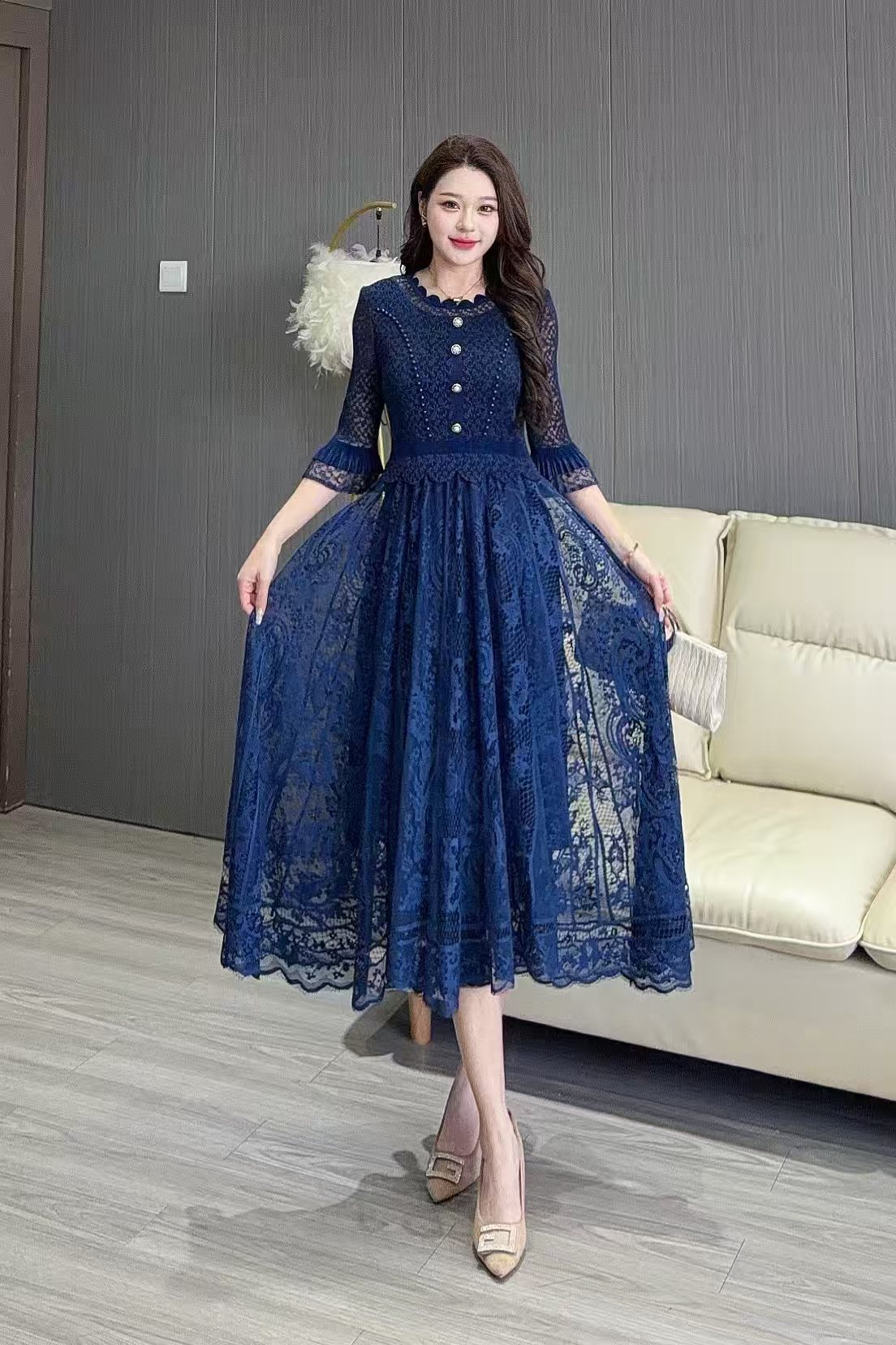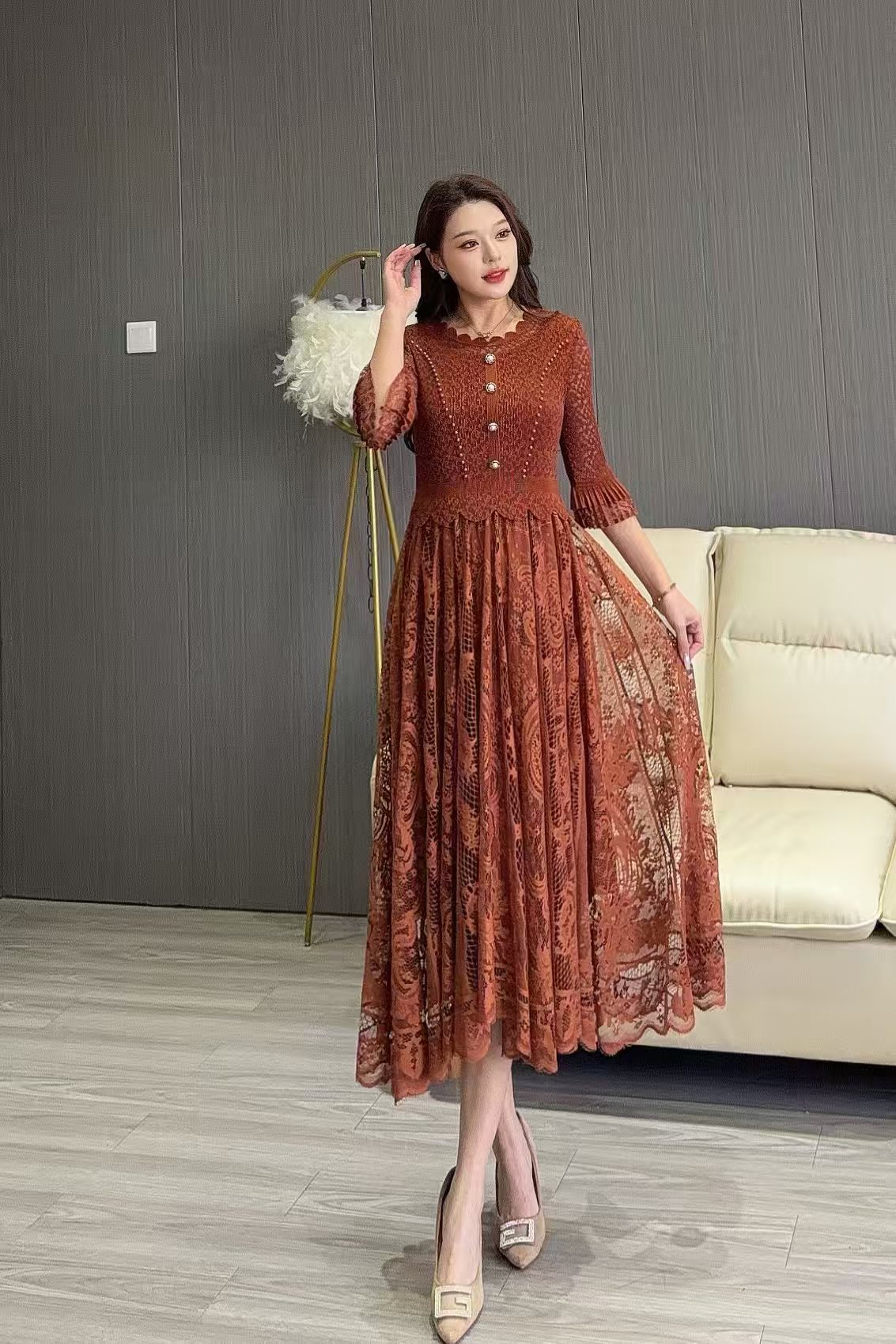 MY15694# 欧洲站新款时尚褶皱圆领拼接修身显瘦连衣裙中长款百褶裙女裝貨源服裝批發