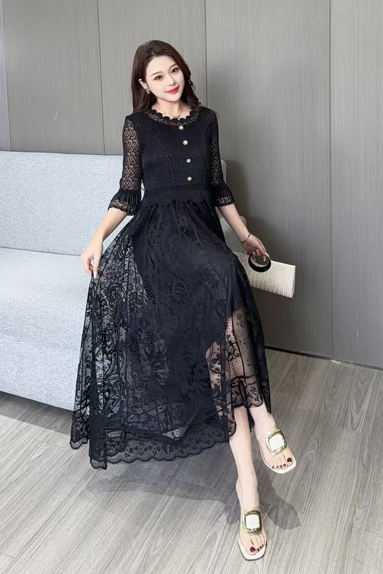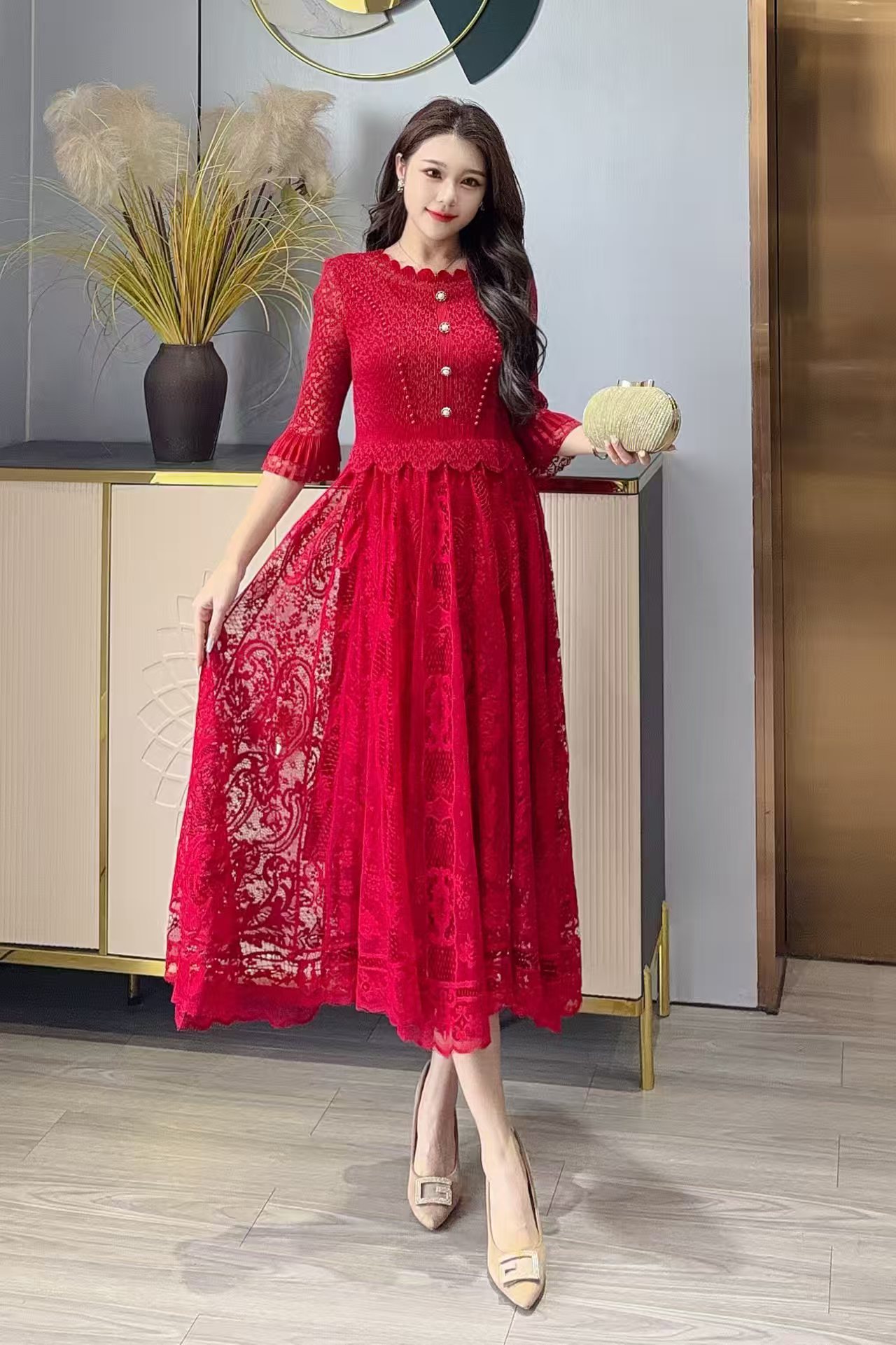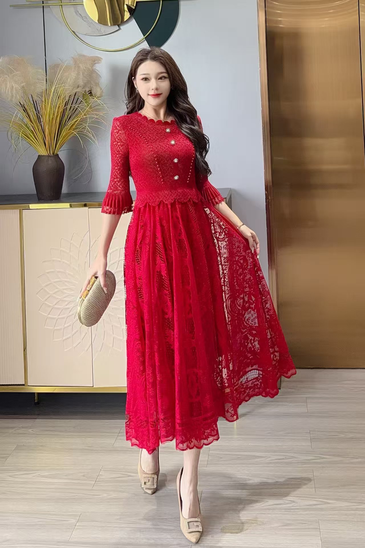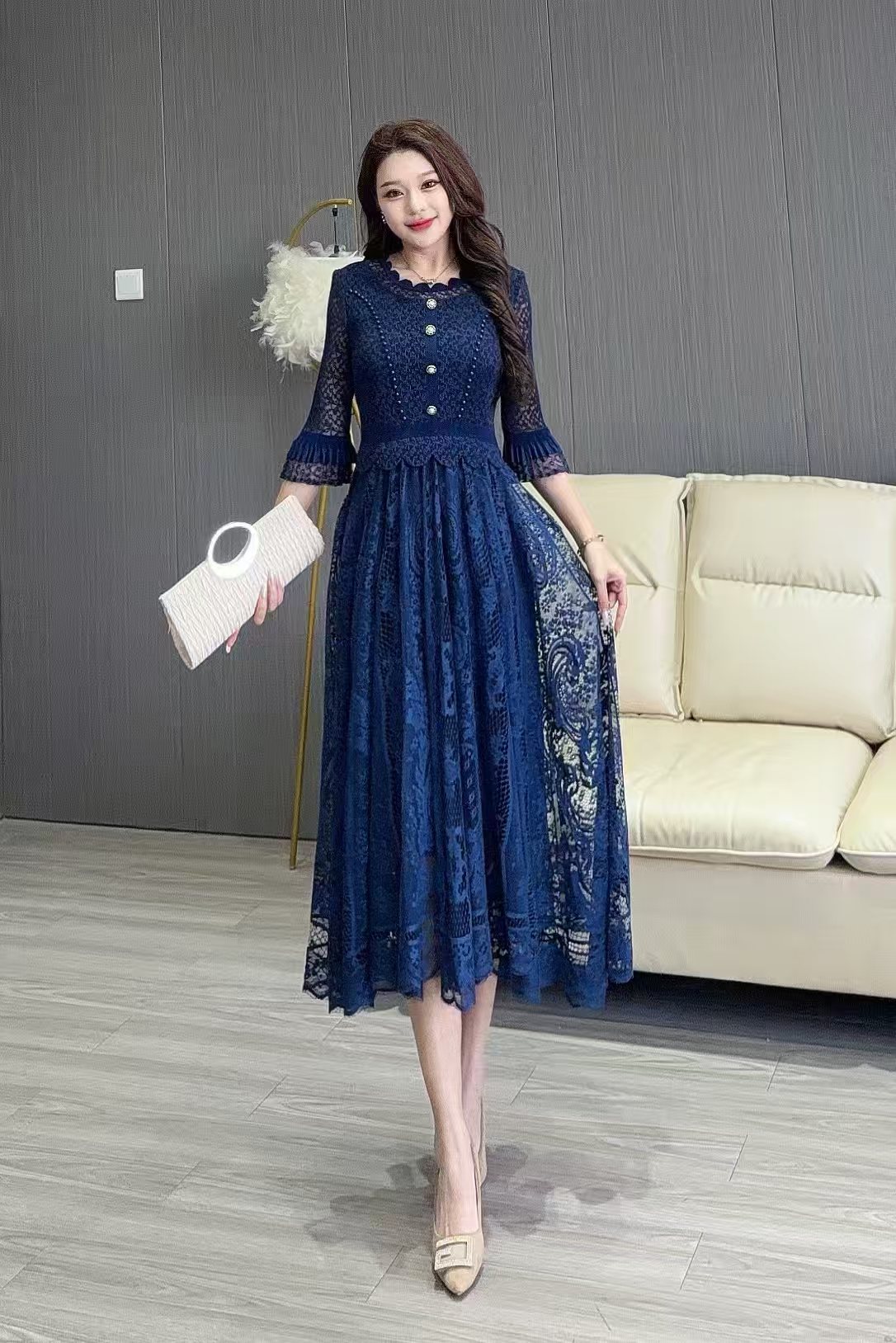 MY15694# 欧洲站新款时尚褶皱圆领拼接修身显瘦连衣裙中长款百褶裙女裝貨源服裝批發