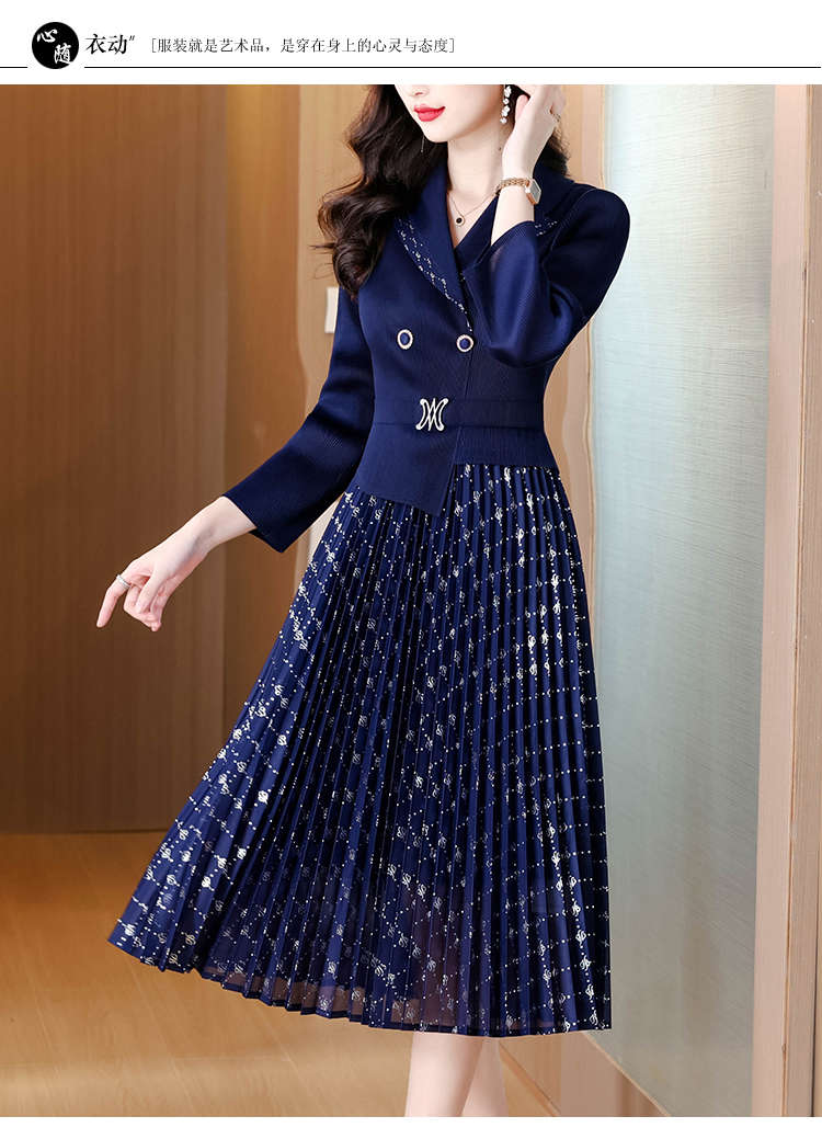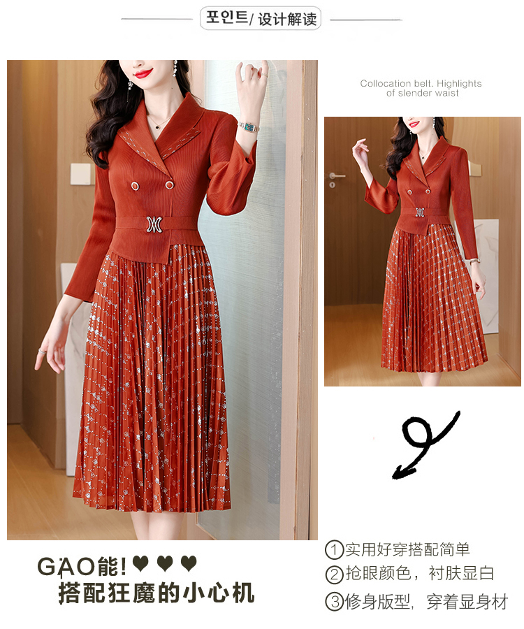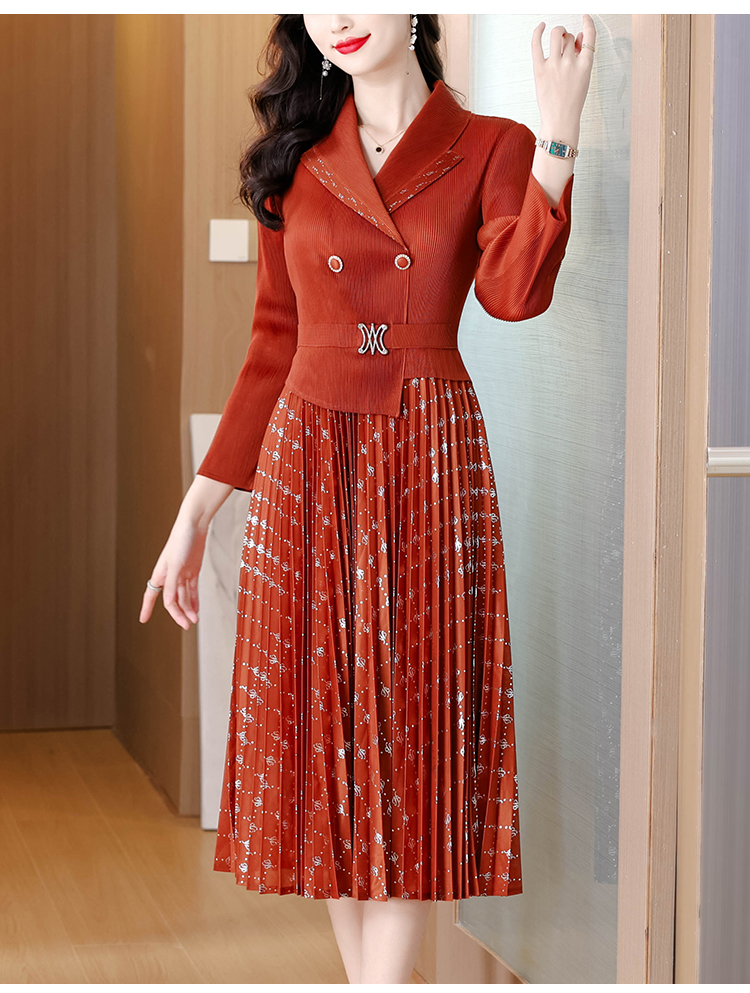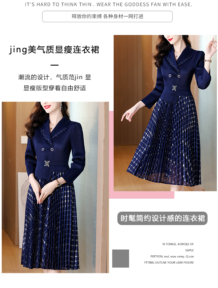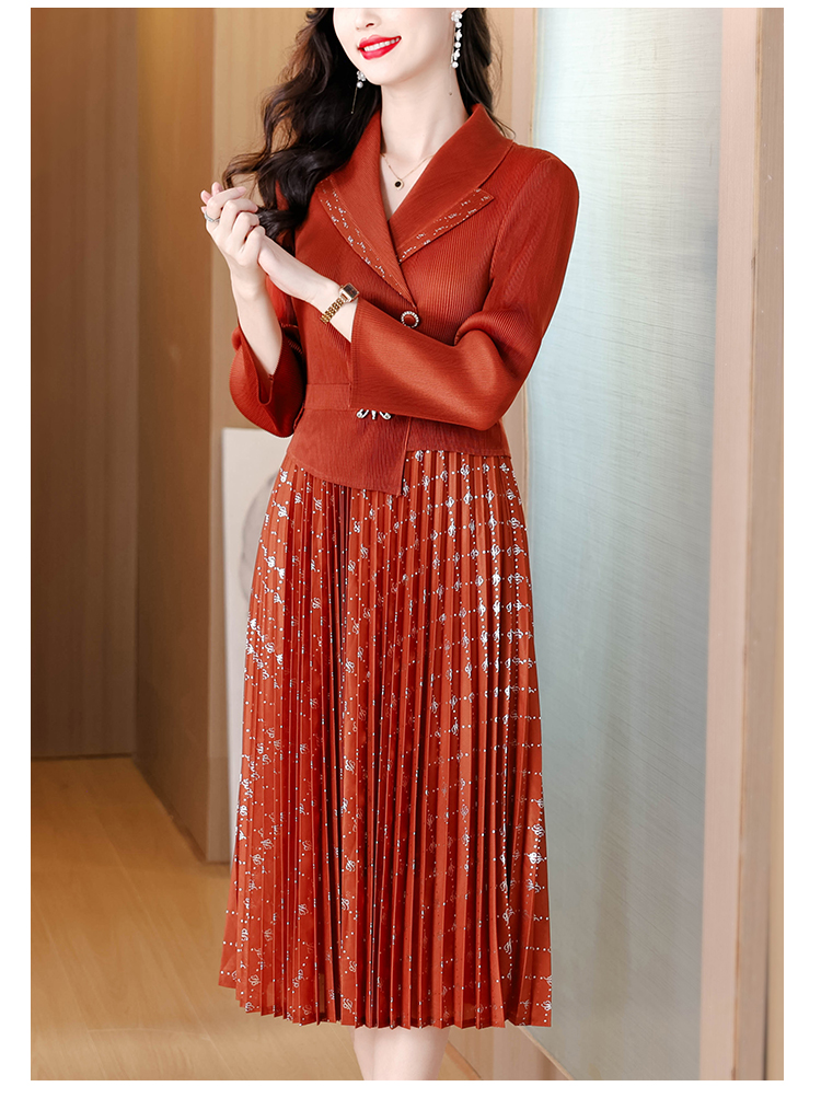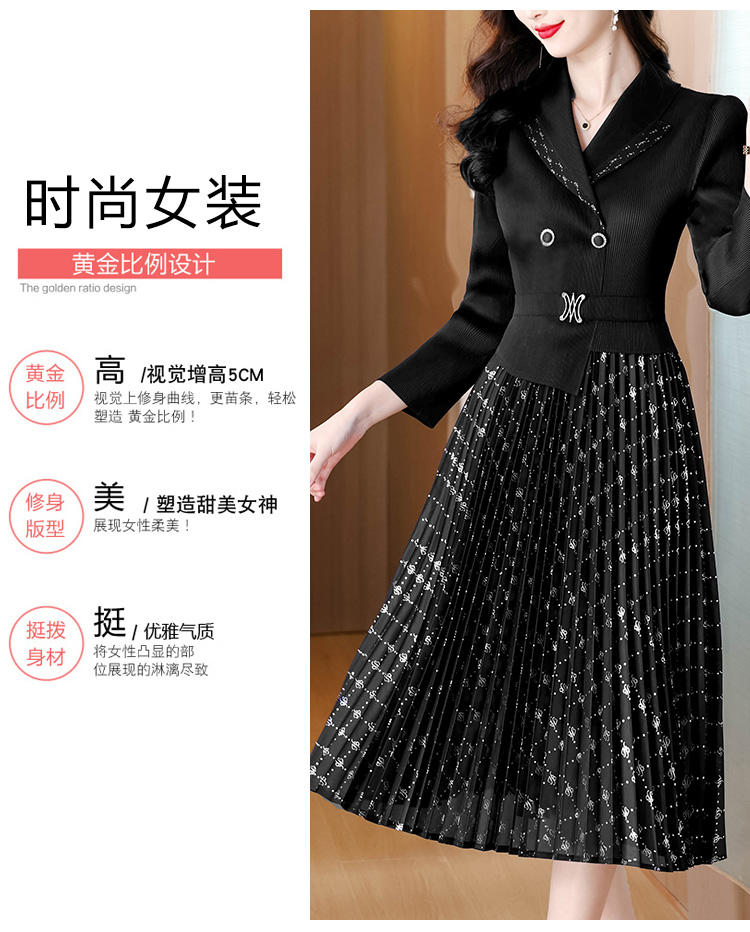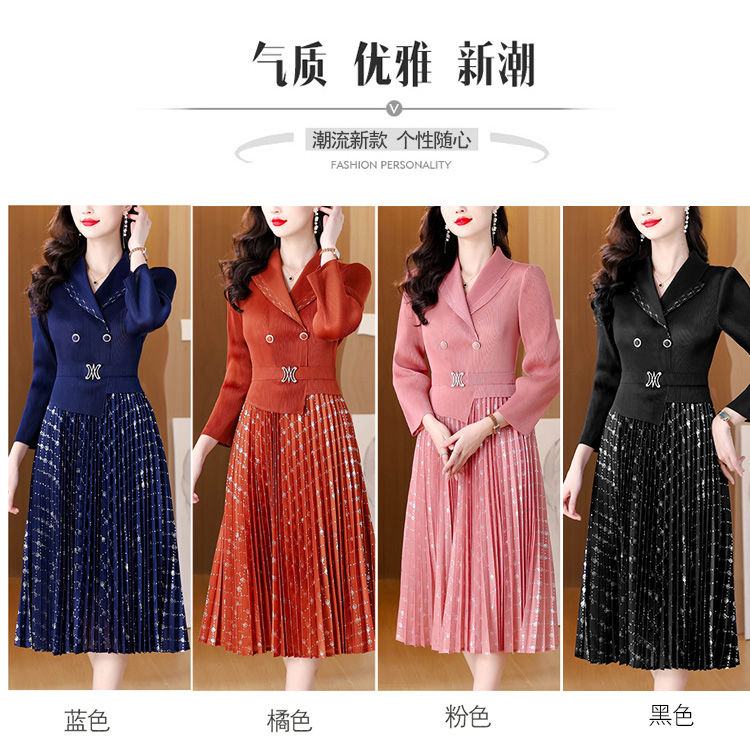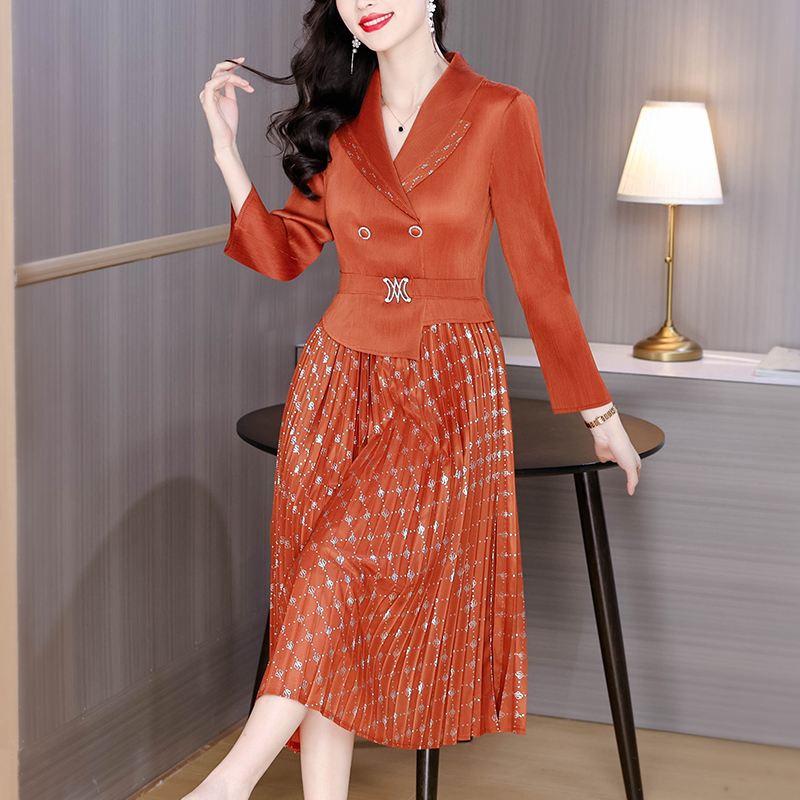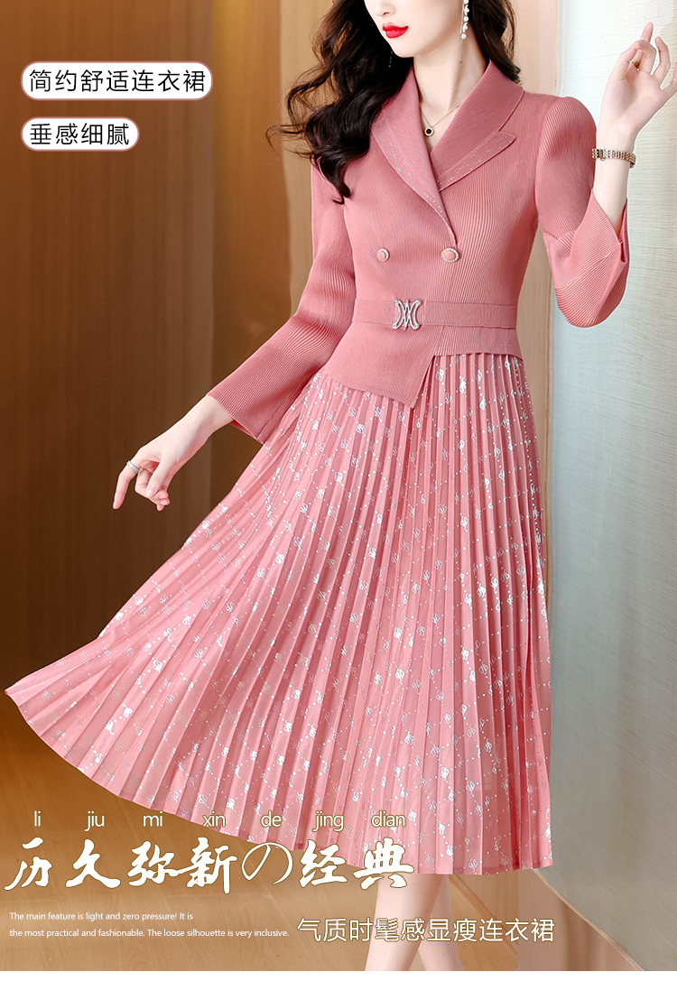MY15704# 三宅褶皱连衣裙新款烫金垂感复古假两件收腰显瘦中长百褶裙女裝貨源服裝批發