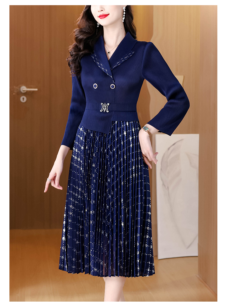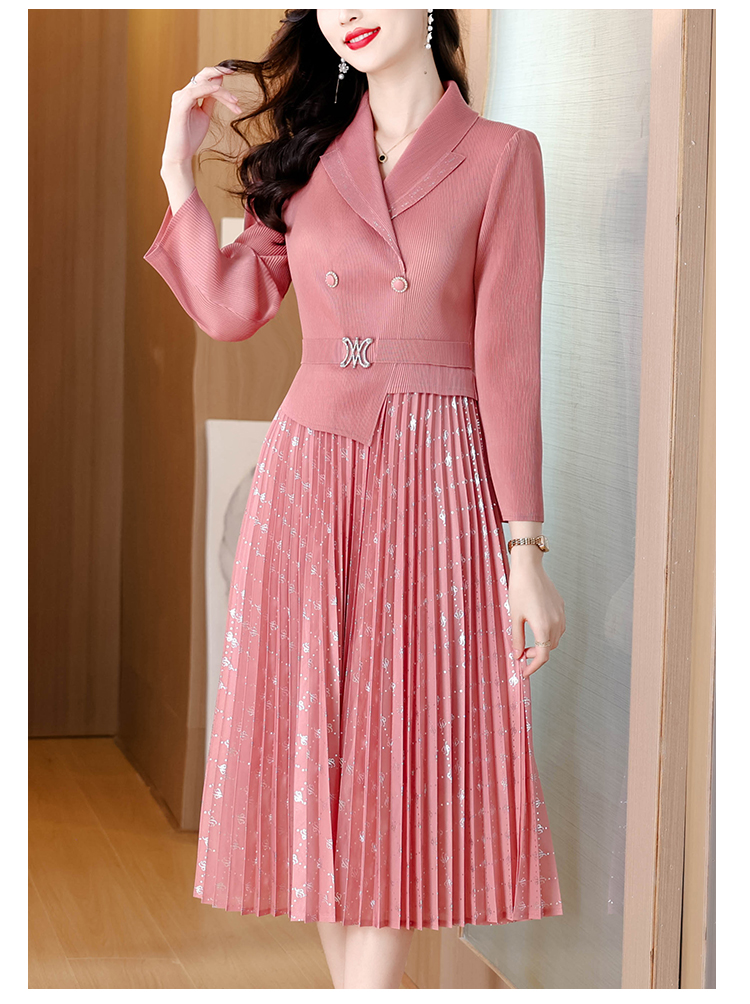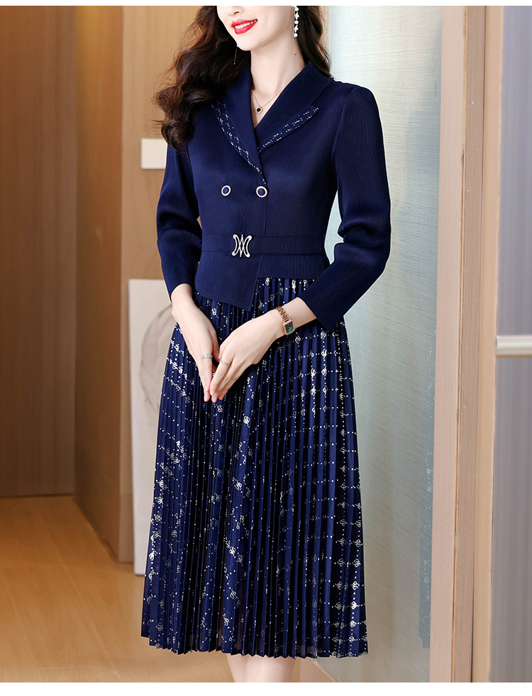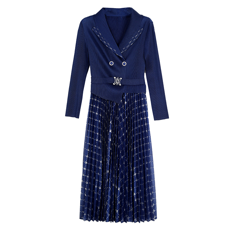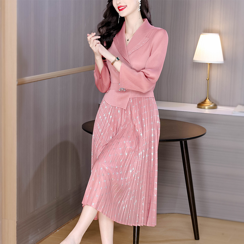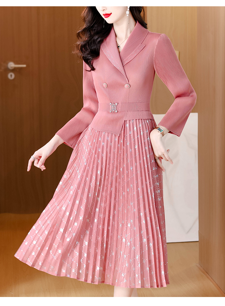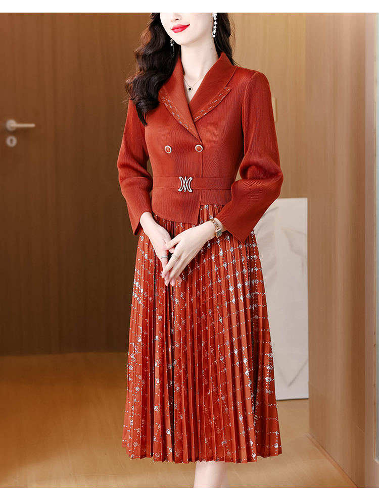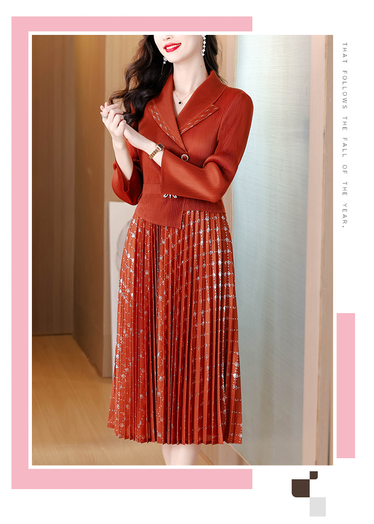 MY15704# 三宅褶皱连衣裙新款烫金垂感复古假两件收腰显瘦中长百褶裙女裝貨源服裝批發