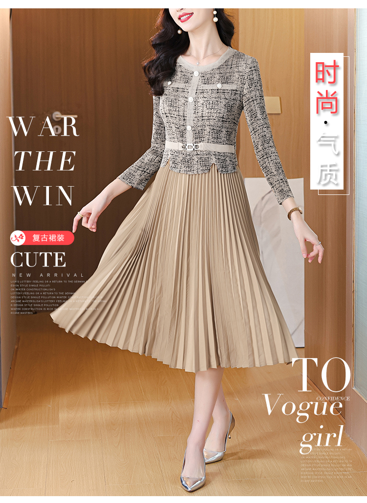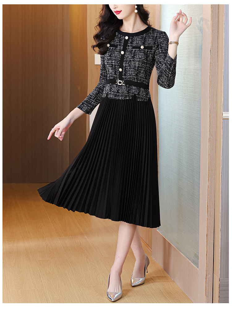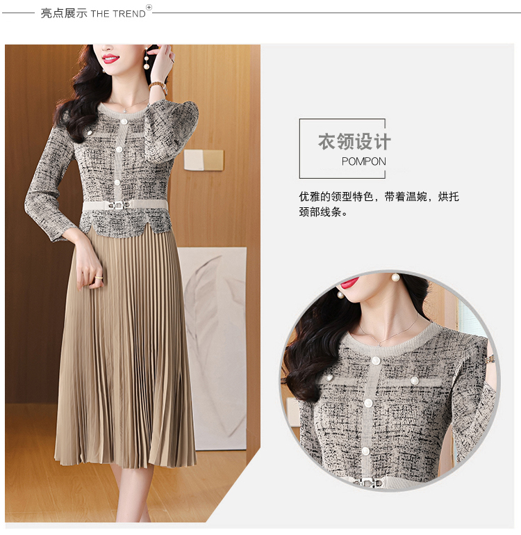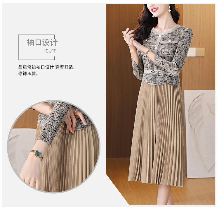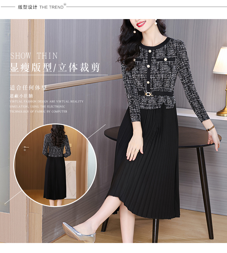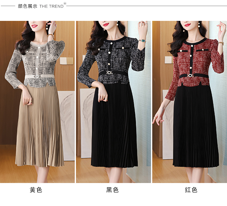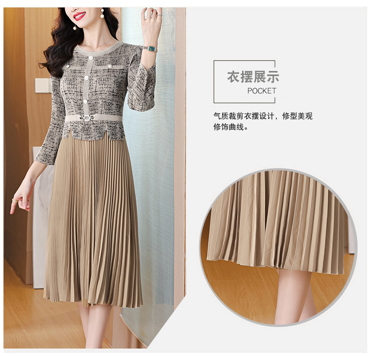 MY15705# 欧洲站新款时尚褶皱圆领拼接修身显瘦连衣裙中长款百褶裙女裝貨源服裝批發
